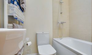 With a double-glazed electric skylight window, spotlights, bath with shower over, WC, wash hand basin, tiled splash backs, and a wall-mounted feature radiator.