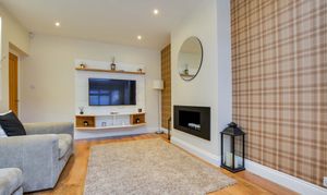 With a double-glazed window to the rear elevation with internal shutters, a double-glazed skylight window with electric opening and electric blind, Karndean flooring, spotlights, a chimney breast with a feature living flame gas fire, a TV point, and a radiator.