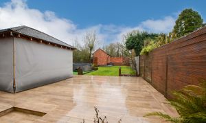 Outside, the rear garden is thoughtfully arranged with patio seating areas, lawn, established borders and an oak pergola. Brick-built workshops with electric roller shutter doors provide further storage or workspace. To the front, a block-paved driveway offers parking for approximately three vehicles, alongside an integral garage with power, lighting and a radiator. The property benefits from gas central heating and double glazing.