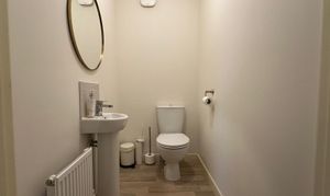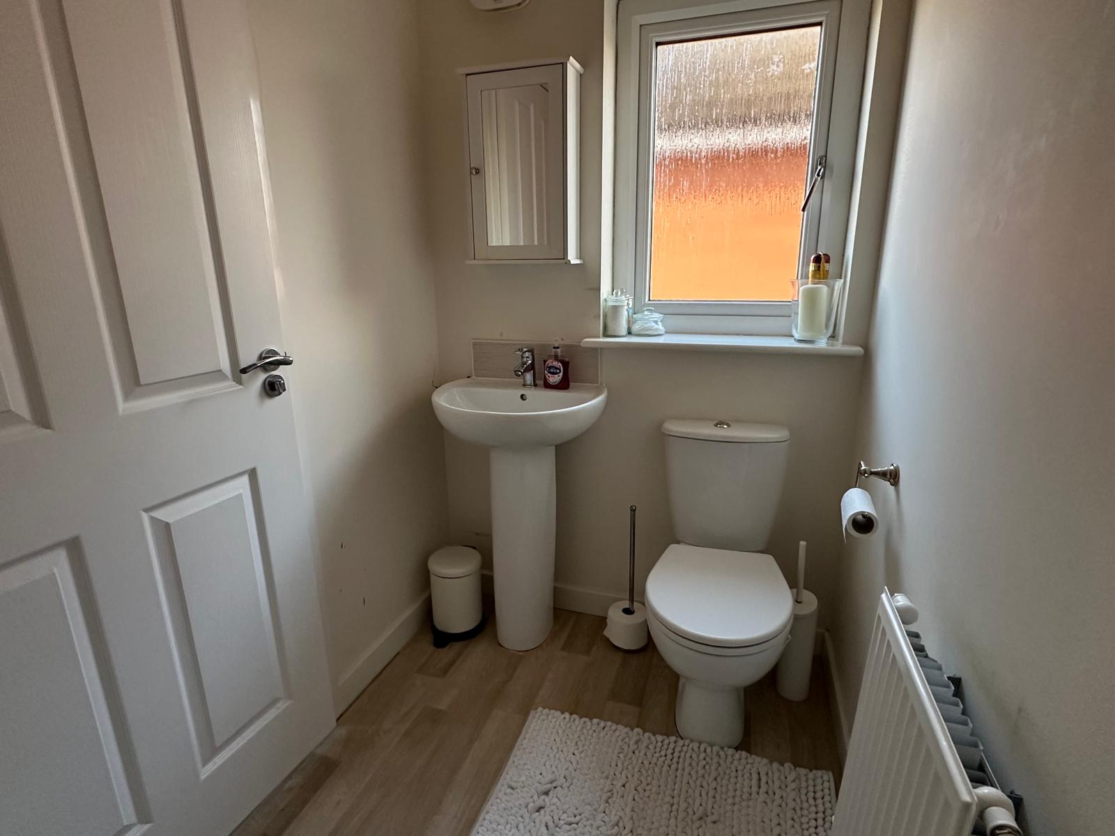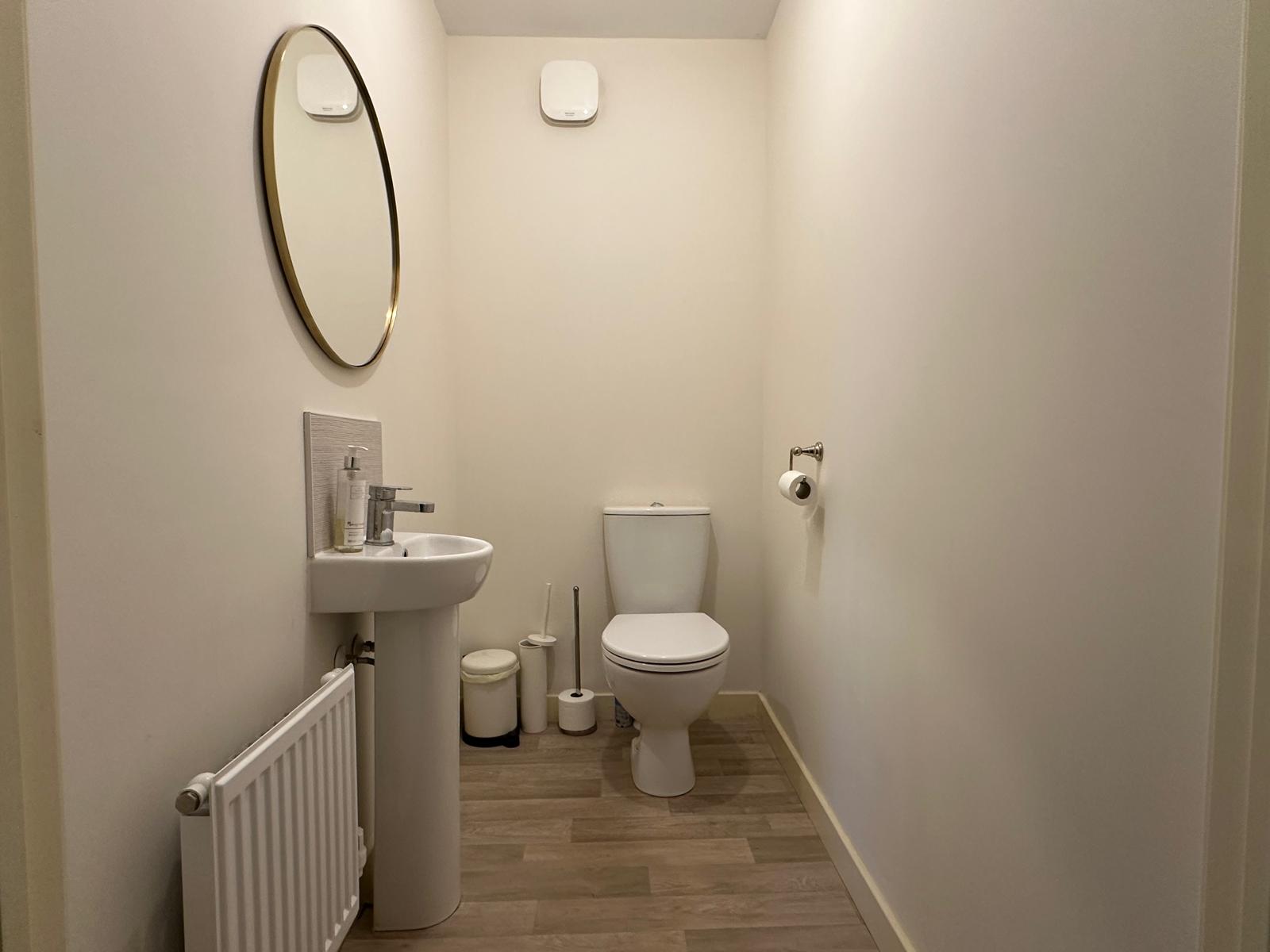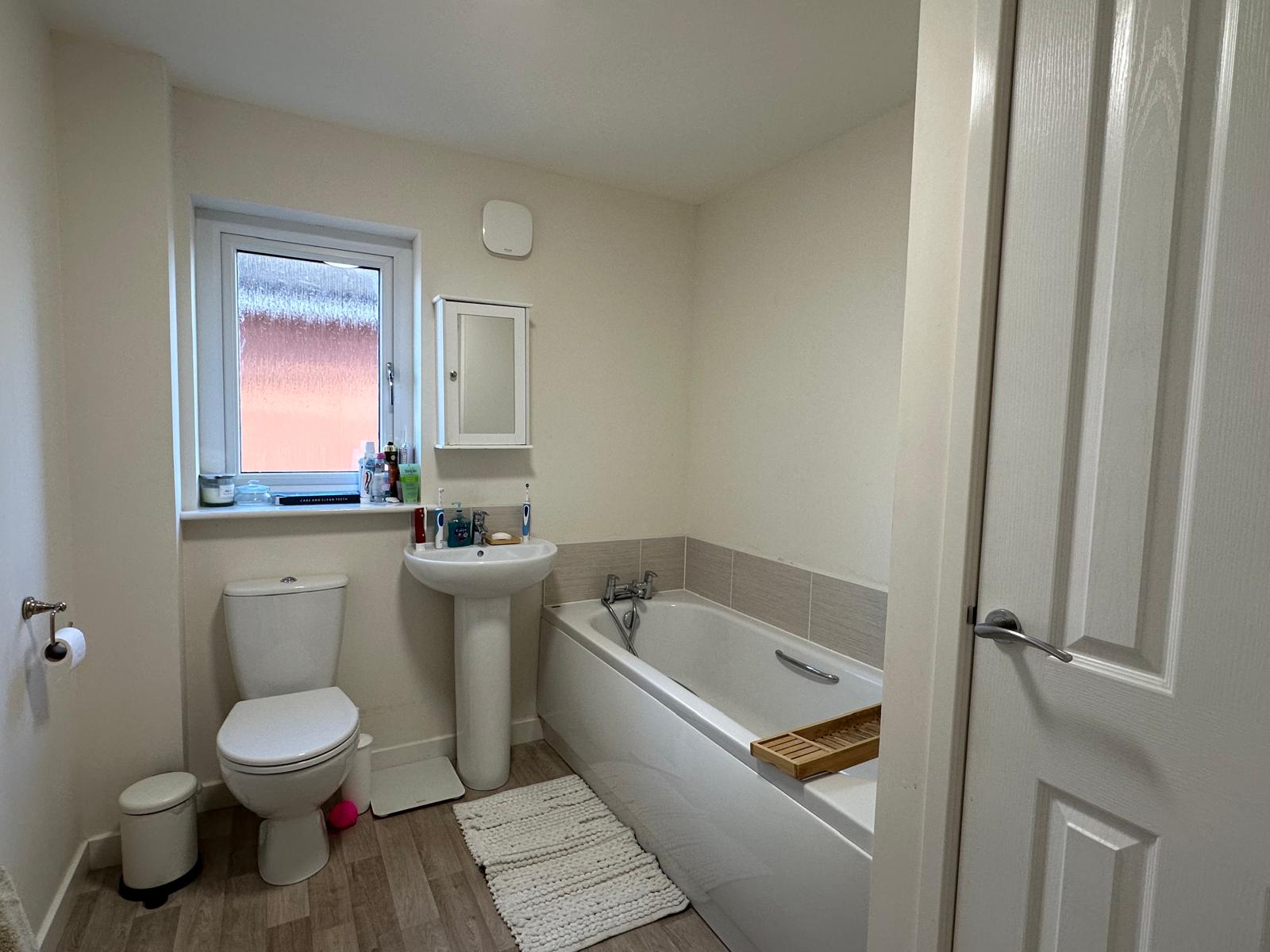 The family bathroom comprises a low-level WC, wash hand basin, and bath, enhanced by laminate flooring and a heated towel rail for comfort and practicality.