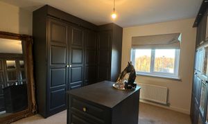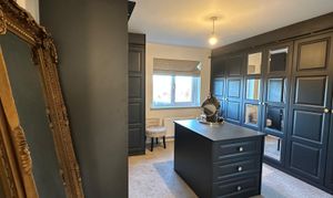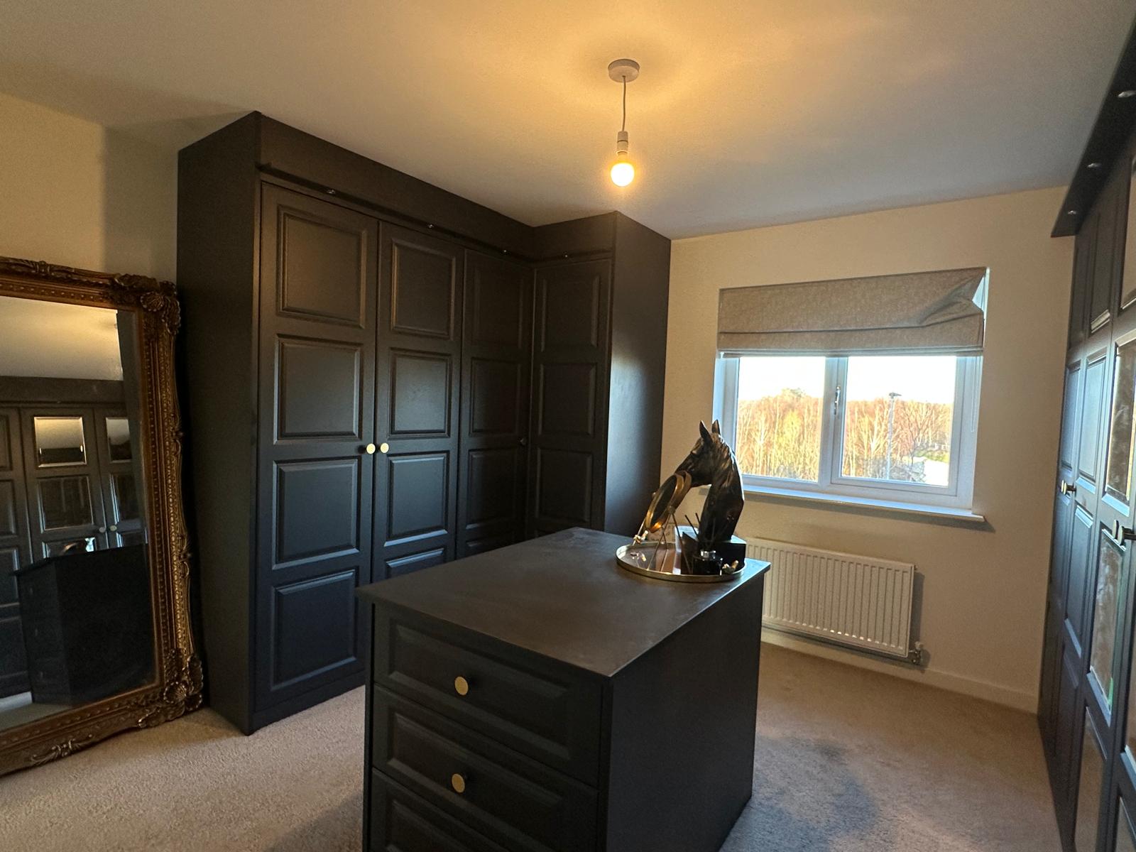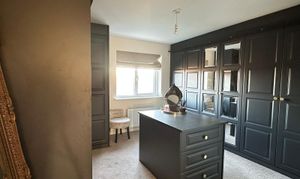The master bedroom, currently utilised as a dressing room, offers copious shelving and hanging facilities, neutral decor, and the added benefit of en suite facilities for additional privacy and convenience.