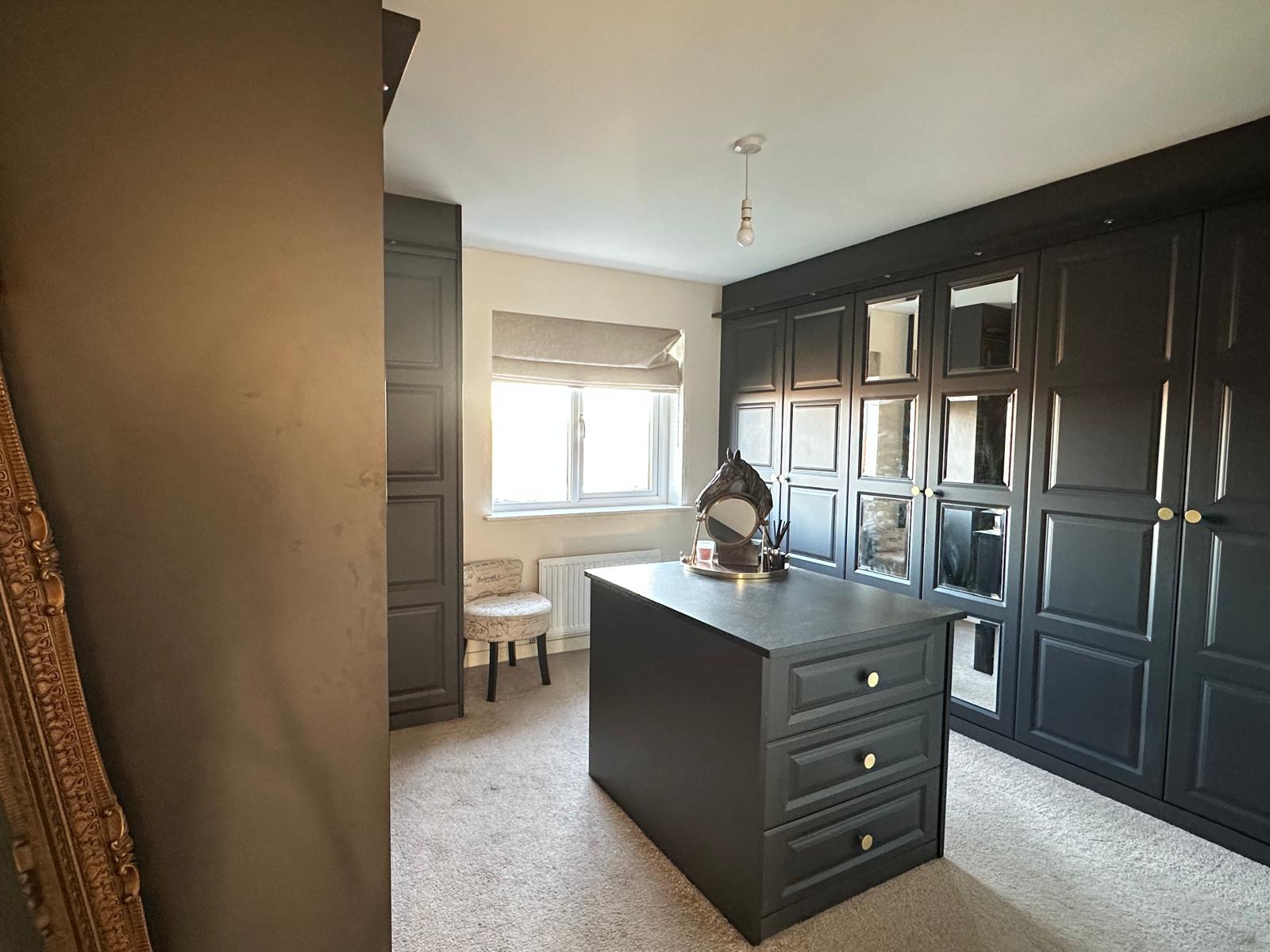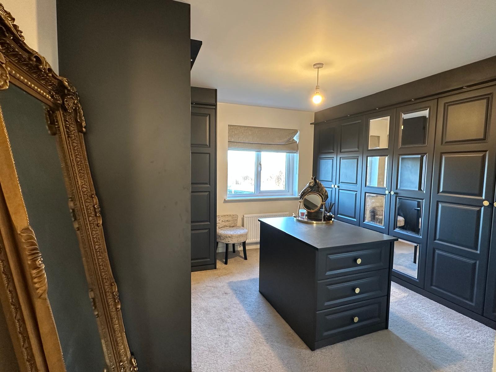 - Master bedroom is currently being used as a dressing room, with copious amounts of shelving and hanging facilities, neutral decor throughout and offering en suite facilities