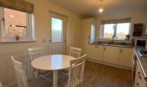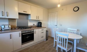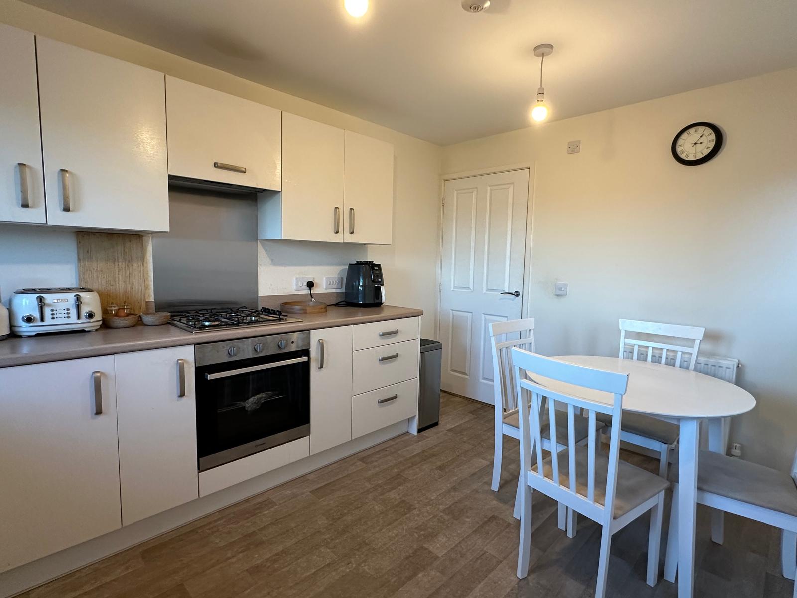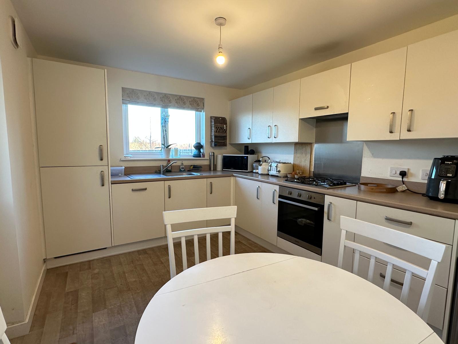 The modern fitted kitchen impresses with a comprehensive range of wall and floor mounted units, complemented by matching wipe-clean surfaces, and ample space for a dining table and chairs, ensuring this area is as functional as it is stylish.