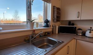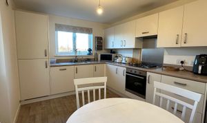 - Modern fitted kitchen offering a spacious array of wall and floor mounted units with matching wipe clean surface, space for dining table and chairs, access to rear garden grounds
