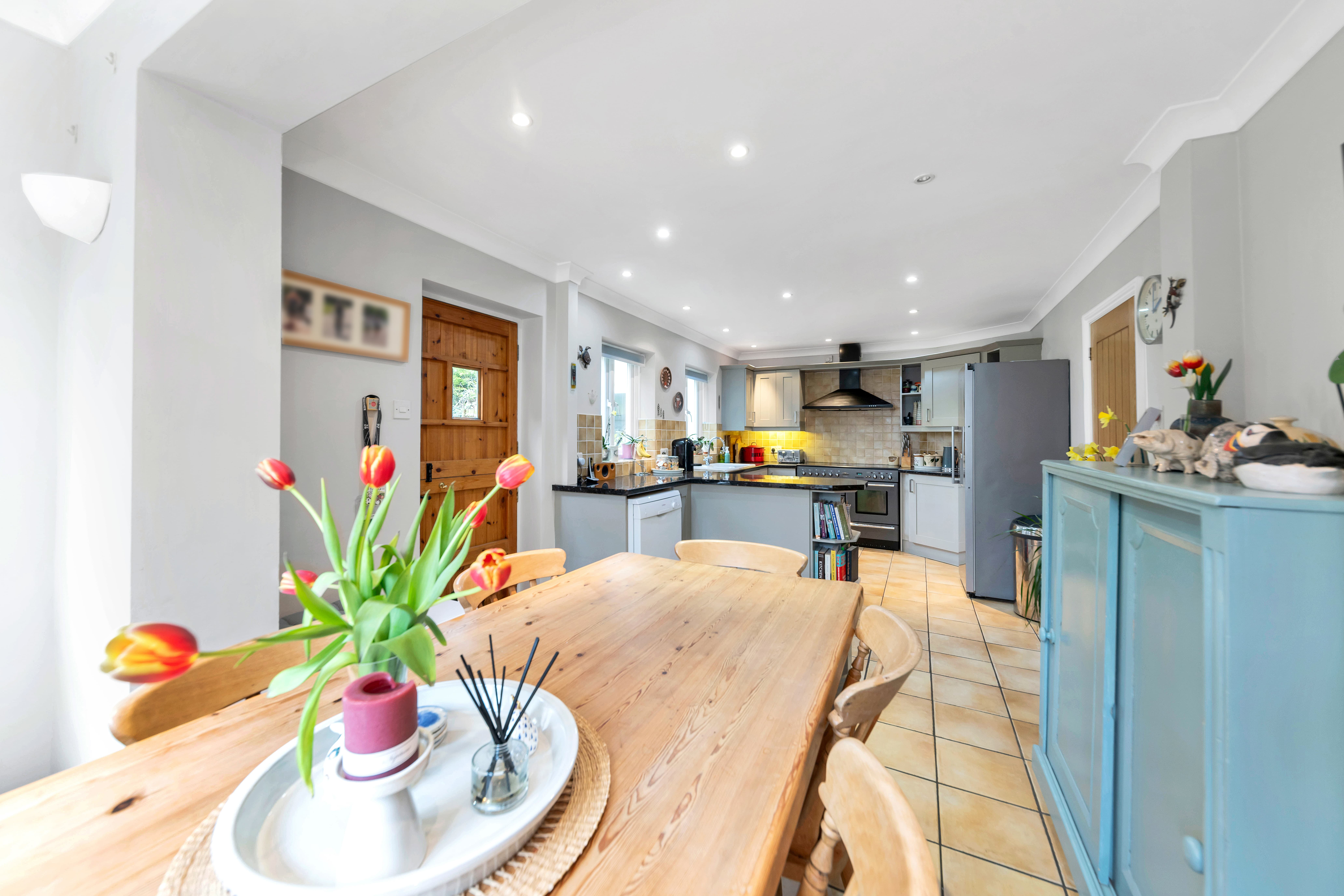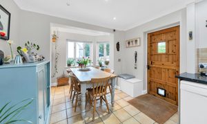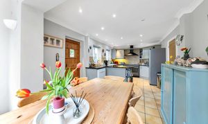 The open-plan kitchen/dining room is spacious and airy, enjoying 4 windows and a door to a dual aspect, a range of modern base and wall units, laminate worktops, a range cooker, tiled flooring and splashbacks, inset and under-cabinet lighting, an extractor hood, and space for a fridge/freezer, dishwasher, large dining setting, storage furniture and other small kitchen appliances. The utility room provides further excellent storage, a window to a front aspect, and space for large laundry appliances.