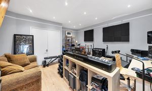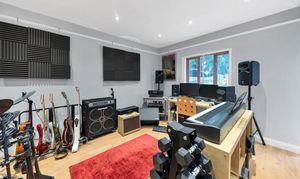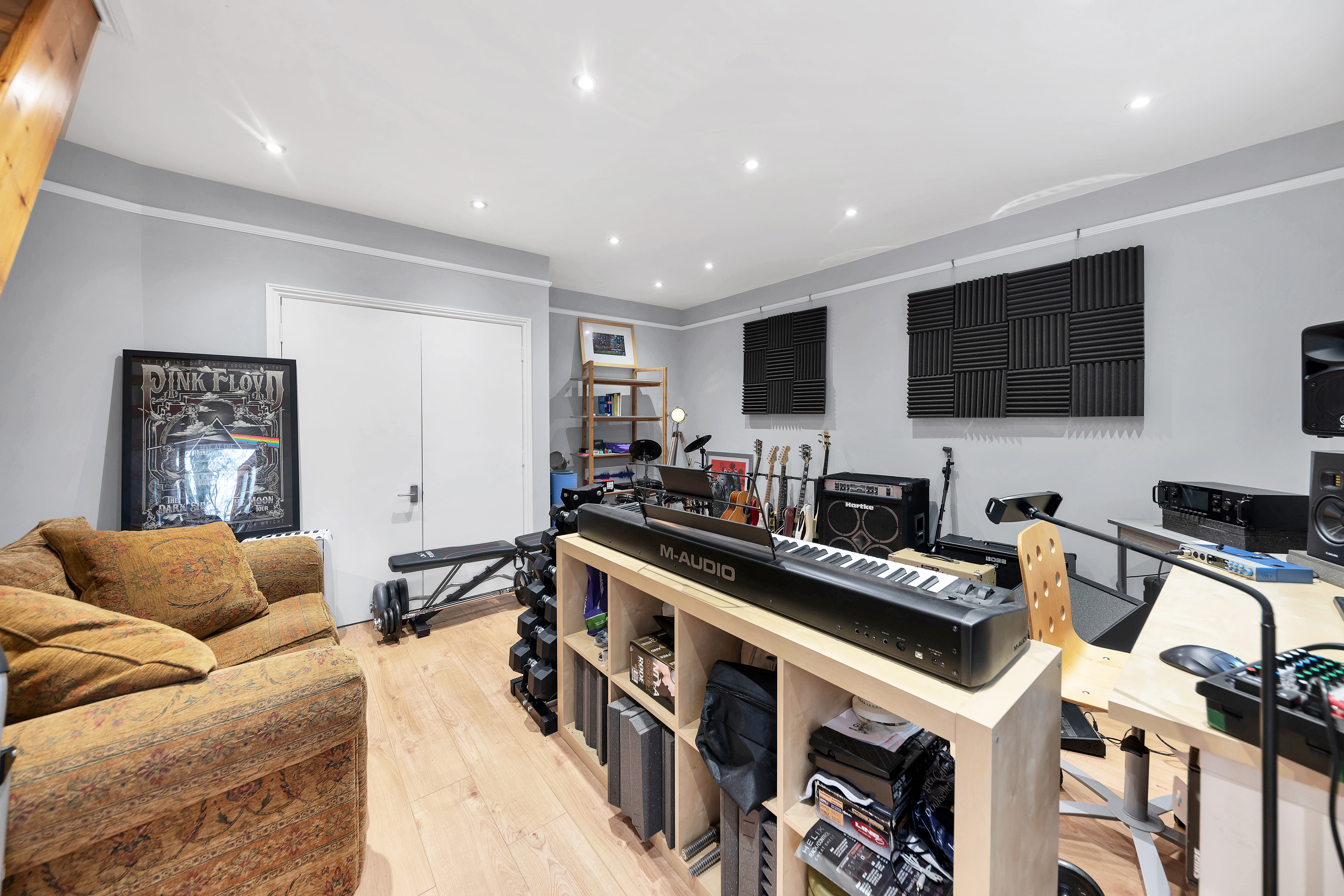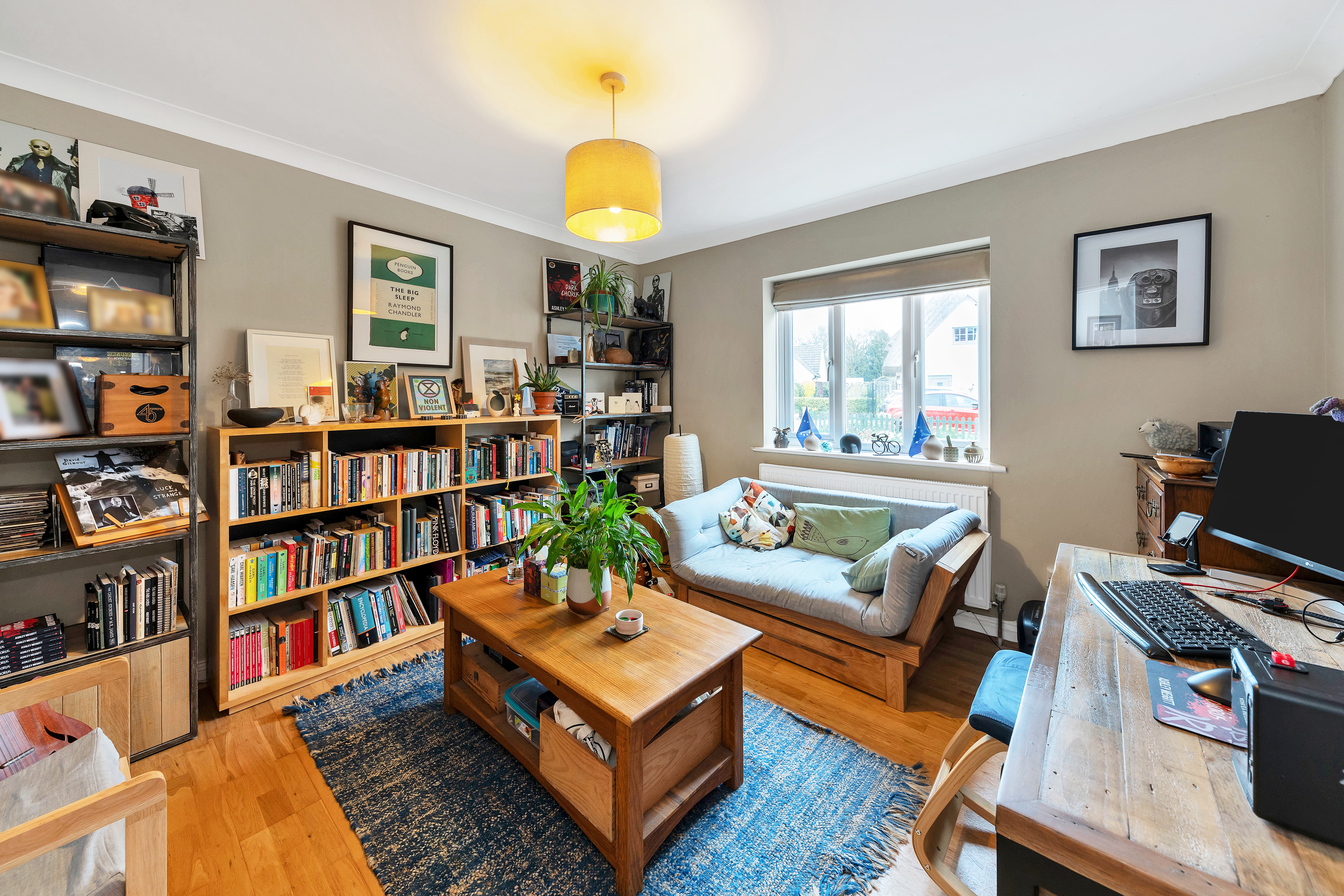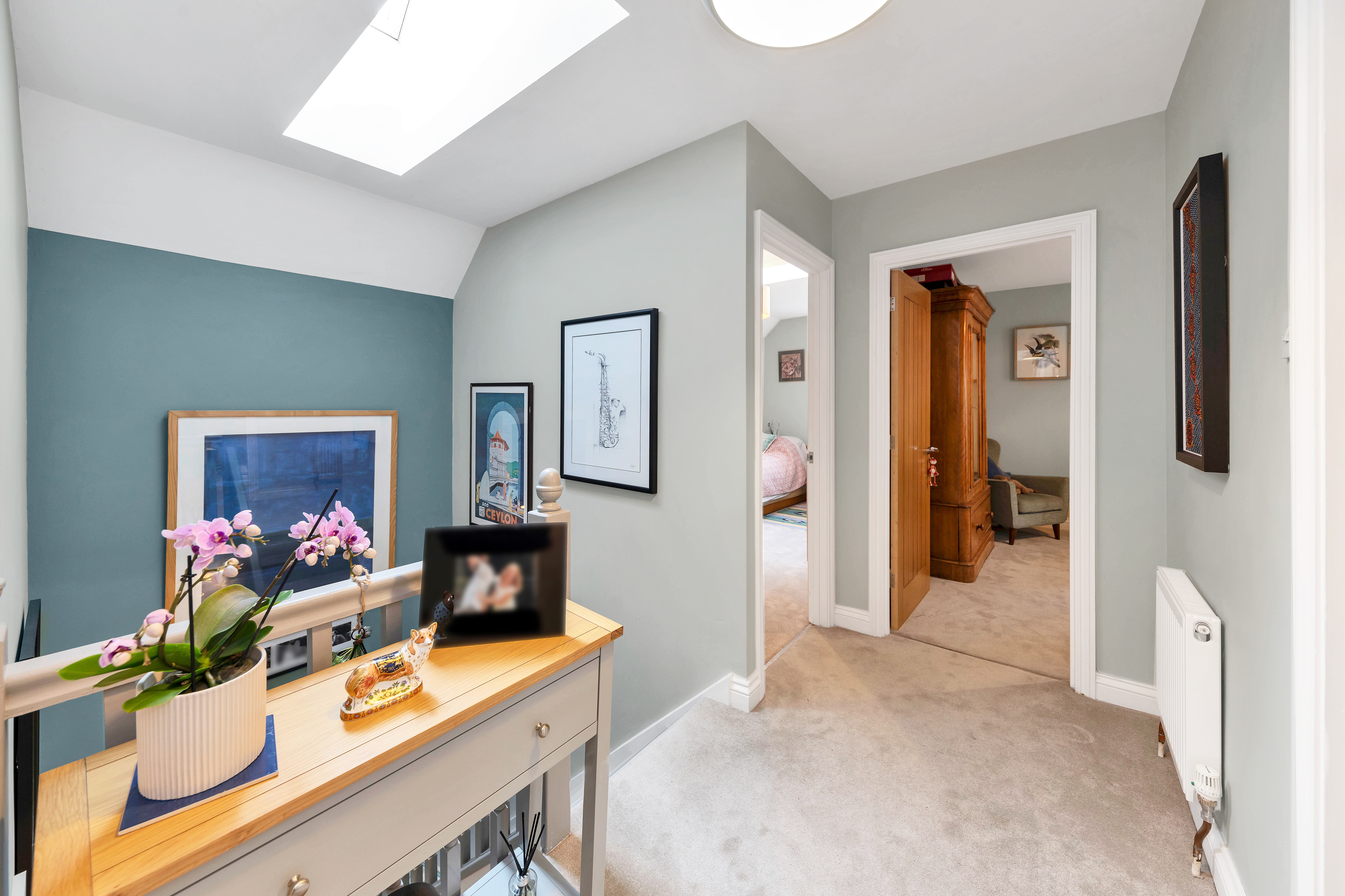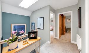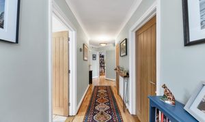 This beautiful property enjoys excellent kerb appeal, with an attractive frontage, borders and beds of shrubs, and a large driveway with off-road parking. There is also access to a large studio with a storage room above. Upon stepping inside, the entrance hallway is bright and welcoming, with attractive wood flooring, neutral decor, pendant lighting, stairs to the first floor, and doors through to the downstairs living space, including a large study and a cloakroom WC.