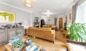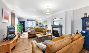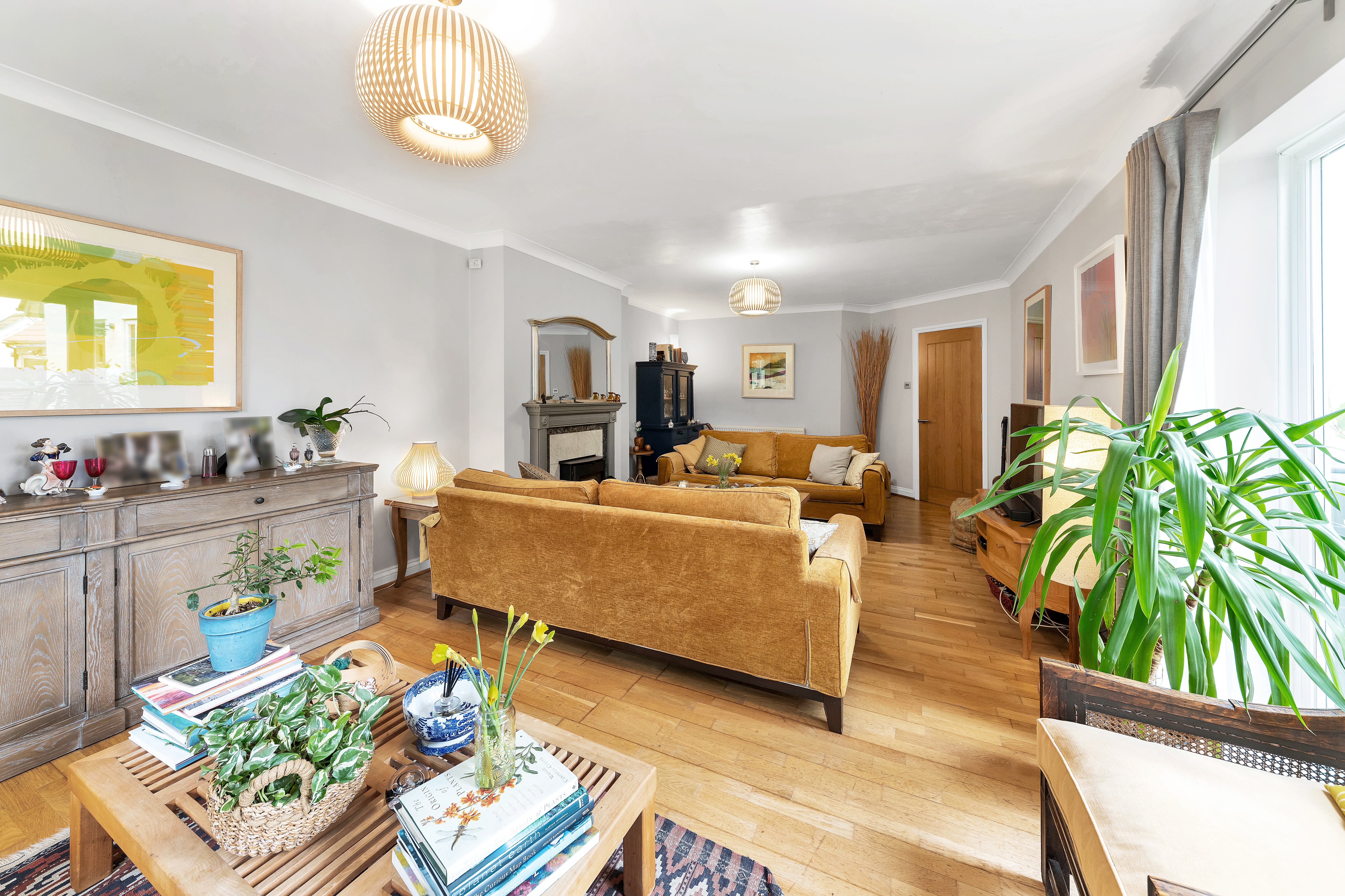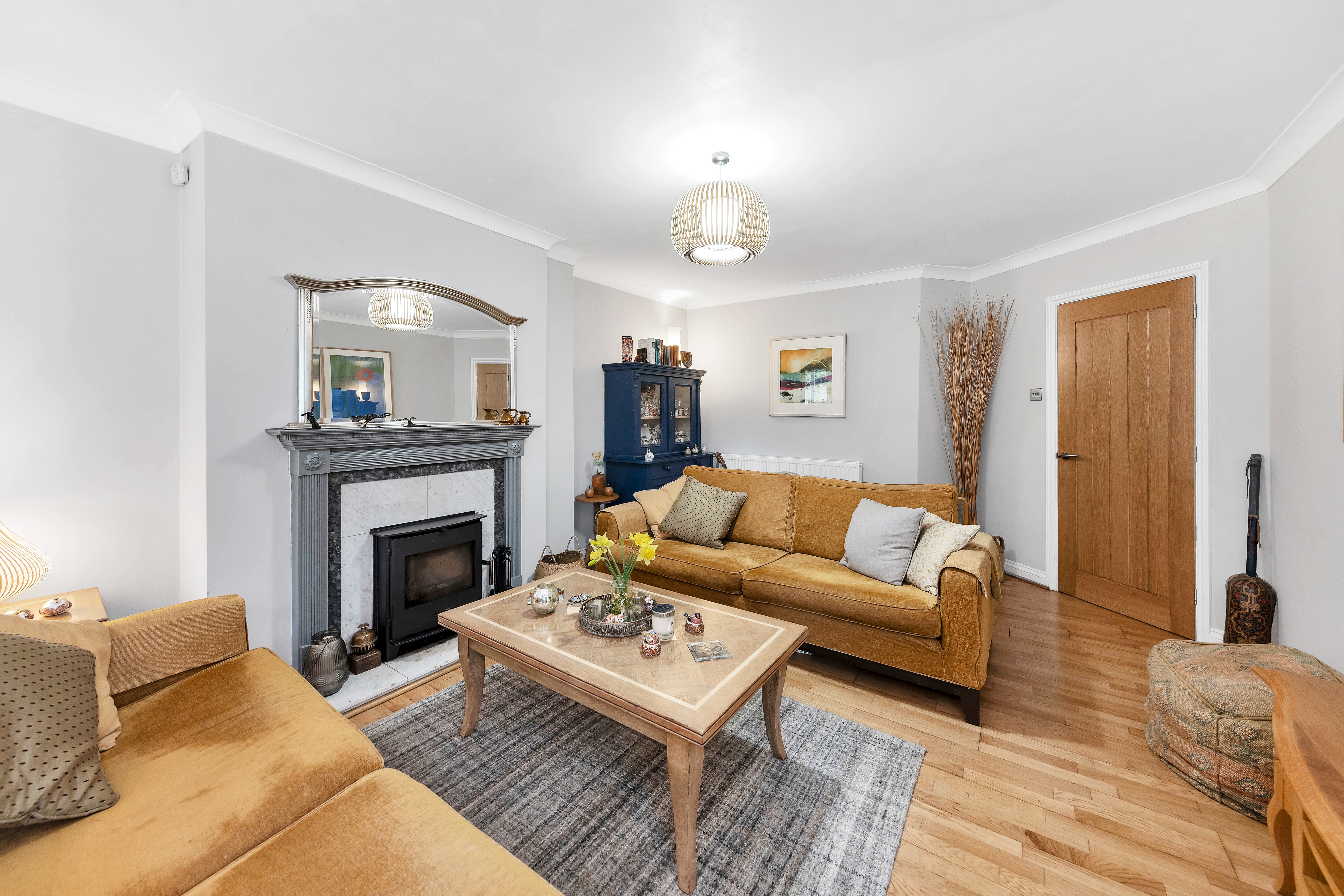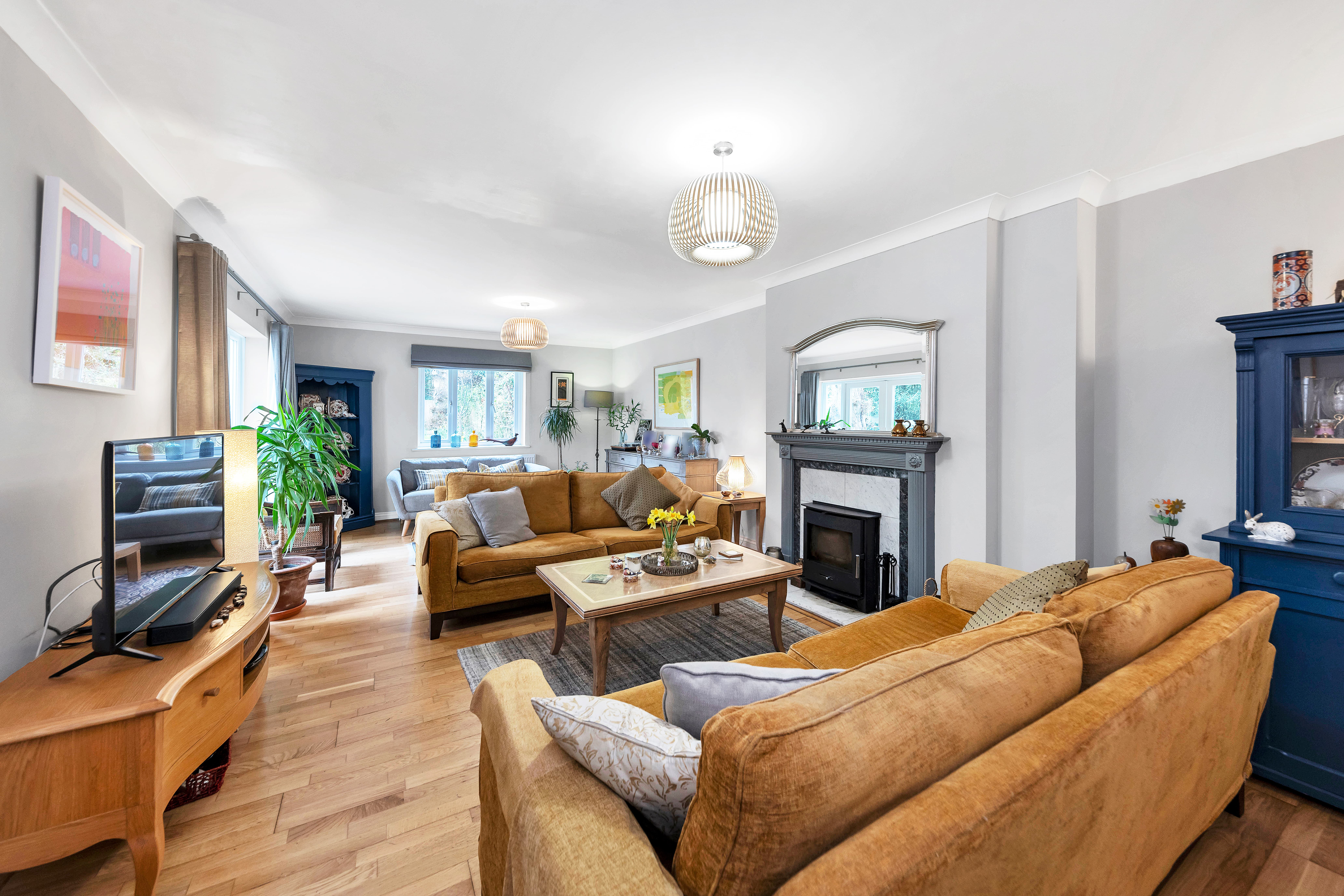 The large lounge is equally a bright and comfortable space, enjoying a fireplace with a wood-burning stove, lovely neutral decor, wood flooring, pendant lighting, windows and double French doors to a dual garden aspect, and ample space for a variety of lounge and storage furniture.