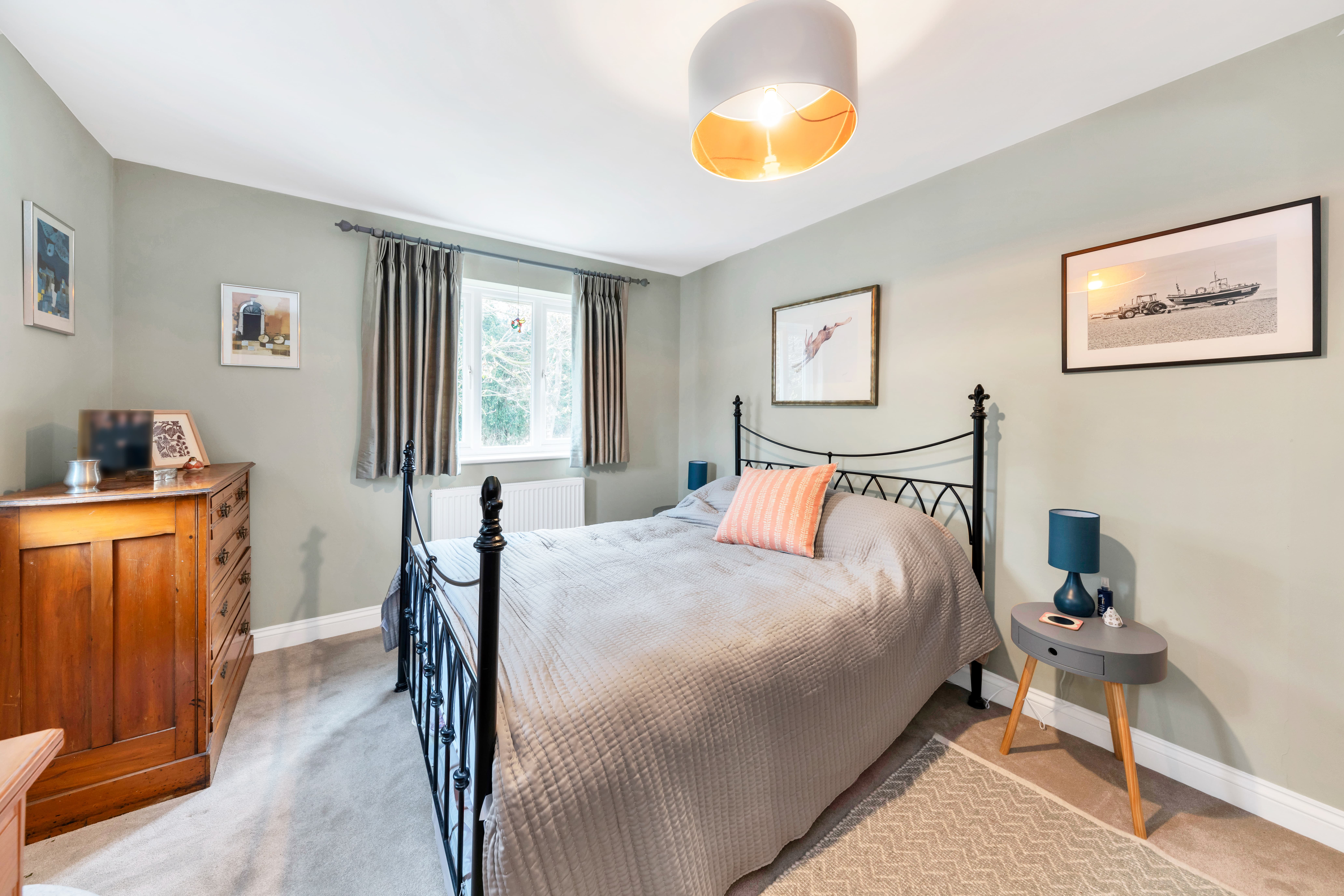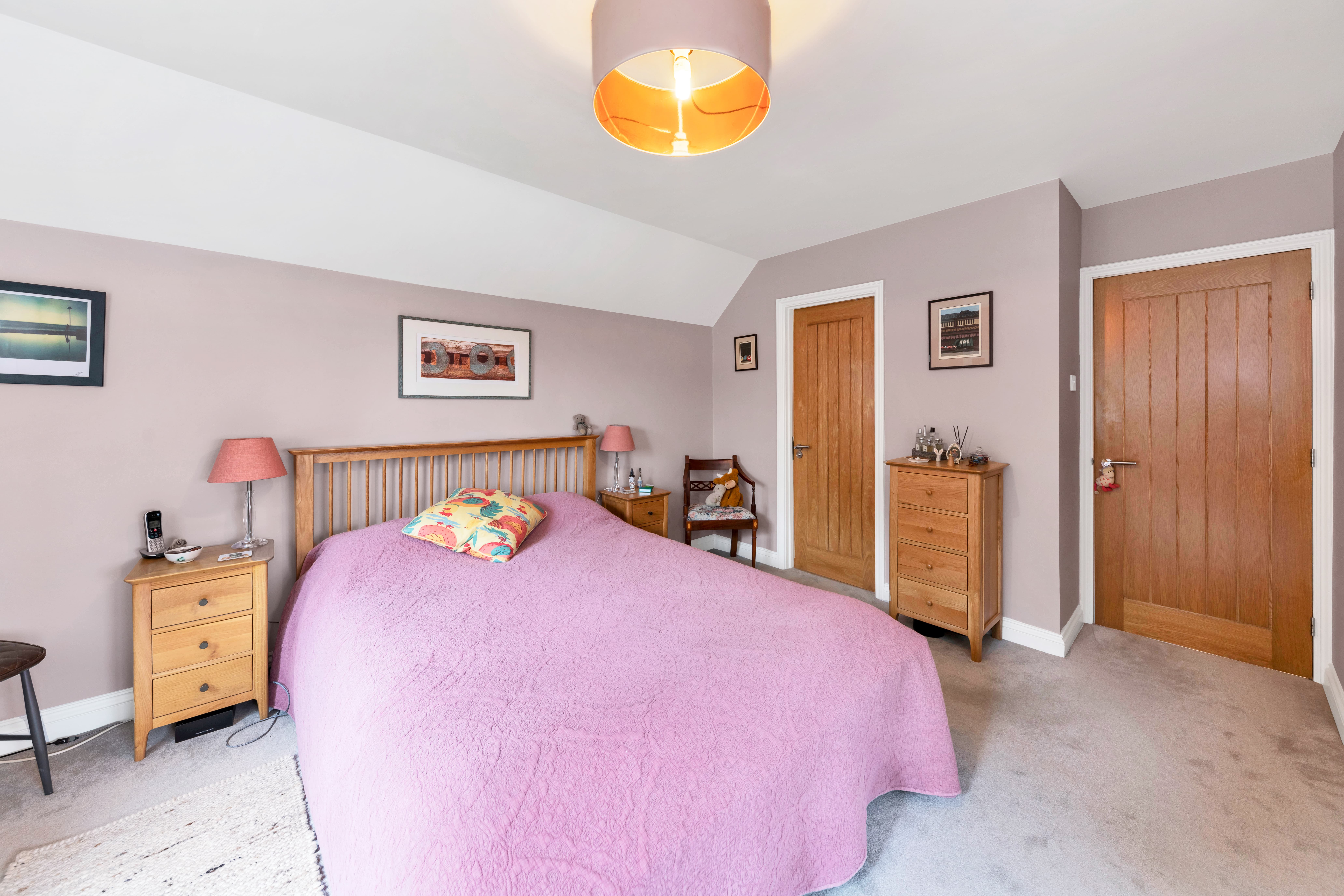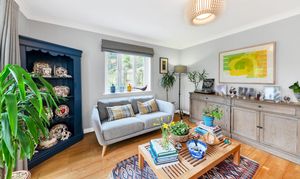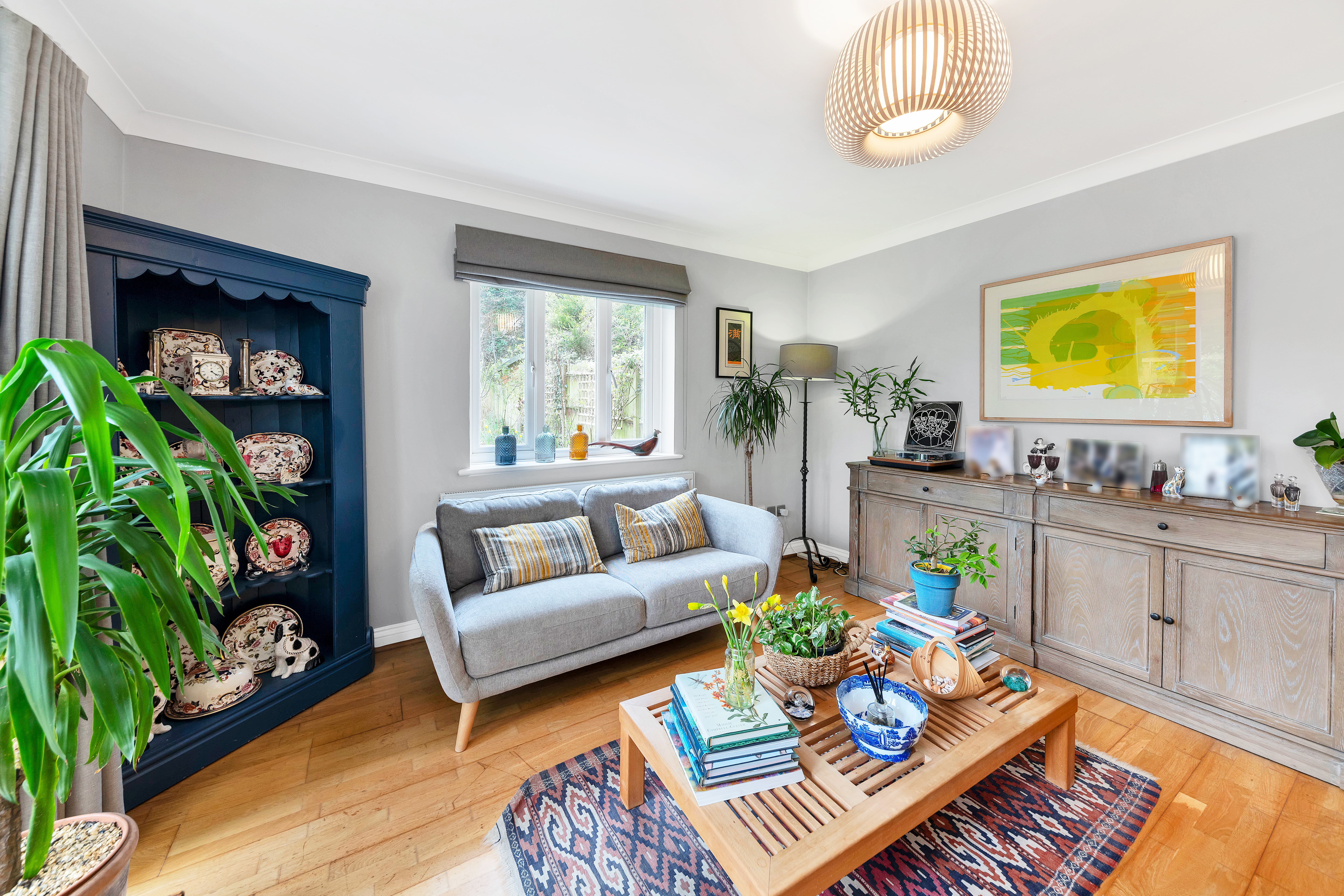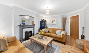 The large lounge is equally a bright and comfortable space, enjoying a fireplace with a wood-burning stove, lovely neutral decor, wood flooring, pendant lighting, windows and double French doors to a dual garden aspect, and ample space for a variety of lounge and storage furniture.