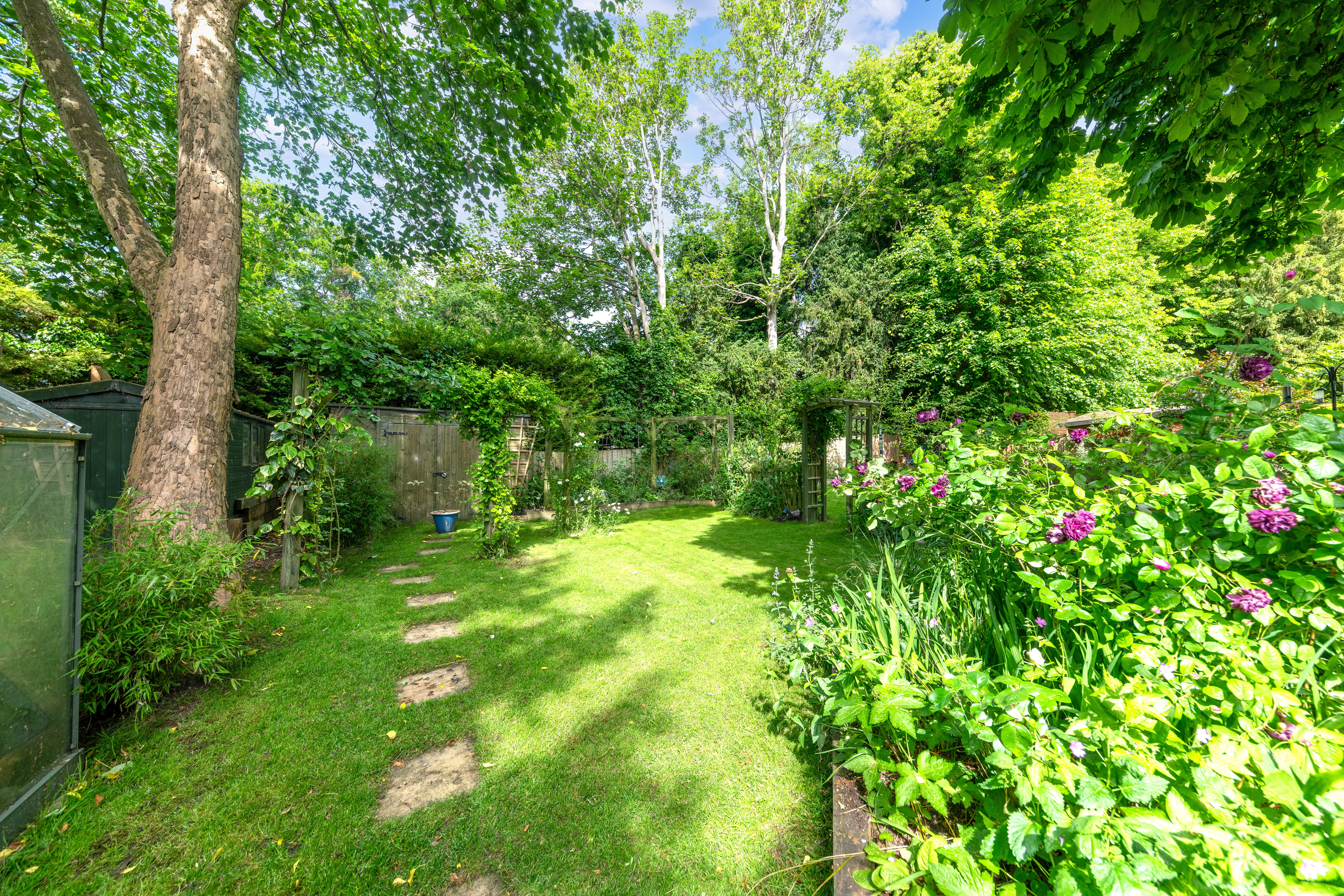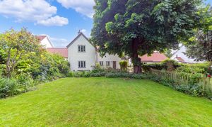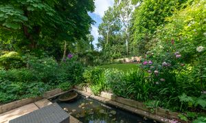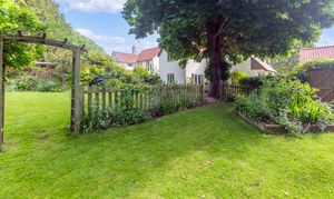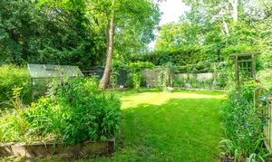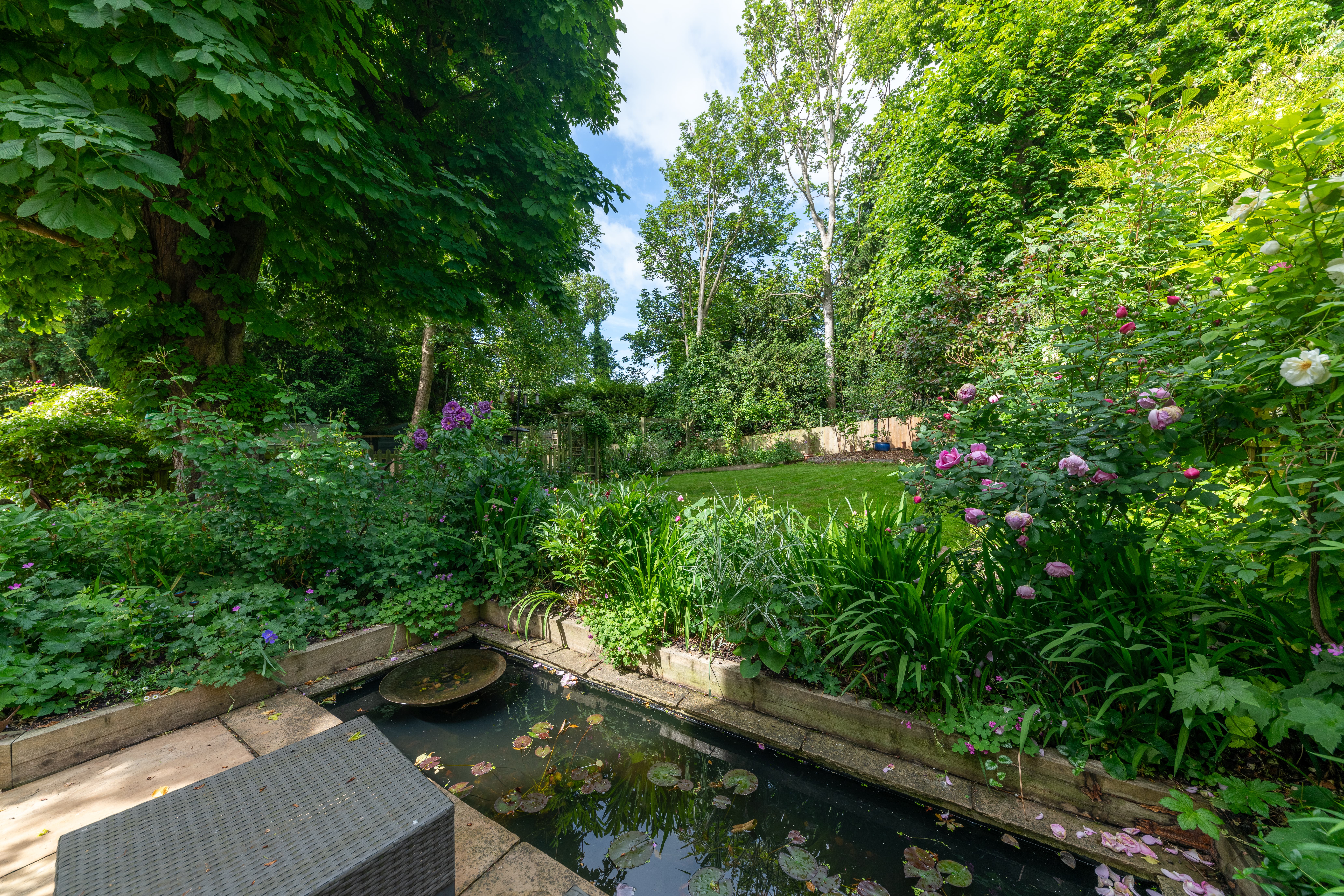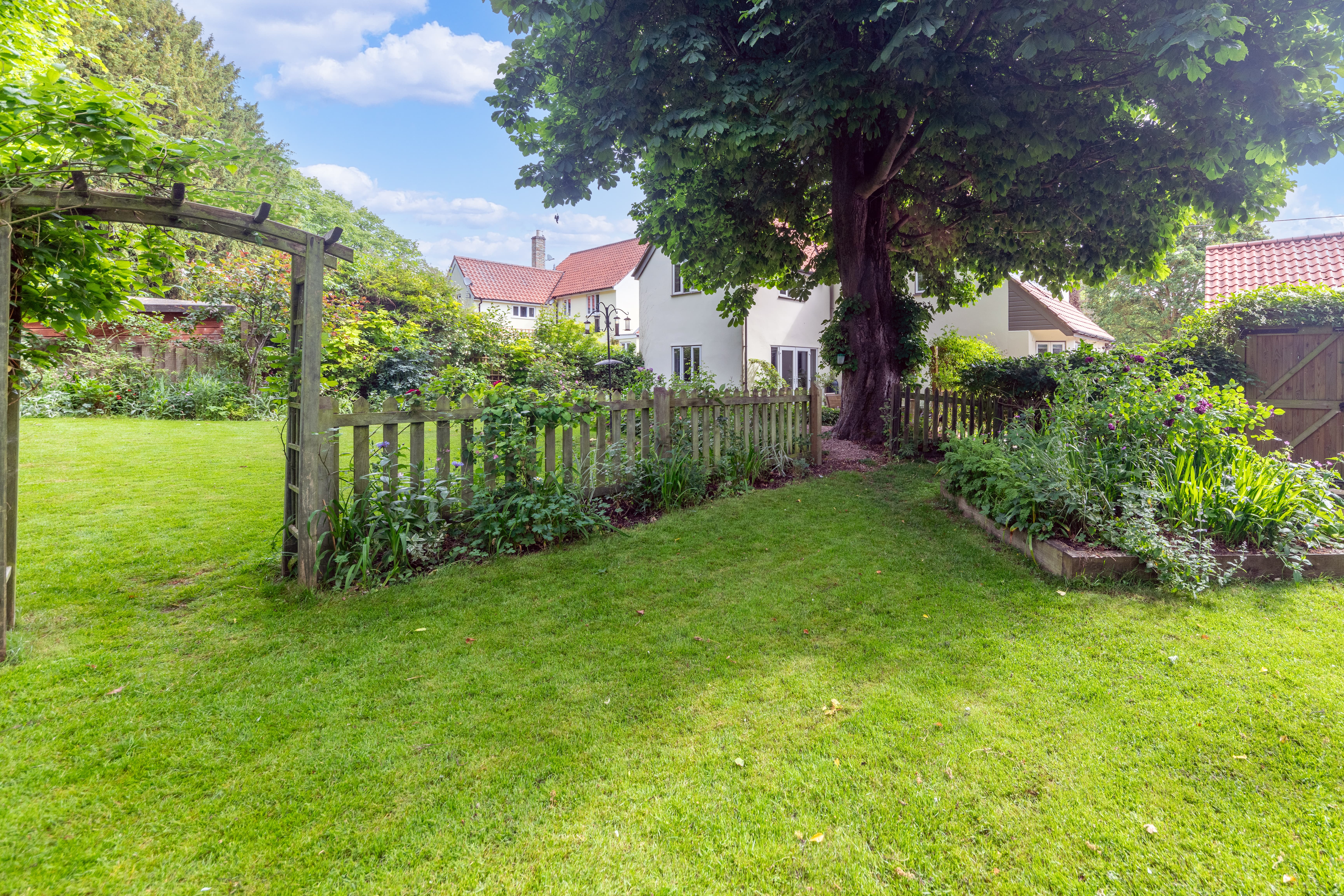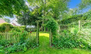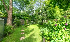 Outside, to the rear, the garden is a very good size, enclosed by fencing, mature trees and hedgerows and offering multiple lovely spaces to sit and enjoy the sunshine. It is laid to well-kempt lawn, with a large paved patio area by rear of the house, providing ample space for garden furniture, cooking al fresco on the BBQ and entertaining visitors. A meandering path leads through pretty beds full of flowers, past a pond, and through the lawn where a fence and archway essentially splits the garden. Beyond is further lovely lawn space, more borders and raised beds of flowers, access to a greenhouse and 2 sheds, and plenty of scope for future owners to add their own touches to things.