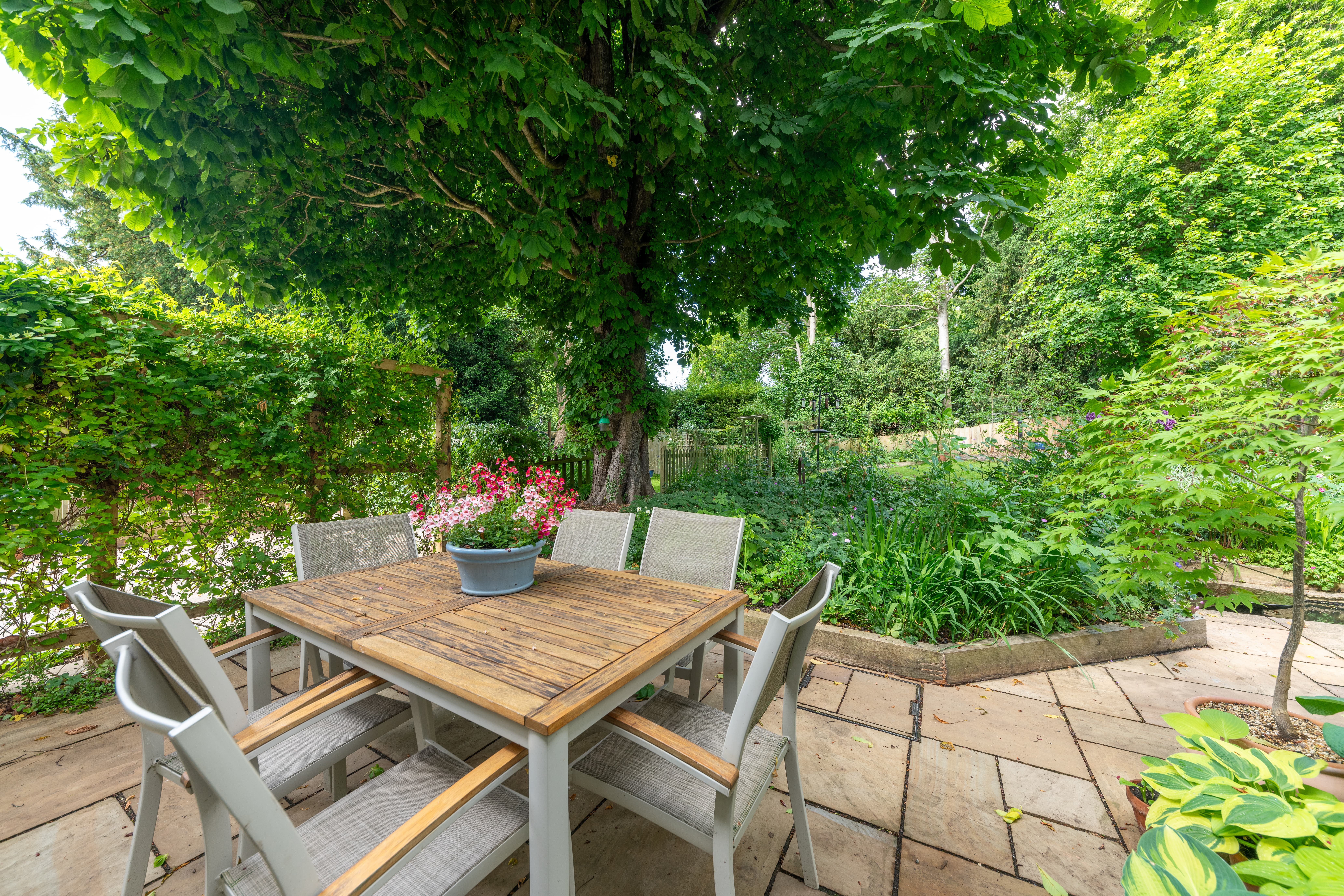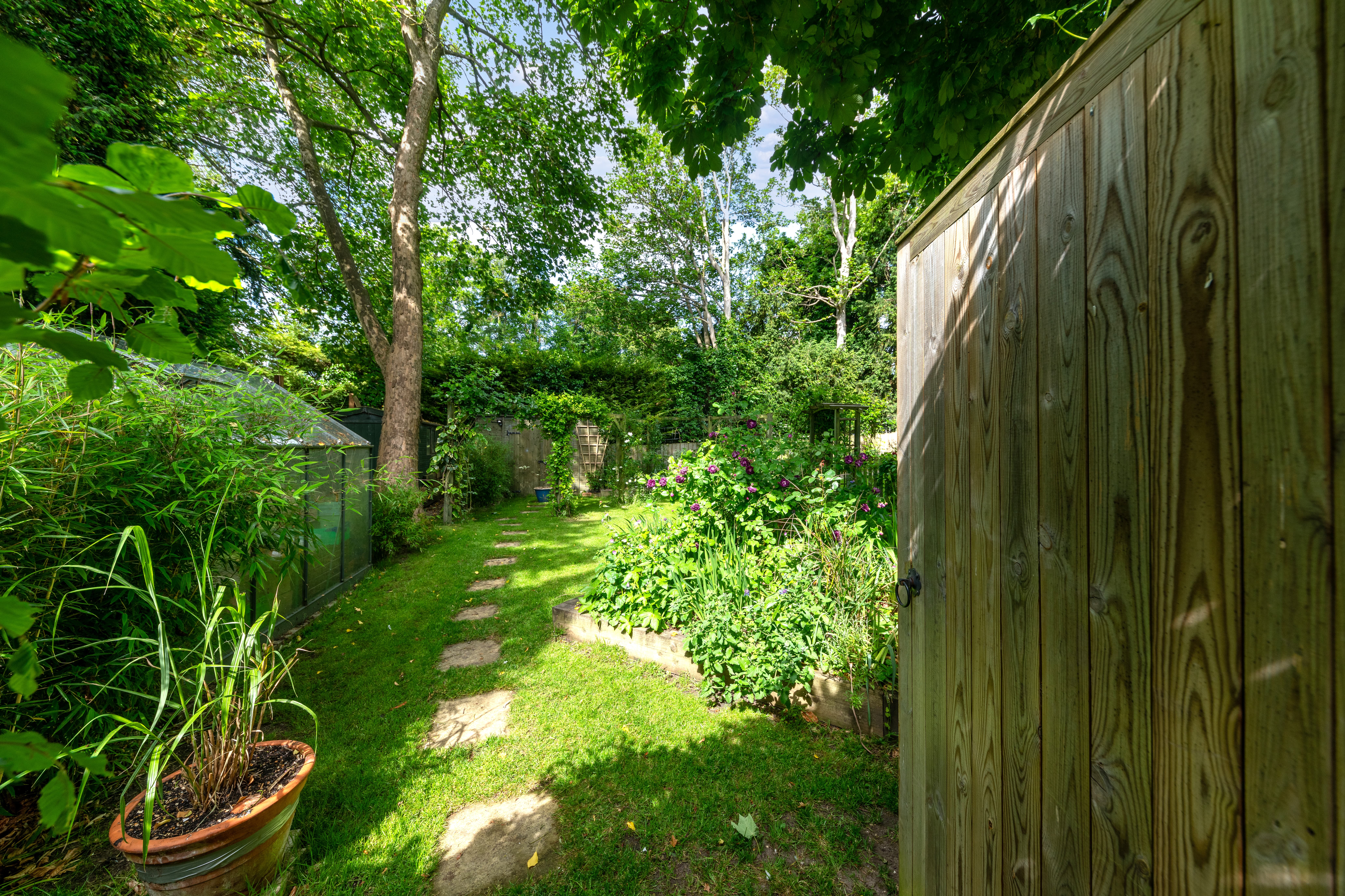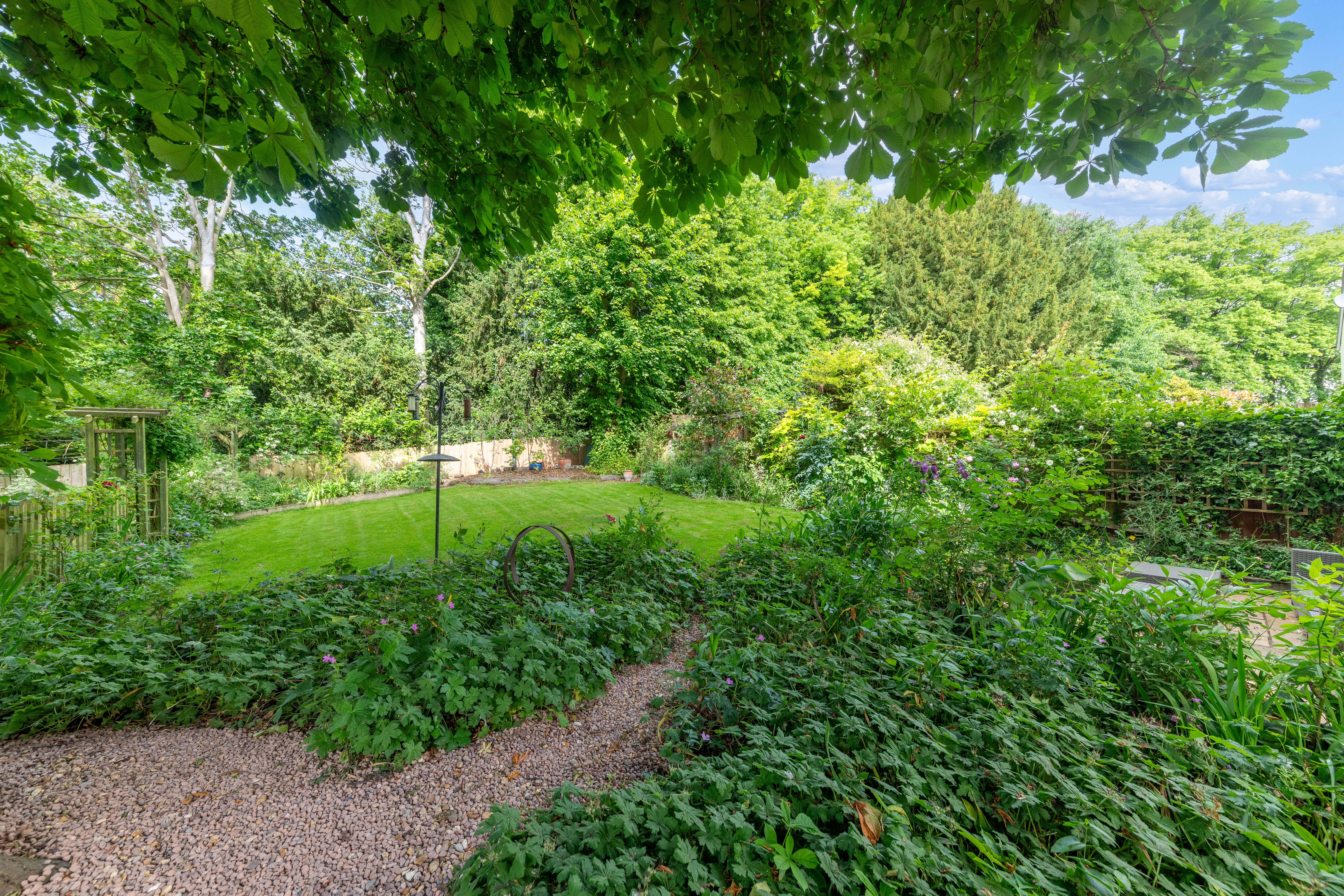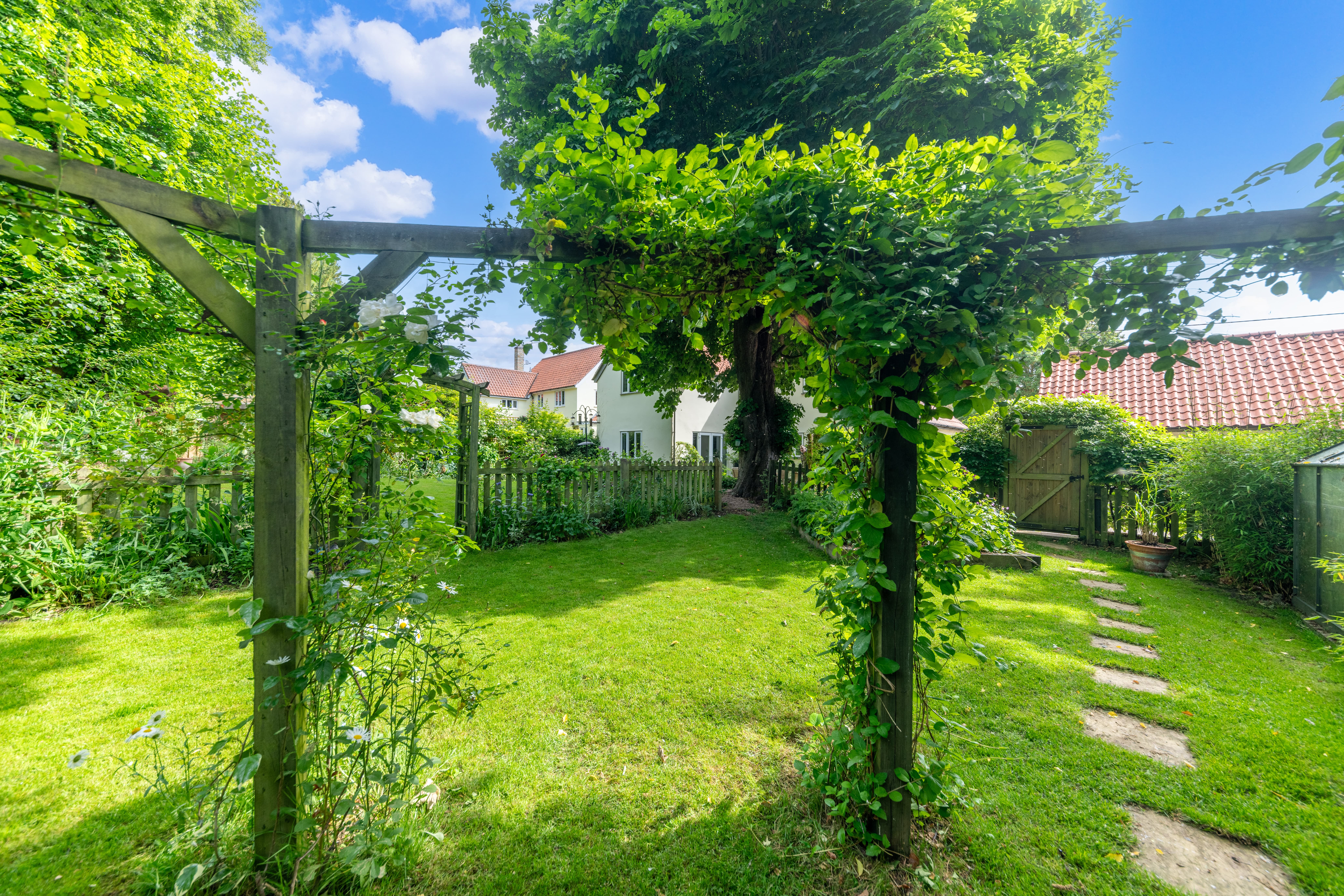 Outside, to the rear, the garden is a very good size, enclosed by fencing, mature trees and hedgerows and offering multiple lovely spaces to sit and enjoy the sunshine. It is laid to well-kempt lawn, with a large paved patio area by rear of the house, providing ample space for garden furniture, cooking al fresco on the BBQ and entertaining visitors. A meandering path leads through pretty beds full of flowers, past a pond, and through the lawn where a fence and archway essentially splits the garden. Beyond is further lovely lawn space, more borders and raised beds of flowers, access to a greenhouse and 2 sheds, and plenty of scope for future owners to add their own touches to things.
