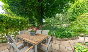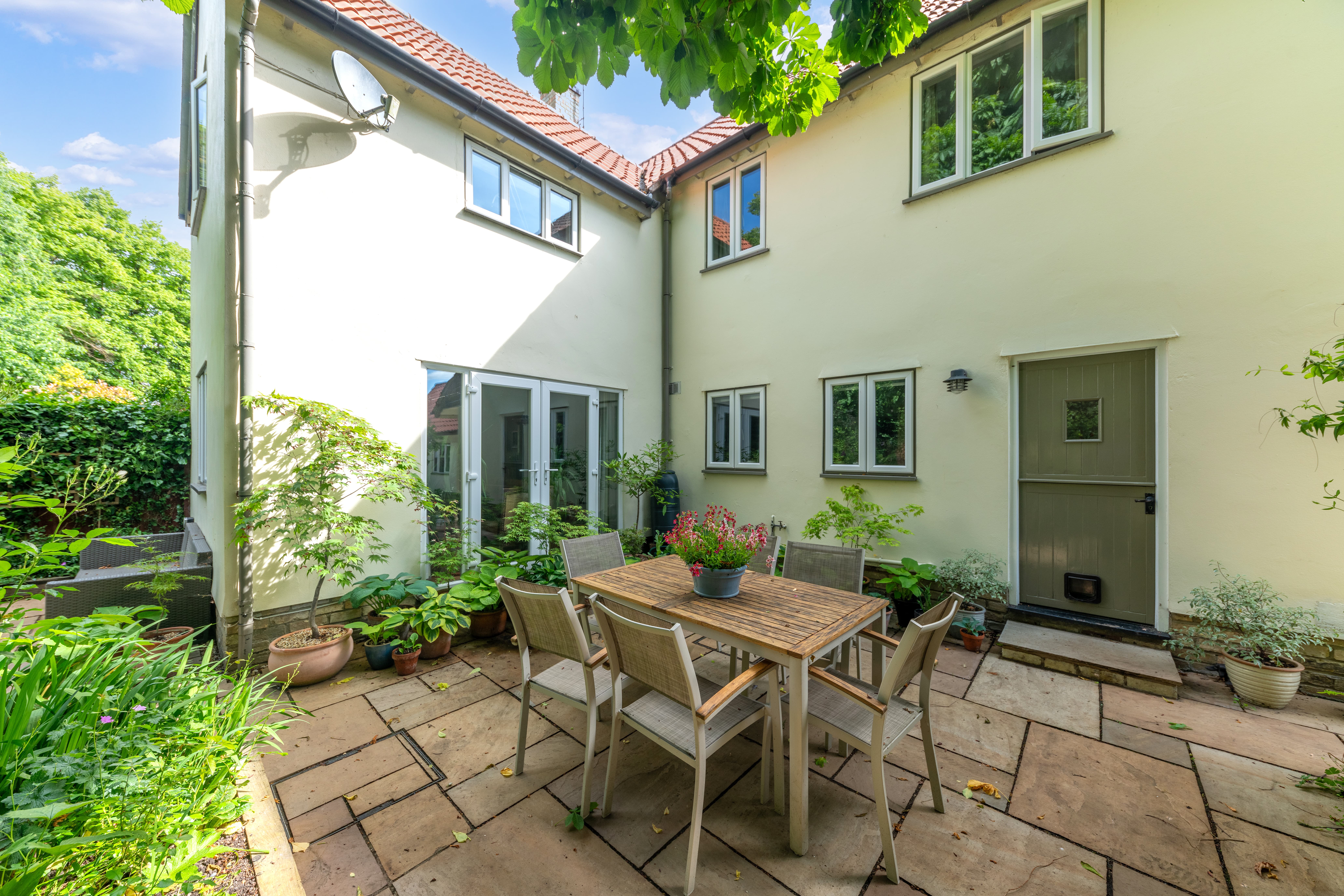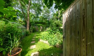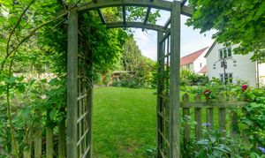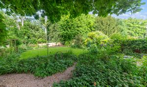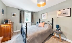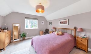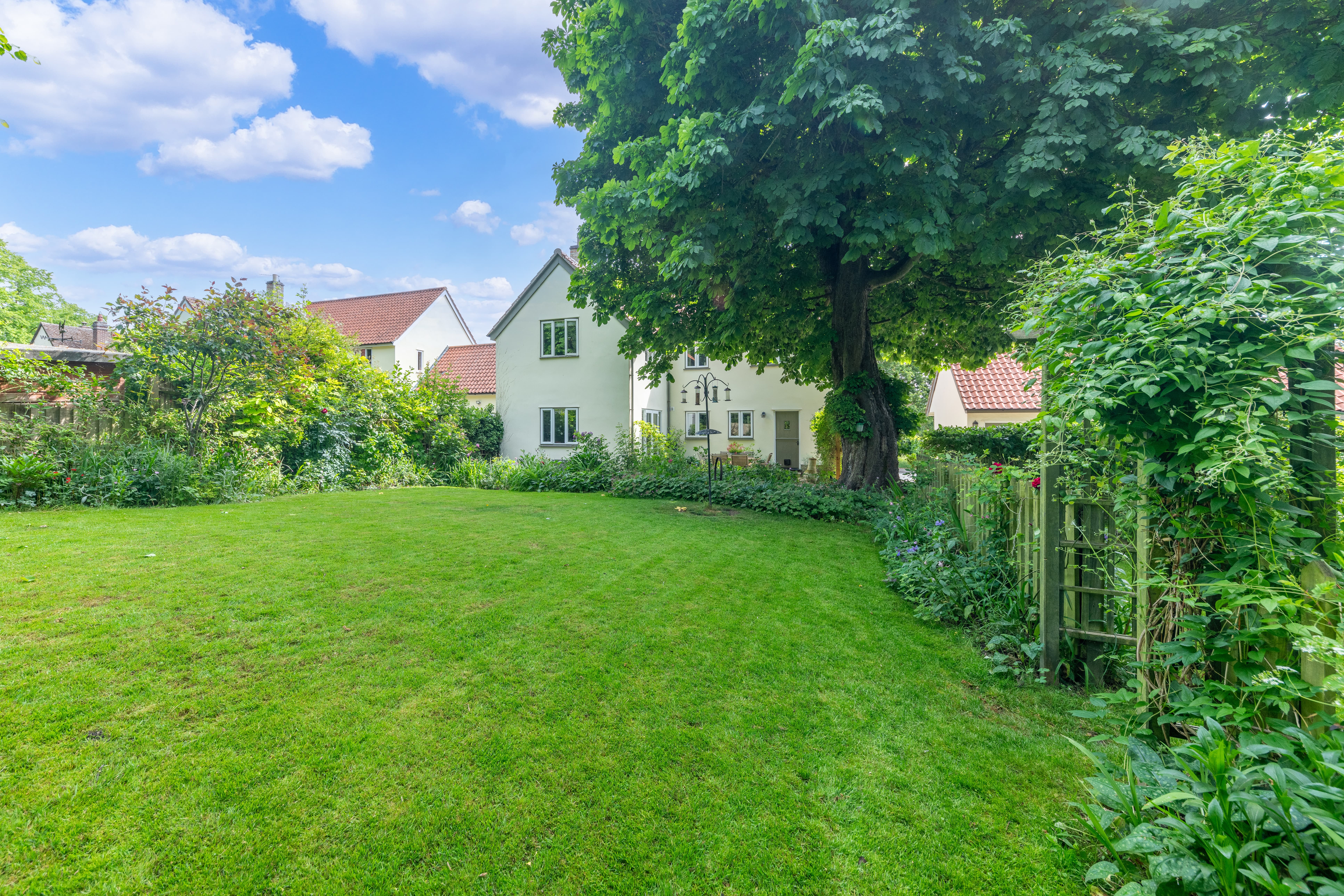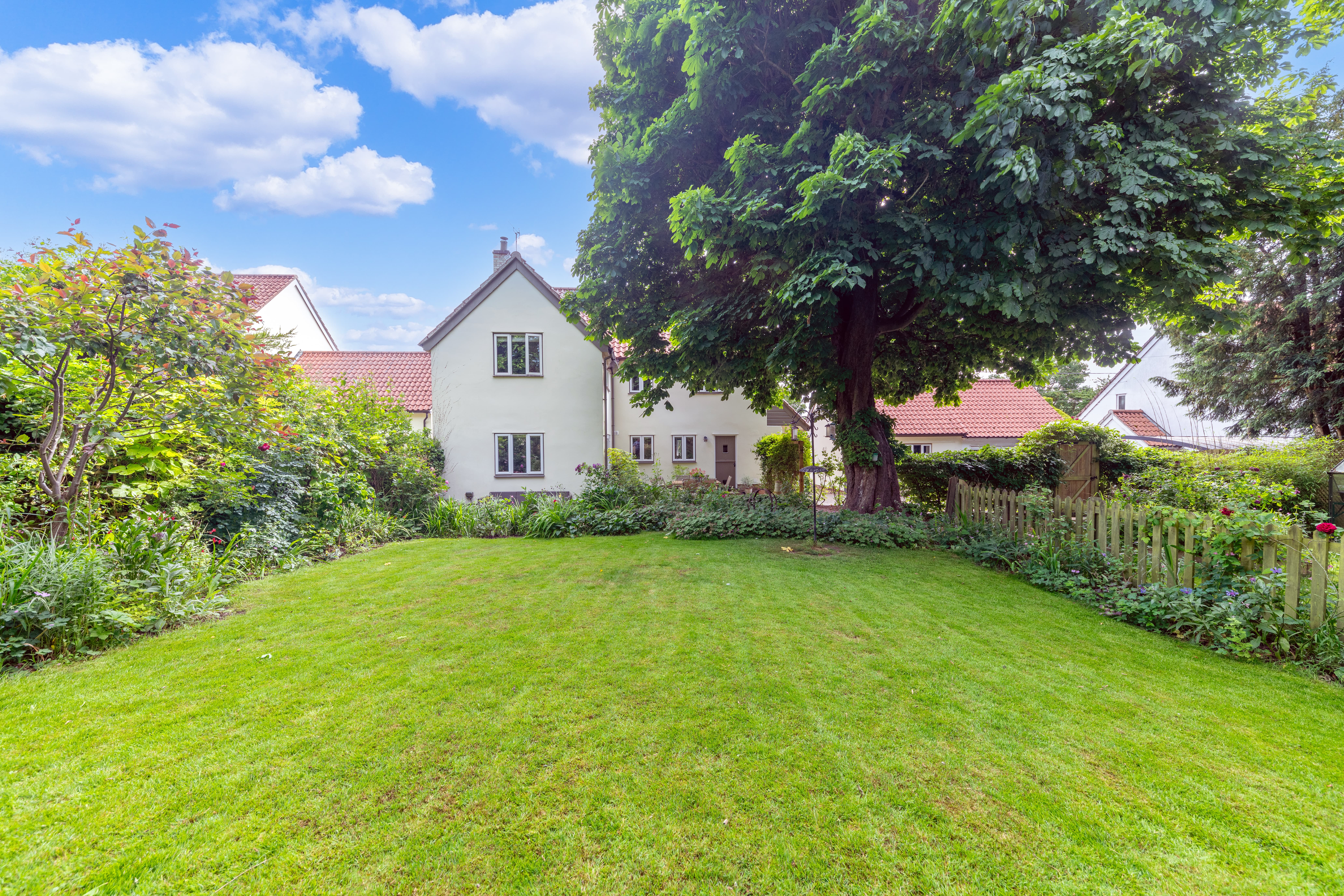 Outside, to the rear, the garden is a very good size, enclosed by fencing, mature trees and hedgerows and offering multiple lovely spaces to sit and enjoy the sunshine. It is laid to well-kempt lawn, with a large paved patio area by rear of the house, providing ample space for garden furniture, cooking al fresco on the BBQ and entertaining visitors. A meandering path leads through pretty beds full of flowers, past a pond, and through the lawn where a fence and archway essentially splits the garden. Beyond is further lovely lawn space, more borders and raised beds of flowers, access to a greenhouse and 2 sheds, and plenty of scope for future owners to add their own touches to things.