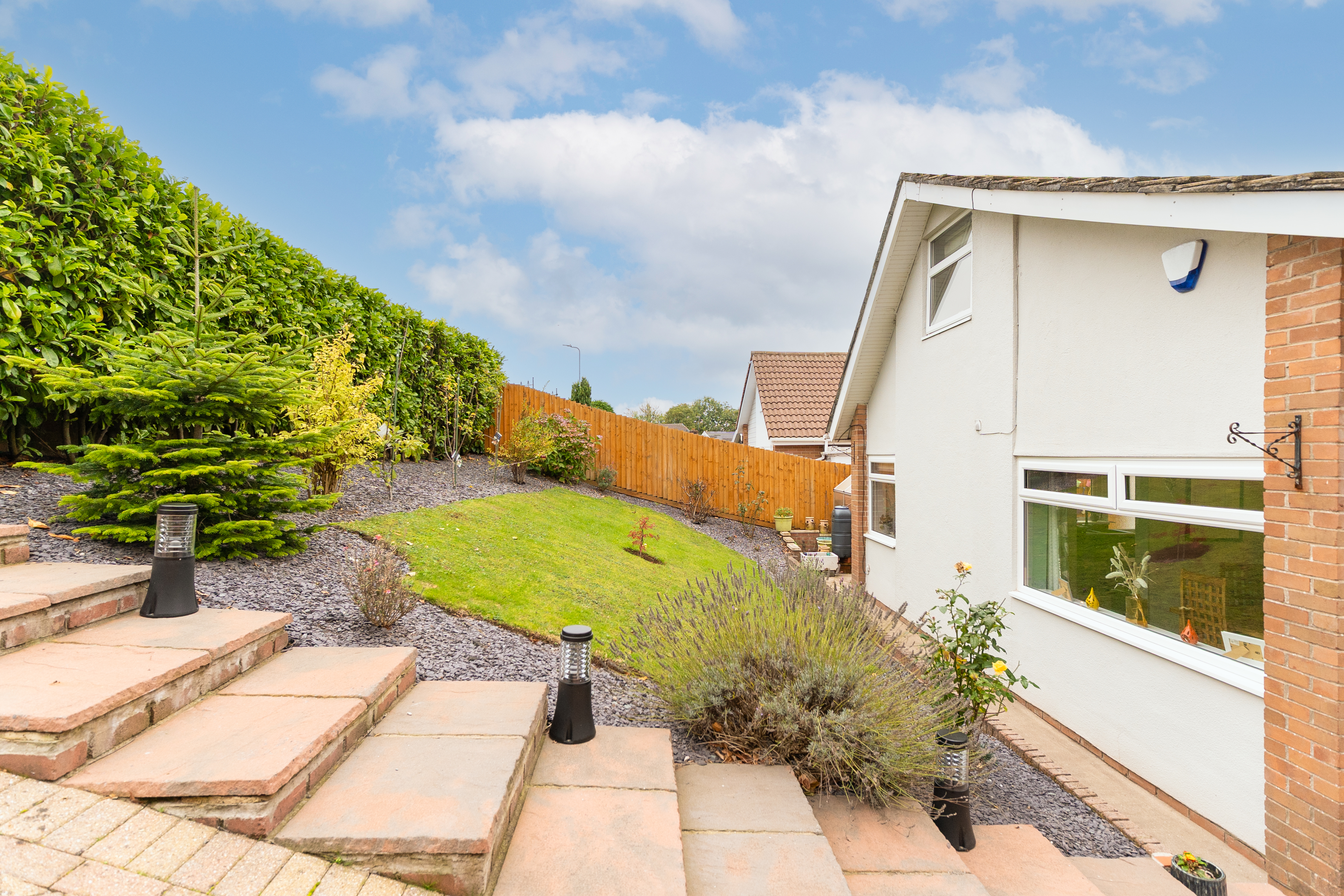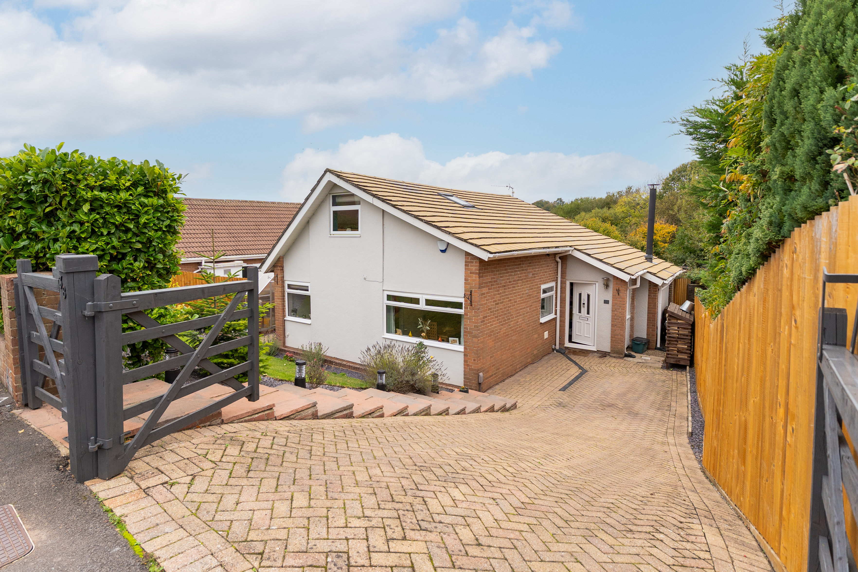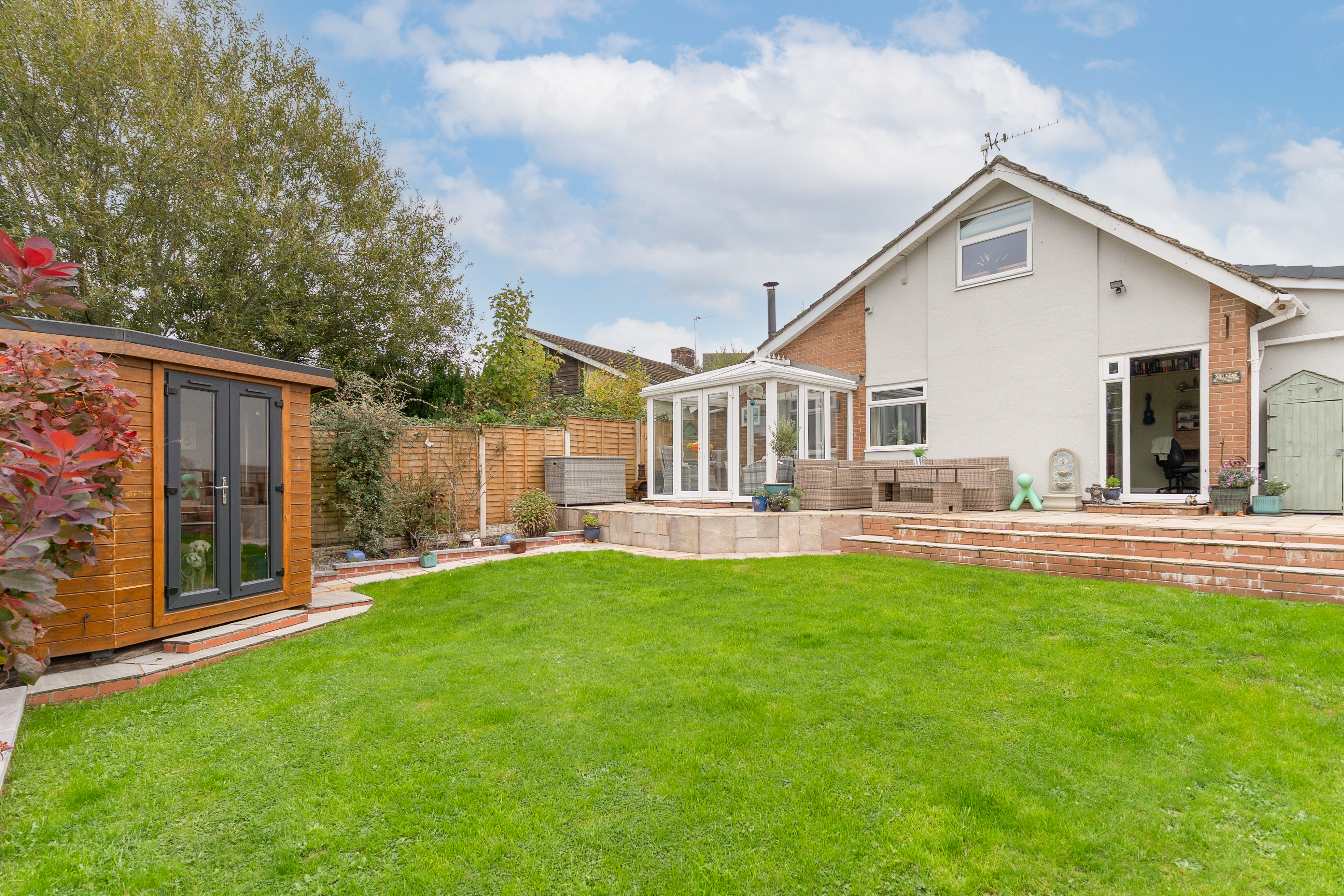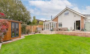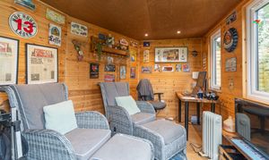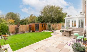 Externally, the property is set on a generous plot with a gated driveway to the front, providing secure off-road parking, and a neatly maintained front garden area enhancing its kerb appeal. To the rear, the impressive garden offers an excellent mix of patio and lawned areas, perfect for outdoor seating, dining, and entertaining. The space also includes well-kept planters and a purpose-built summer house, ideal for use as a home office, studio, or simply a relaxing retreat.