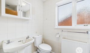 Carpet flooring, three piece comparison of wc, basin and electric shower enclosure, tiled floor to ceiling, frosted double glazed uPVC window, panel radiator.