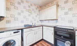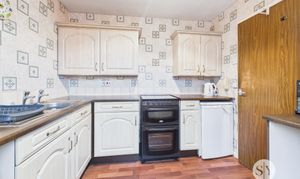 Vinyl flooring, fitted wall and base units with contrasting work surfaces, tiled splash backs, stainless steel sink and drainer, space for washing machine, fridge and cooker, double flazed uPVC window and door.