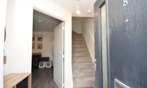 Composite frosted glazed front door with LVT flooring in the hallway. Storage cupboard, radiator and stairs to first floor landing. Door To :-