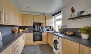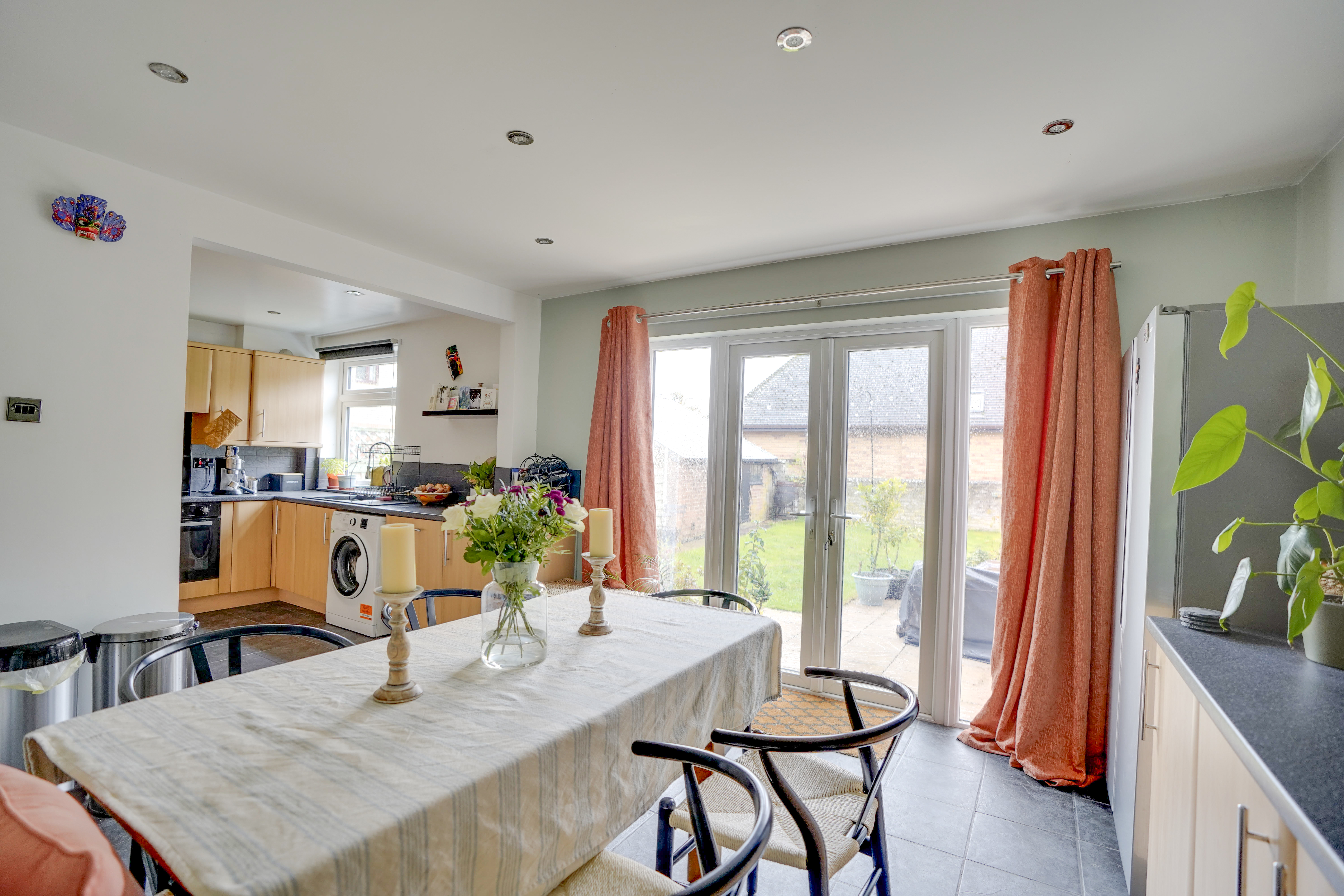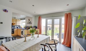 This beautifully presented property offers spacious and well-planned accommodation throughout, perfect for family living. Upon entering, you are greeted by a welcoming entrance hall with wood-effect flooring, a radiator, and useful understairs storage, with stairs leading to the first floor. The large lounge features a charming bay window to the front aspect, wood-effect flooring, and a new multi-fuel burner — creating a warm and cosy atmosphere ideal for relaxing evenings. The modern kitchen is fitted with a range of matching eye and base level units, complemented by work surfaces and a single sink with mixer taps. It includes a built-in oven with hob and extractor, integrated dishwasher, and space for a fridge/freezer and washing machine, with a window overlooking the rear garden. The kitchen opens into a generous dining room with base units, spotlights, tiled flooring, and double glazed patio doors leading out to the rear garden — perfect for entertaining and family meals.