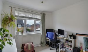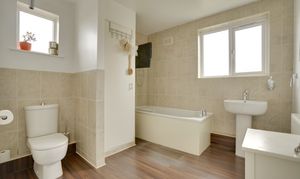Upstairs, the first-floor landing gives access to the loft space and three comfortable double bedrooms. The spacious master bedroom features a bay window to the front, while the second and third bedrooms offer pleasant views and ample storage space. The family bathroom is fitted with a white suite comprising a low-level WC, pedestal hand basin, and panelled bath with Triton shower and screen, complemented by part-tiled walls and windows to the side and rear aspects.