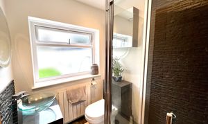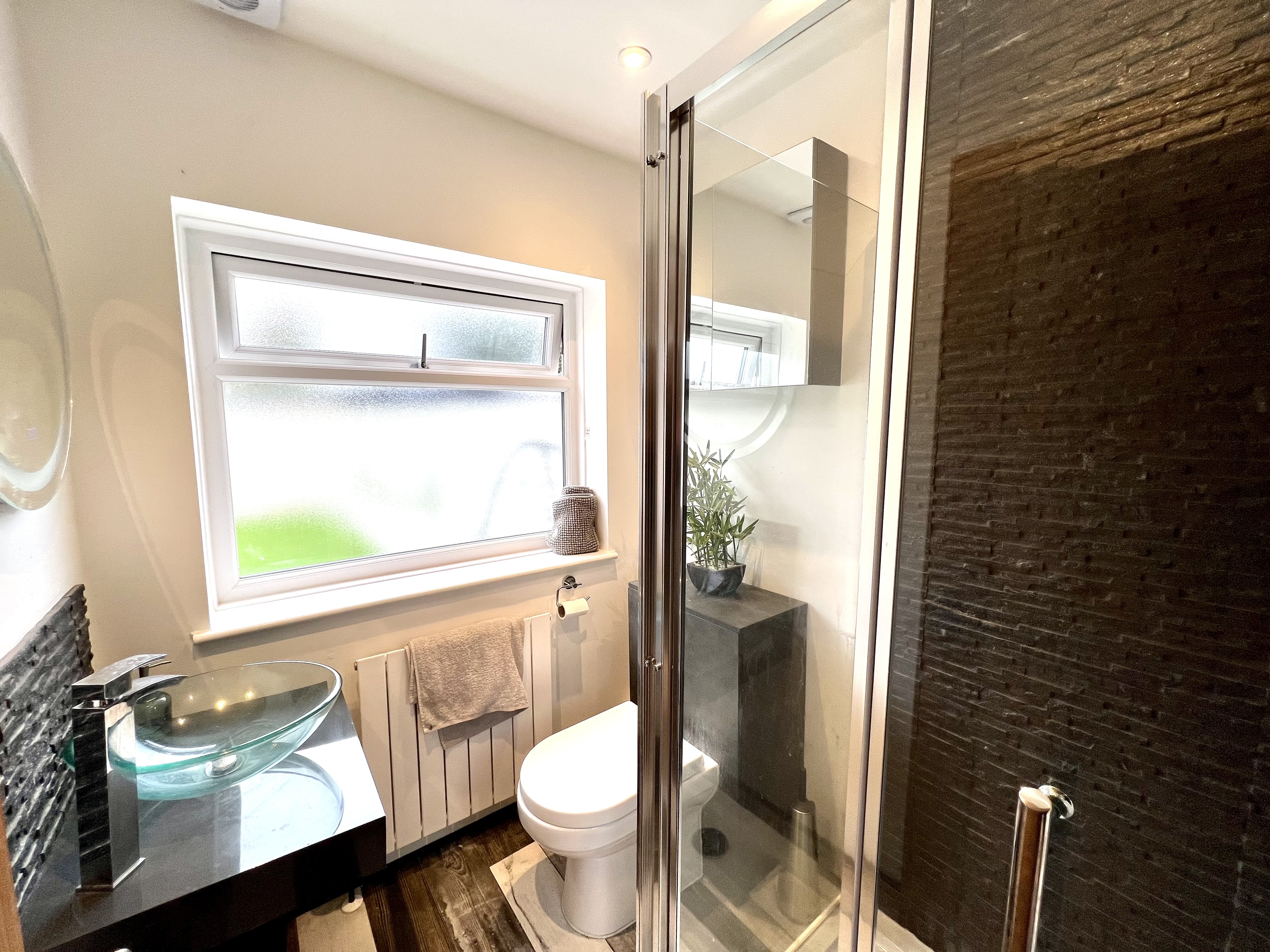 Obscured Upvc double glazed window to rear. Smooth plastered ceiling with inset spotlights. Modern white suite comprises fully tiled shower cubicle with mains shower, glass bowl wash hand basin with feature tiled splash backs and mixer tap. Inset low level WC. Modern panel radiator. Wood effect laminate wood flooring.