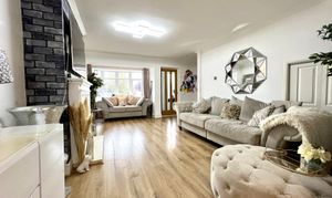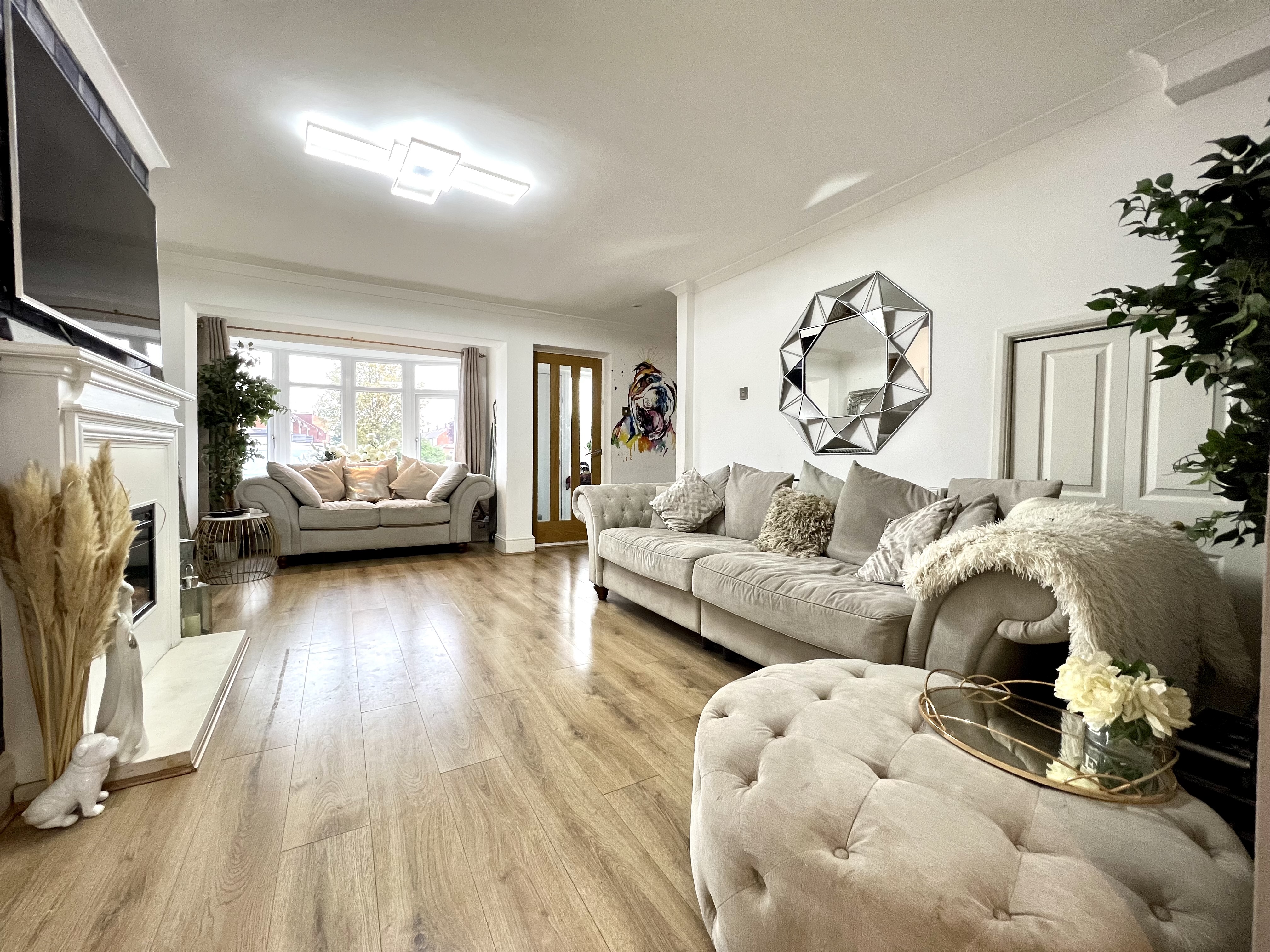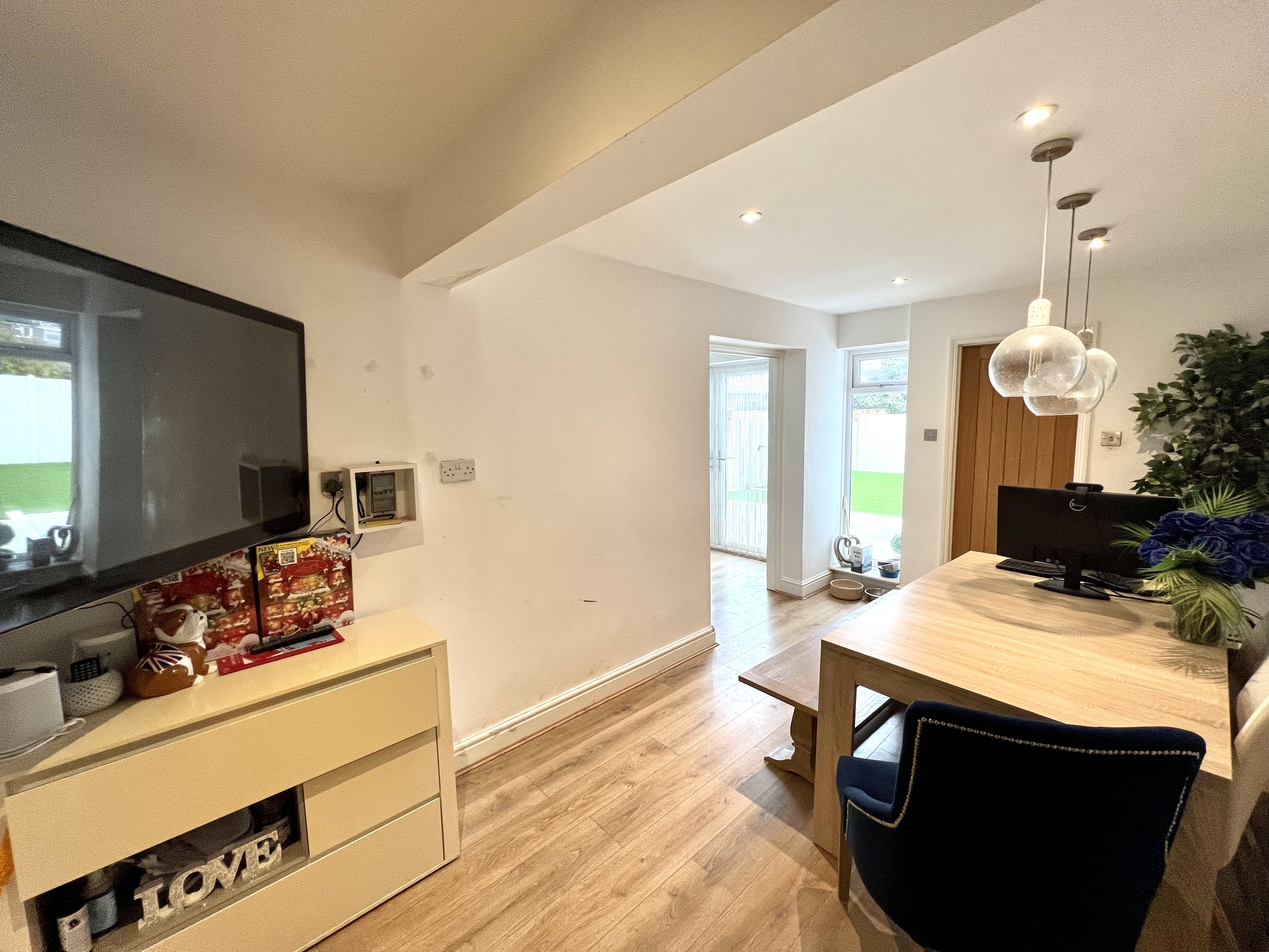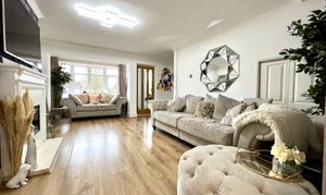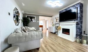 Upvc double glazed bay window with deep sill to front. Coving to smooth plastered ceiling with inset spotlights. Feature fireplace with inset electric fire. Under stairs storage cupboard. Radiator. Laminate wood flooring. Recessed staircase to first floor. Open aspect to: