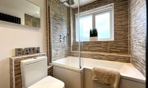 Obscured Upvc double glazed window to rear. Smooth plastered ceiling with inset spotlights. Modern white suite comprises panelled P'shaped bath with mains shower and shower screen. Wash hand basin set in cupboard below. Inset low level WC. Fully tiled walls in modern ceramics to bath/shower area. Further matching splash back tiling. Feature modern vertical radiator. Wood effect vinyl flooring.