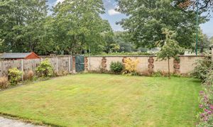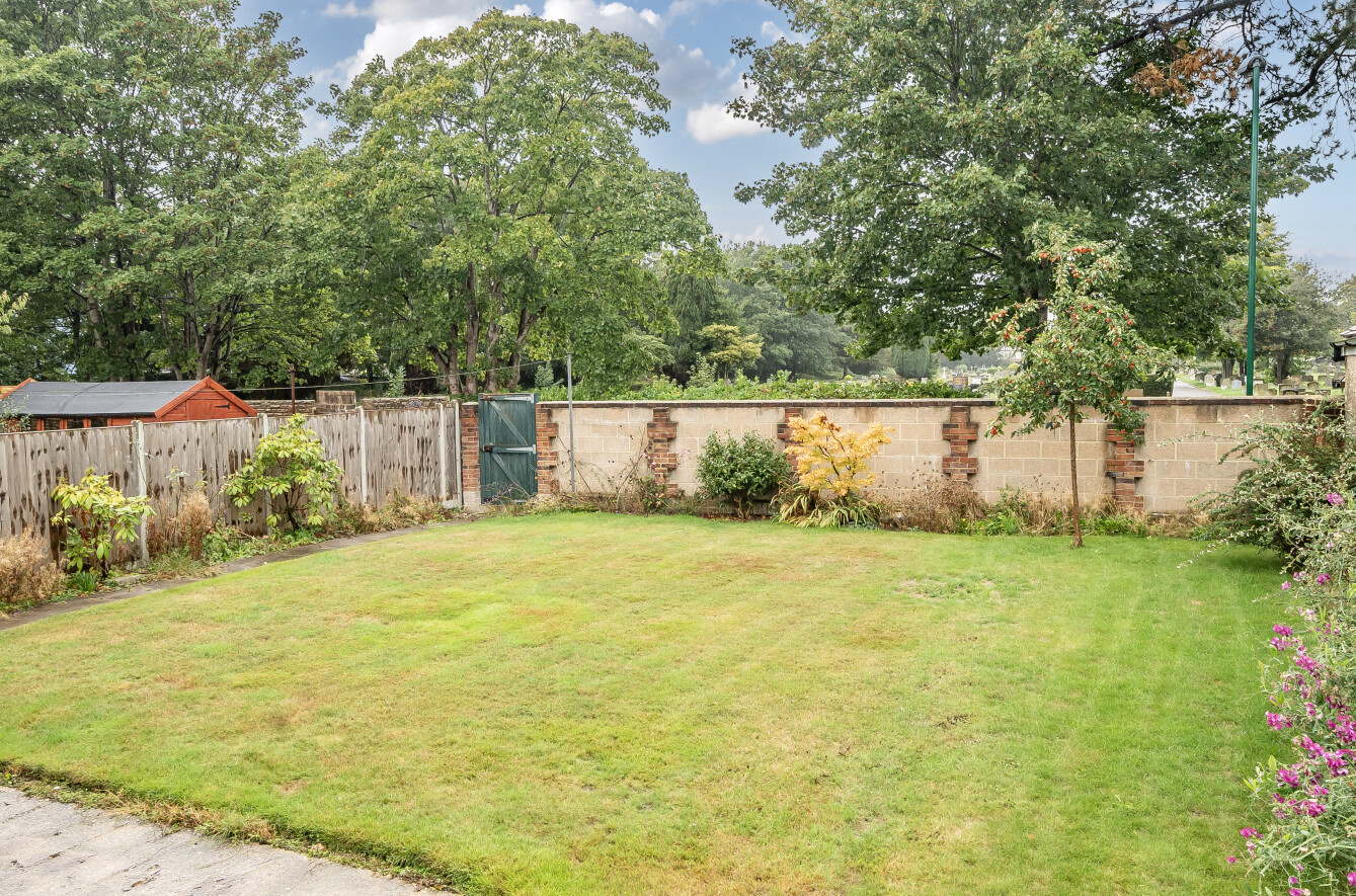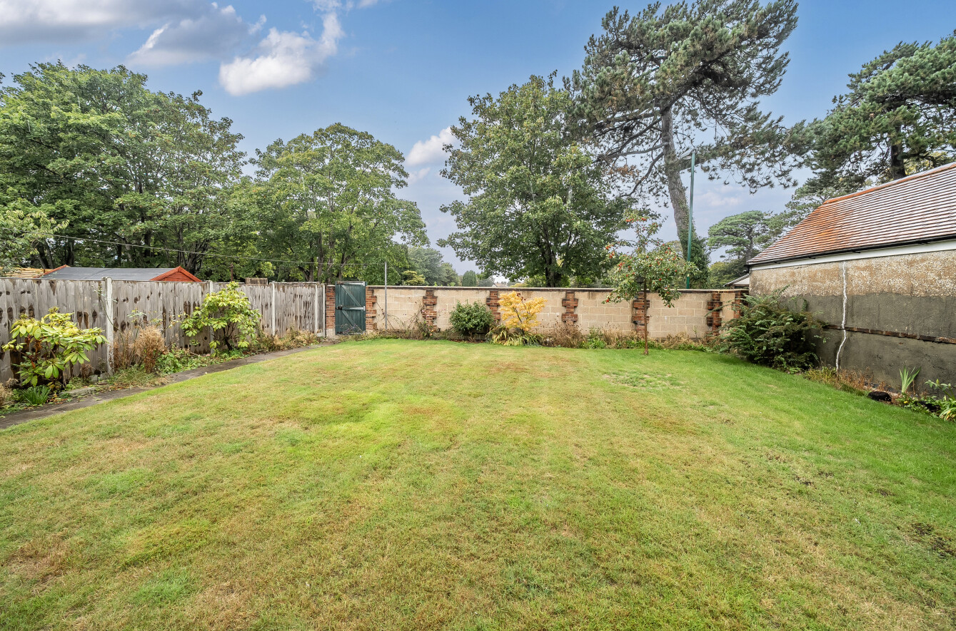 The rear garden is mostly lawn with border beds and access on both sides of the house.
