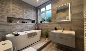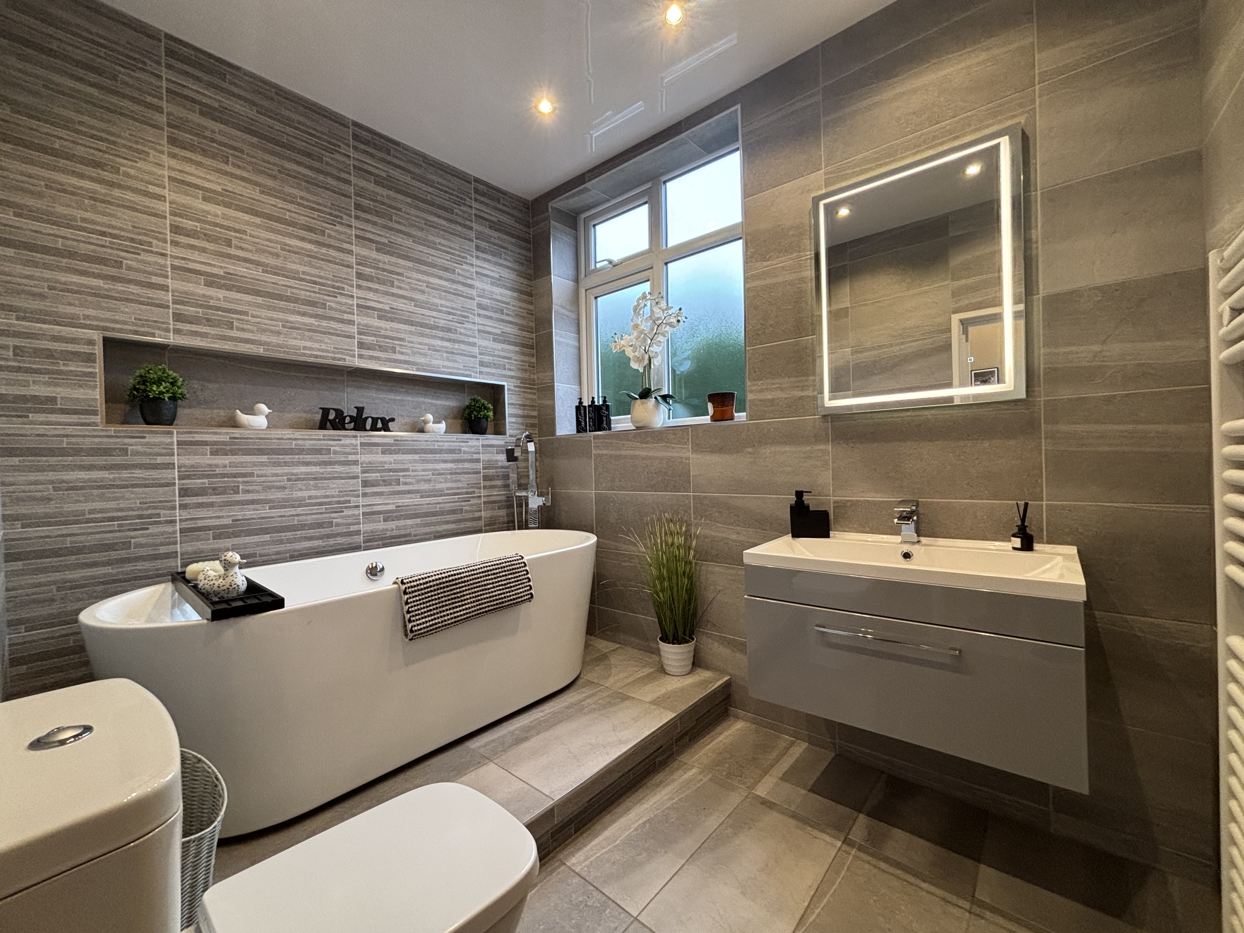 Window to the side elevation. Fitted with a free standing bath, low level W.C and a vanity wash hand basin. Fully tiled walls and floor. Inset spotlights.
