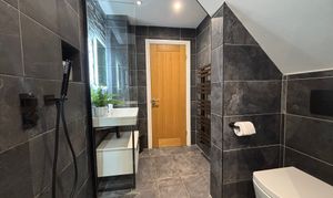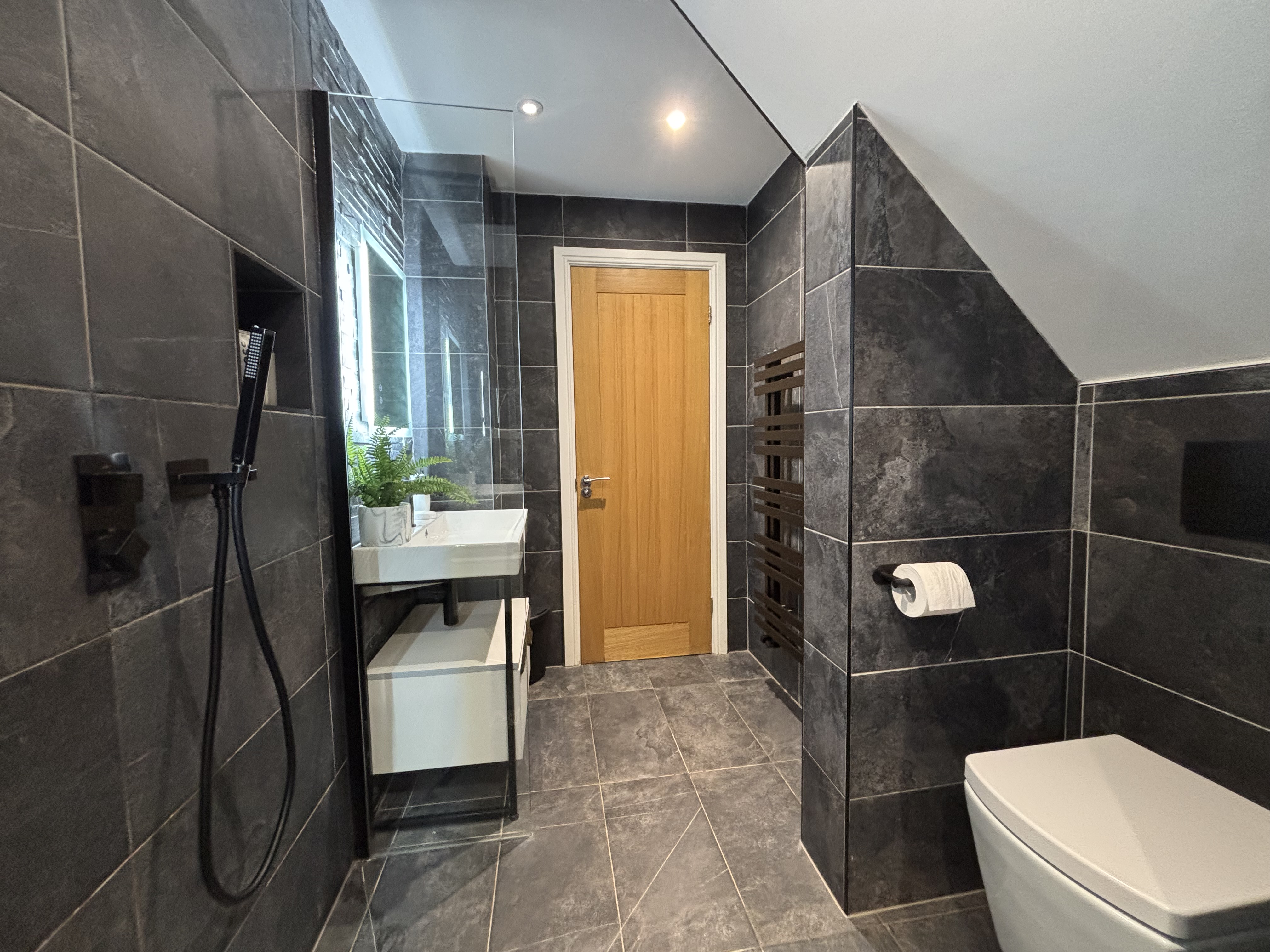 Fully tiled walls and floor. Fitted with two wash hand basins a low level W.C and a wet room shower. Inset spotlights.