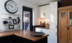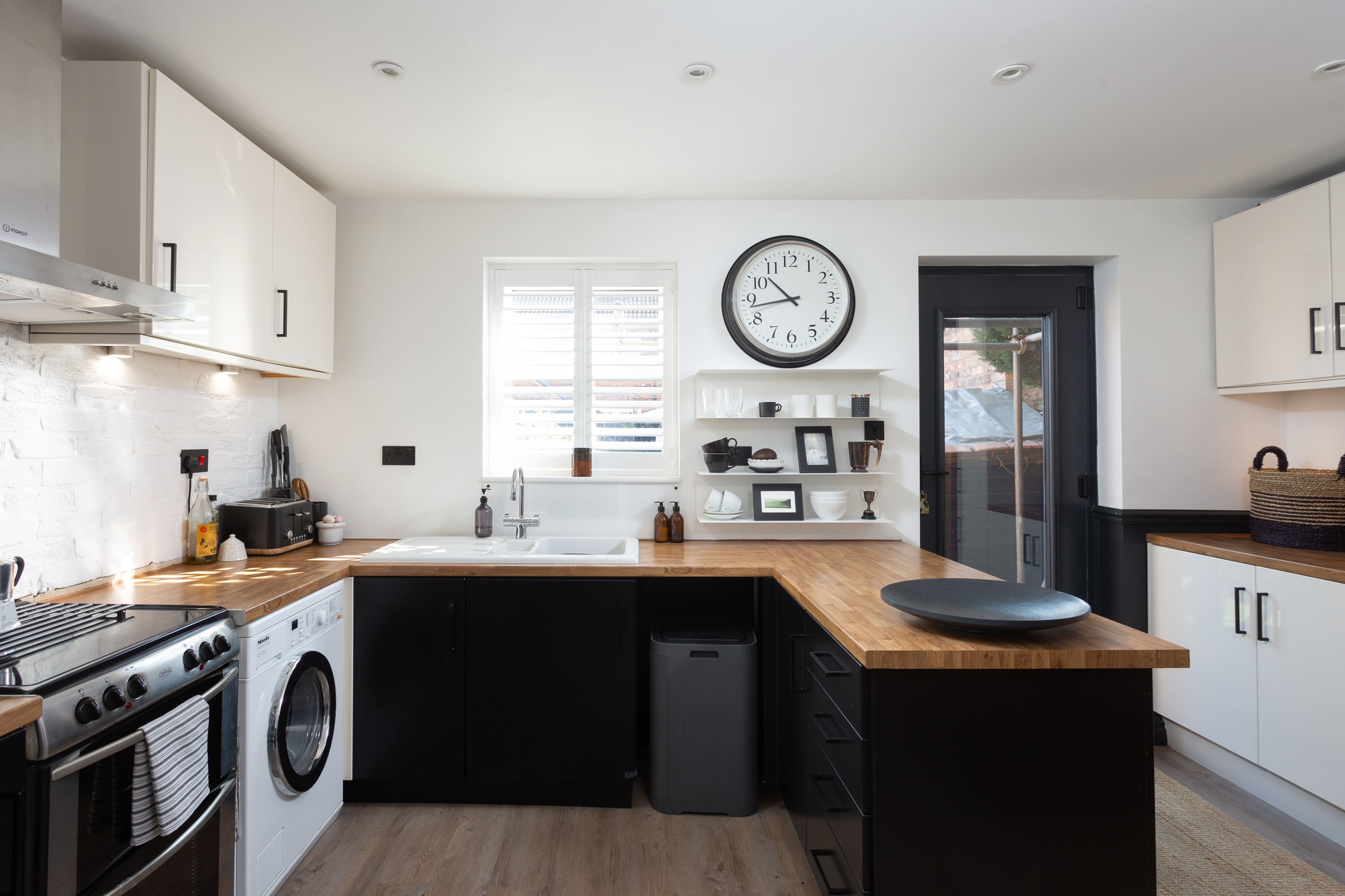 The spacious kitchen is fitted with a range of cream and black painted base and wall units with oak effect work tops over. A white porcelain sink sits beneath the window and the Karndean flooring continues through from the lounge. Appliances included in the sale are:- an electric oven and hob with extractor fan above, a washing machine, a fridge/freezer and space is provided for a slimline dishwasher. The glazed rear door tones nicely with the décor and opens onto the patio and rear garden. The Antique wood wardrobe used for extra storage can also remain in the property.