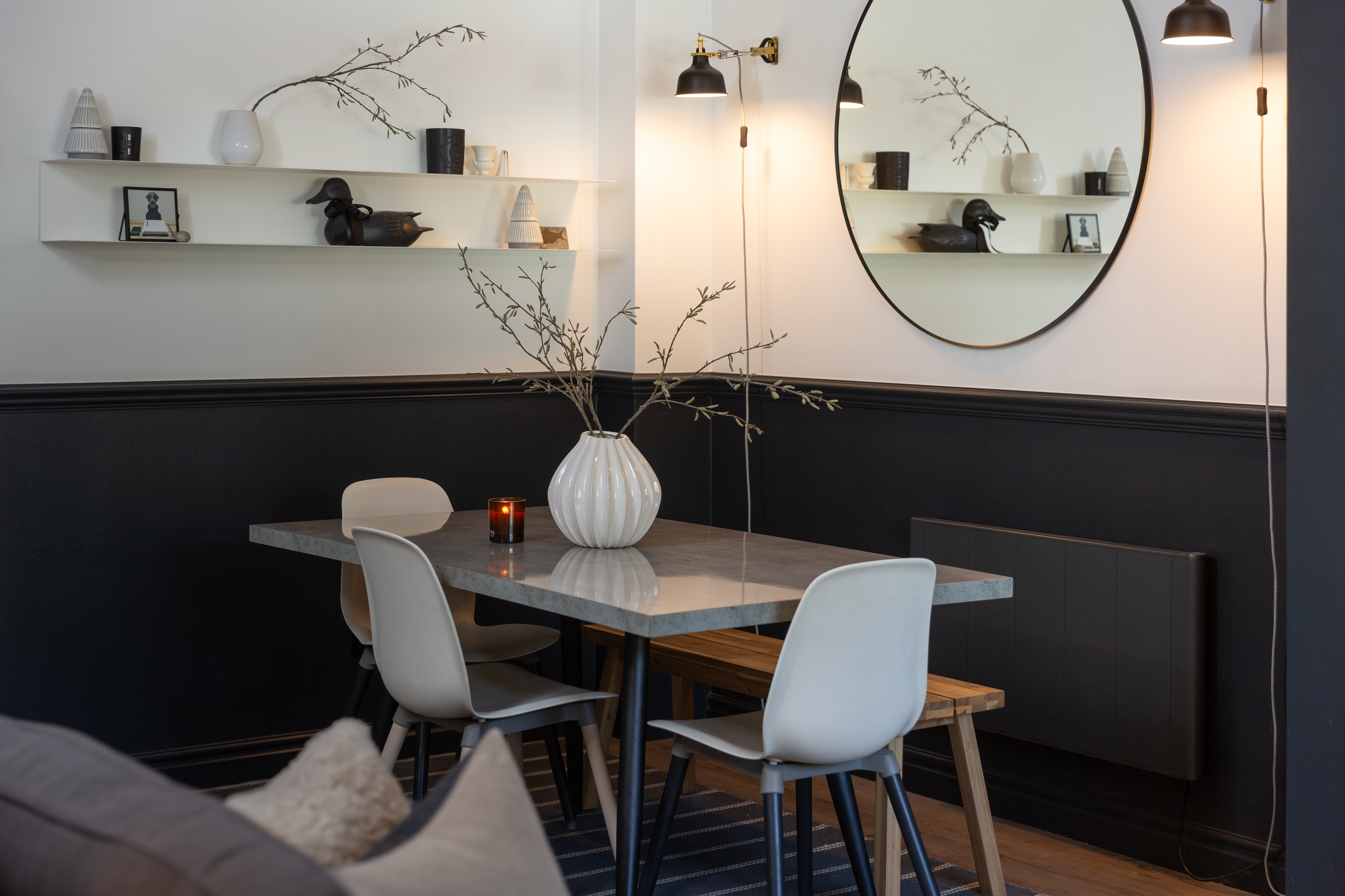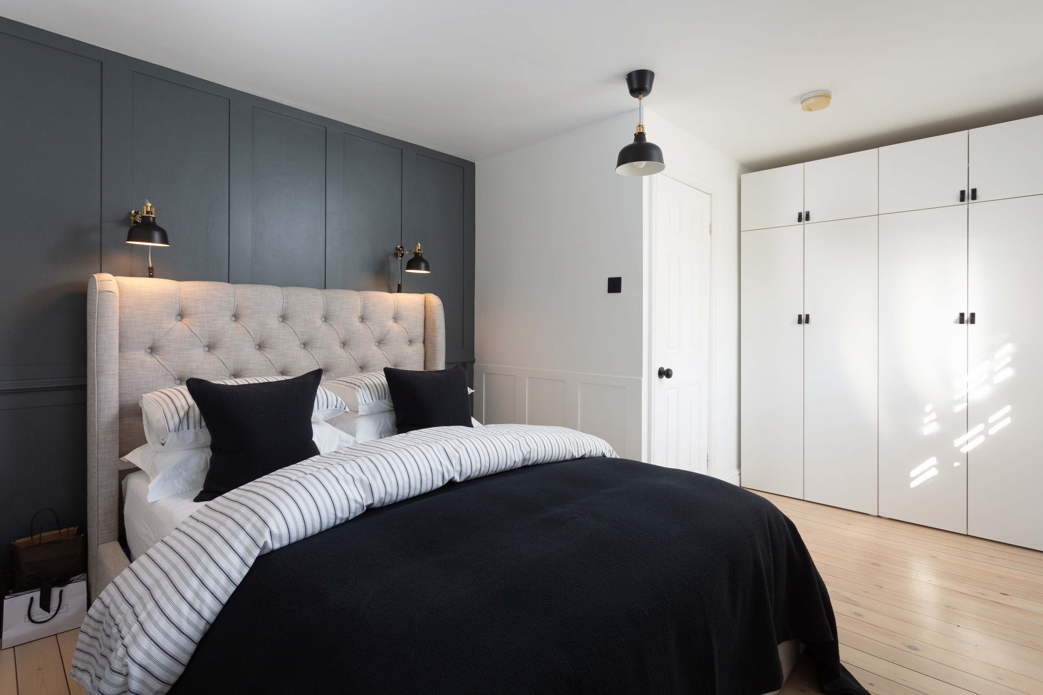 Another good size, L shaped room, currently used as the principal bedroom overlooks the rear garden. Panelled and painted to offer a feature wall with decorative wall lights behind the bed head, which casts a cosy glow over the room. Wardrobe to remain.