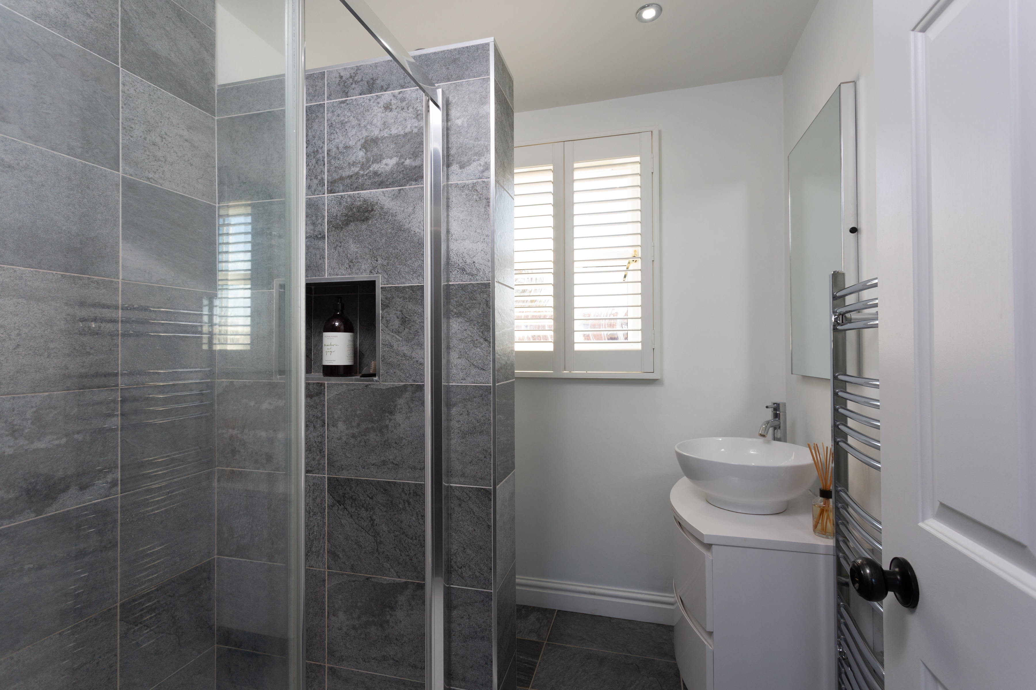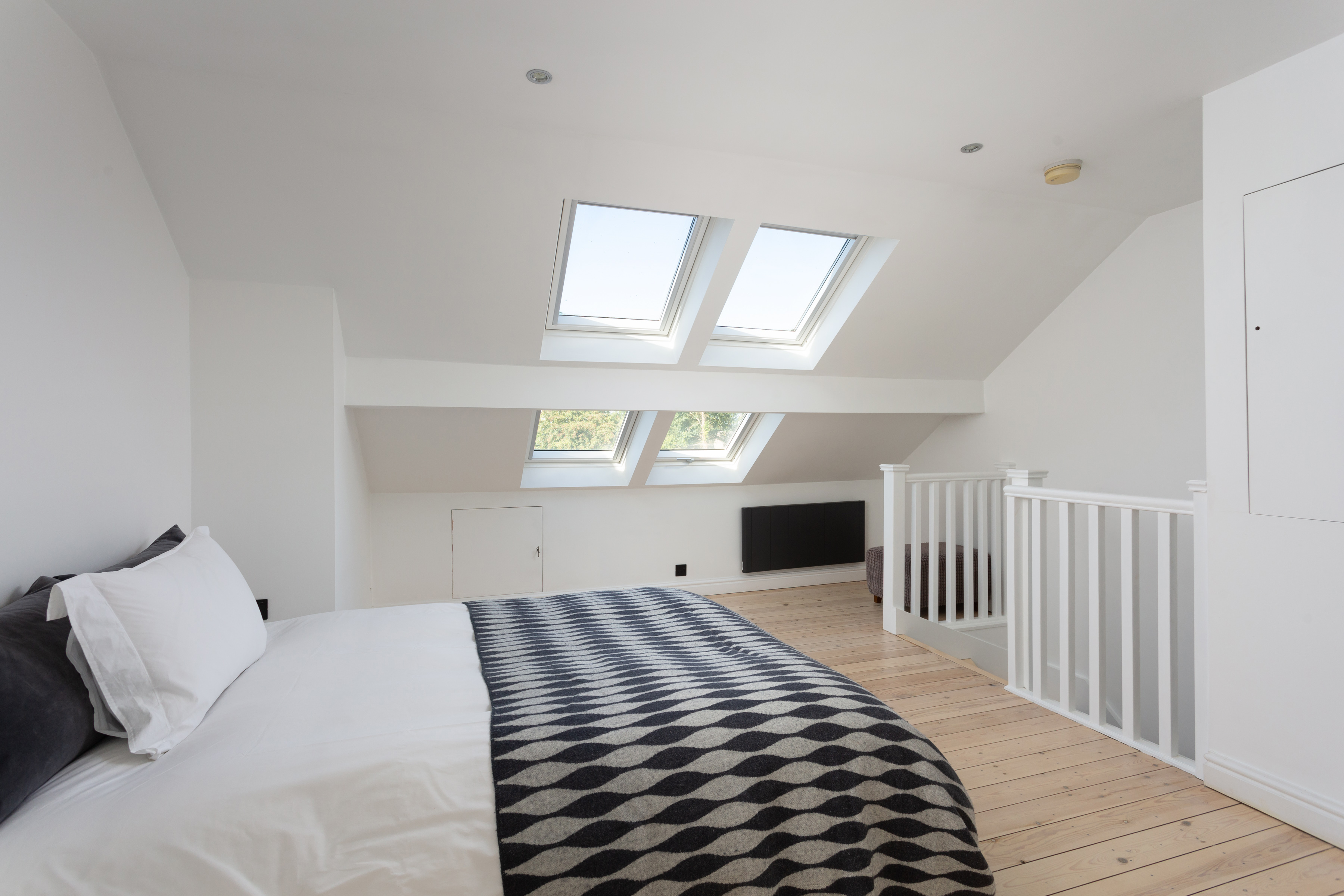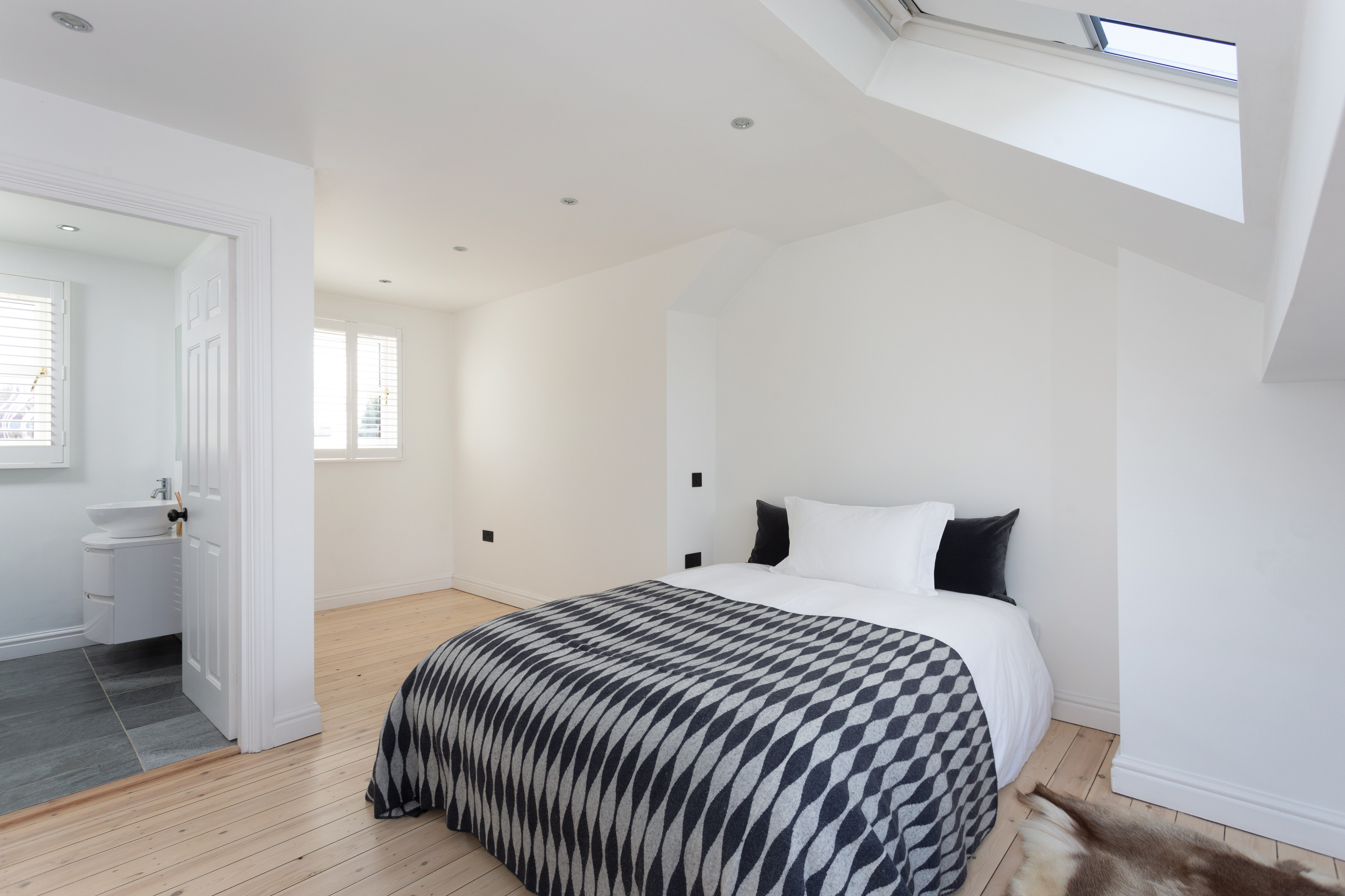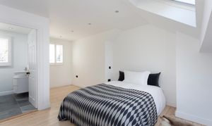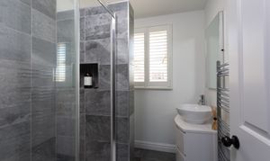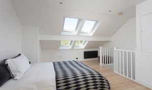A second staircase leads to the attic room. Another good size double room, which could also lend itself to being the principal bedroom, offering space for a double bed, wardrobes and an array of free-standing bedroom furniture. Quadruple Velux windows with blinds and a window in the rear dormer create a naturally light room. The en-suite consists of walk-in shower with waterfall, jets and handheld heads, basin on a vanity unit with storage and a low level W/C. A frosted window, with a bathroom quality plantation shutters and this room is complete with partially tiled walls and underfloor heating.