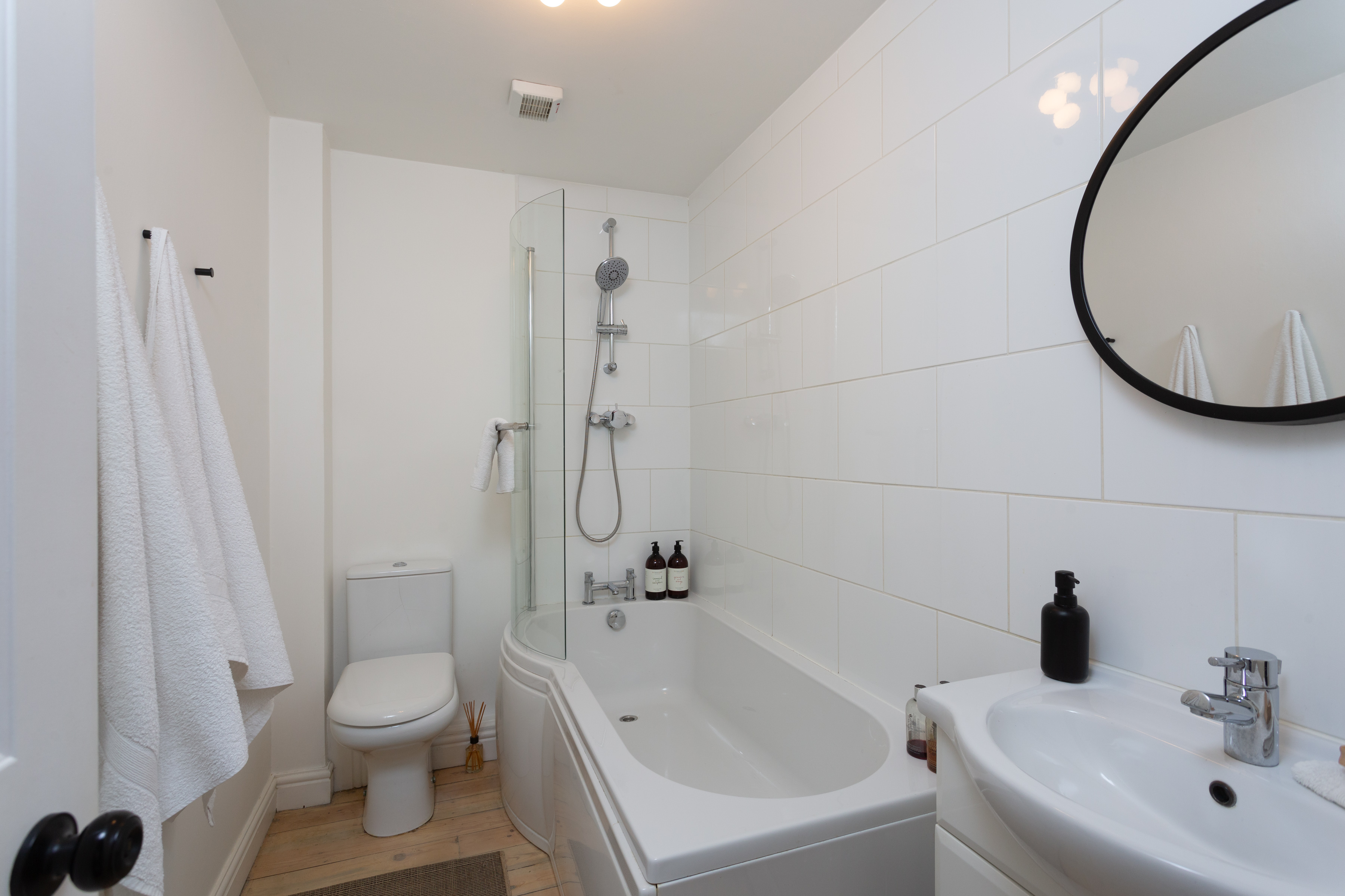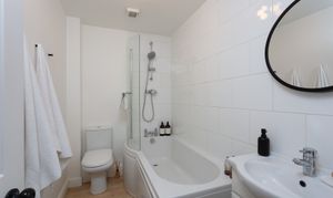 The house bathroom is fitted with a white three-piece suite to include a low level WC, wash hand basin set on a vanity unit and a P shaped bath with shower and glass screen over. There is partial tiling to the walls, an extractor fan and ceiling spotlights.