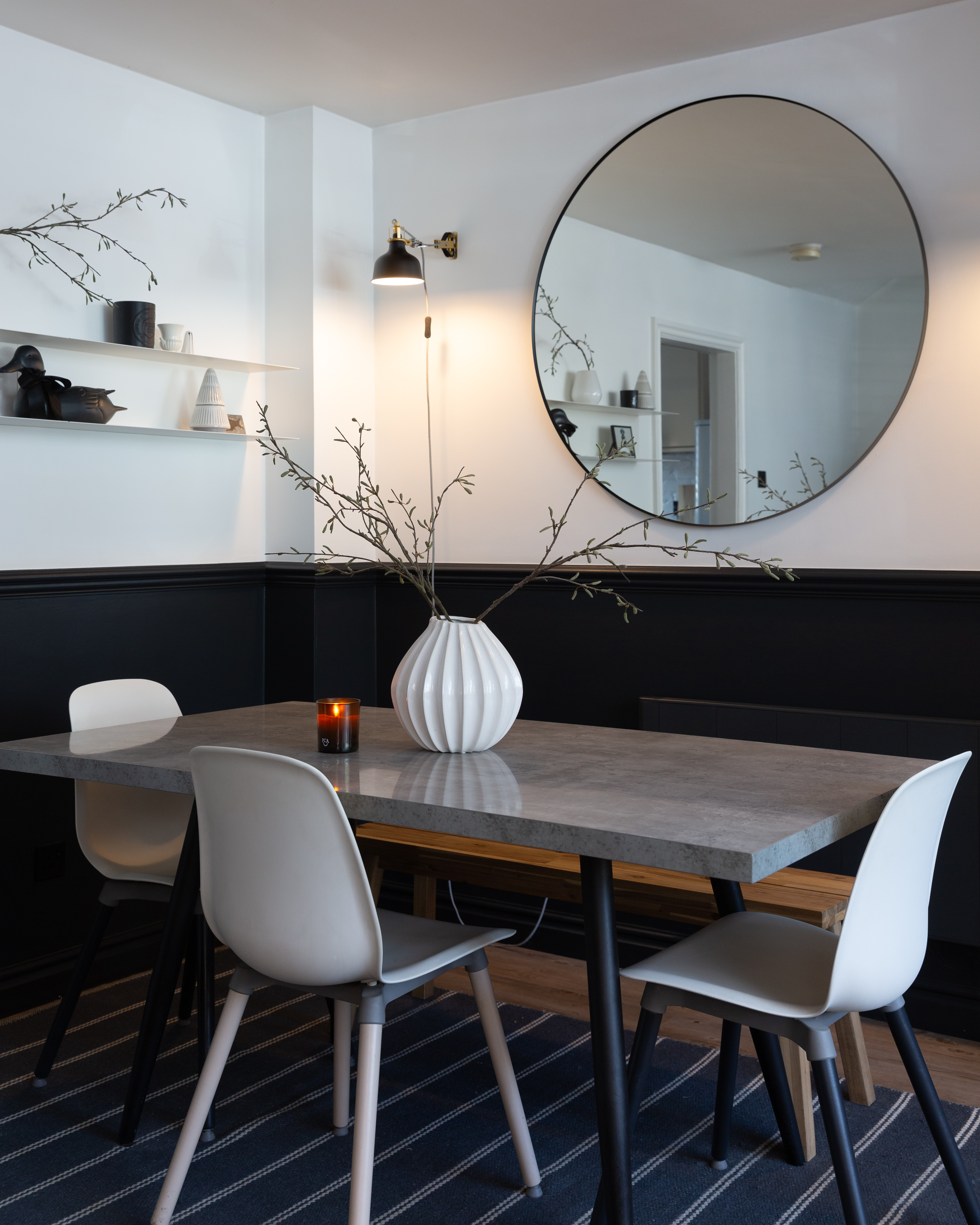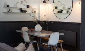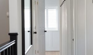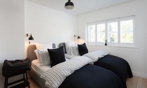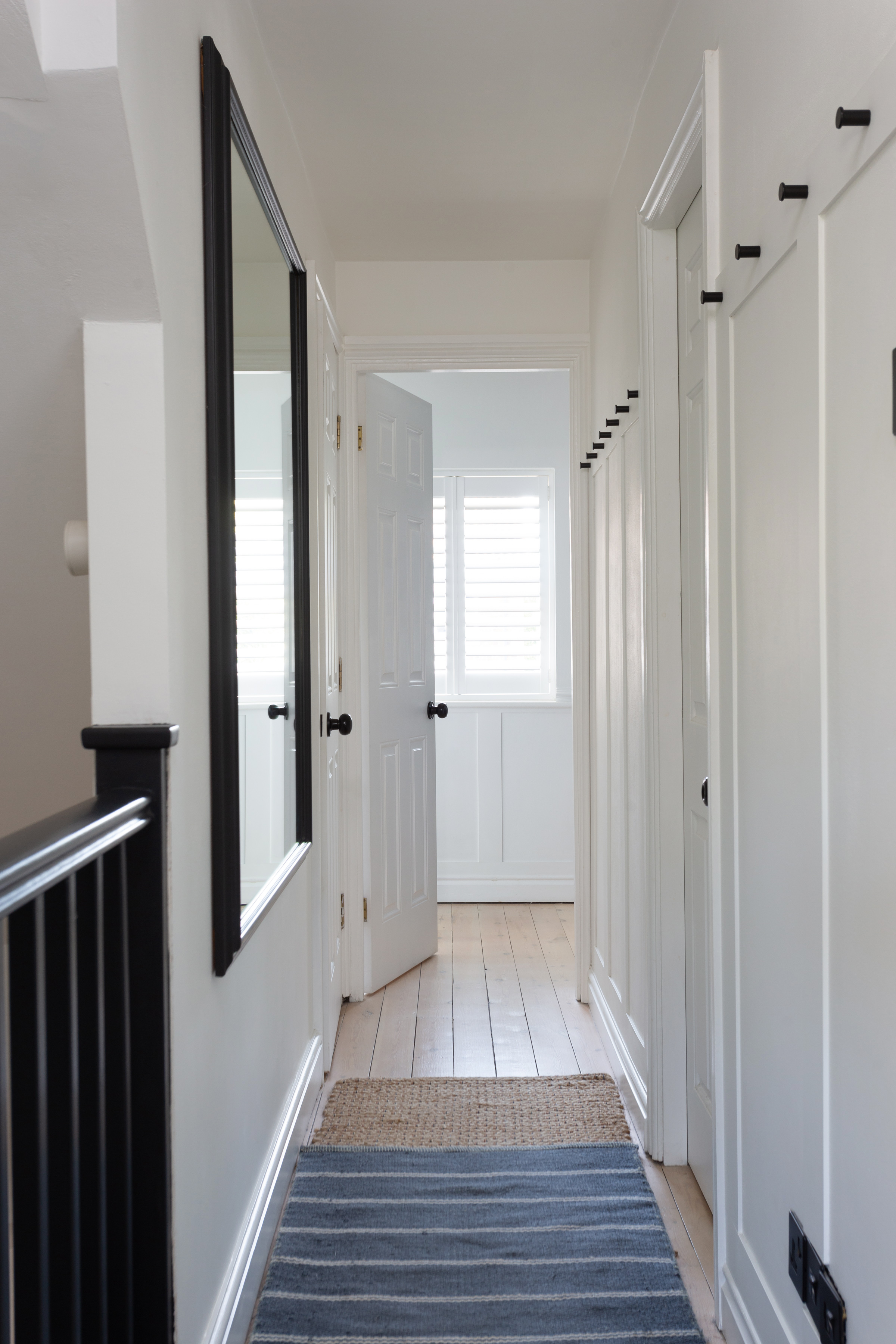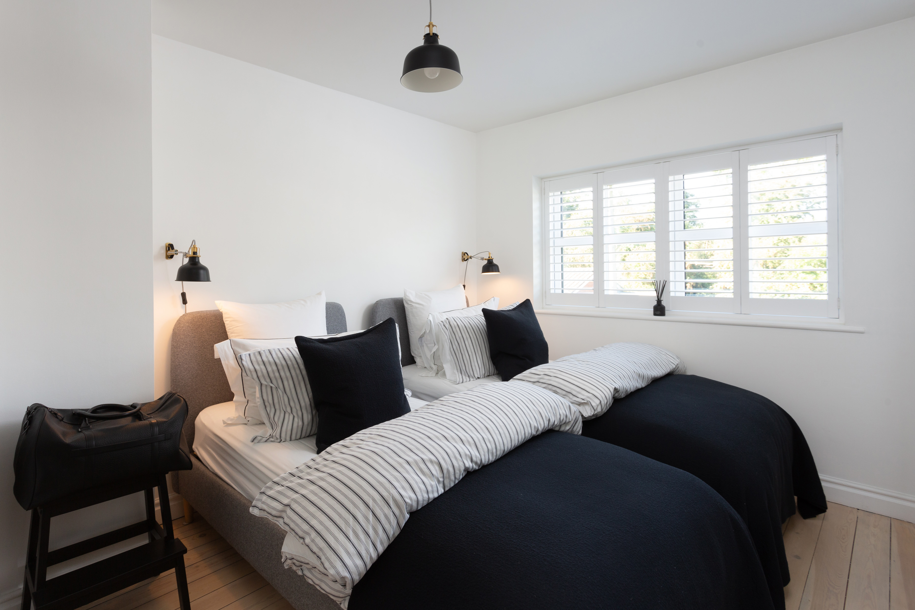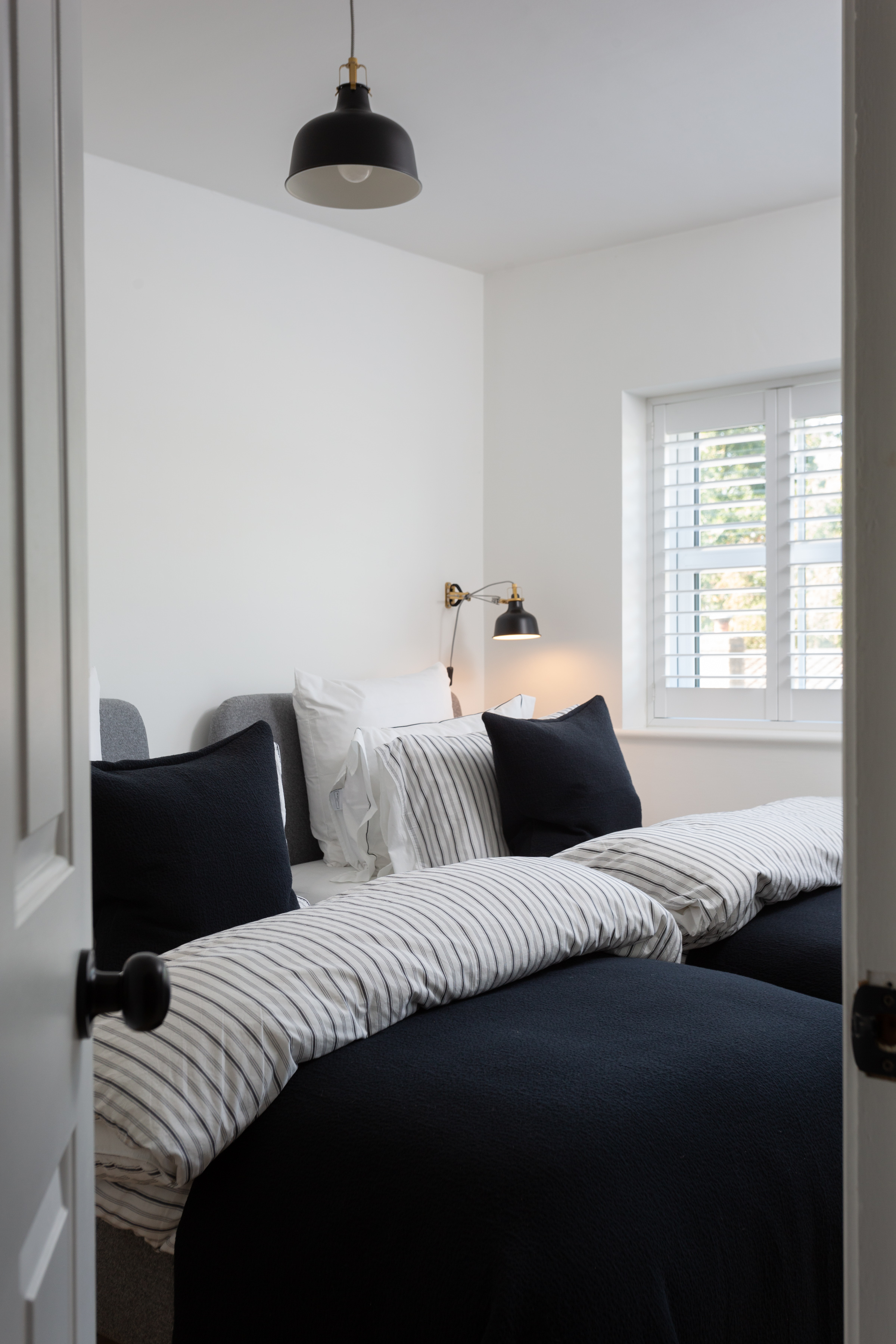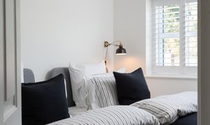 To the first floor, the original floorboards have been treated with Bona Nordic tones, adding a Scandi feel to the property. A generous double bedroom to the front elevation with white décor and plantation shutters in keeping with the rest of the property, offers ample space to accommodate two single beds, or a double, and a wardrobe to remain.