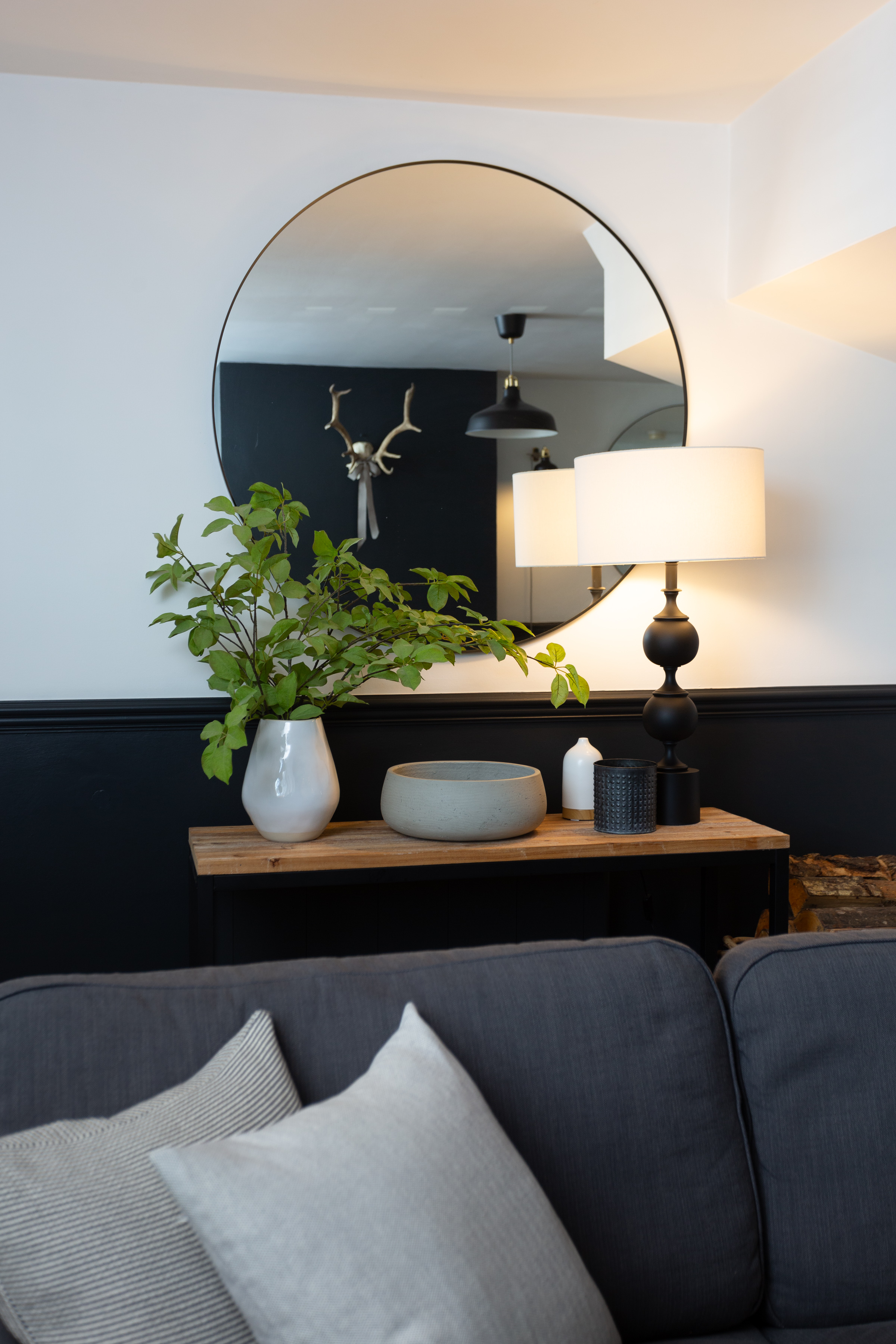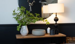 Behind an attractive dwarf wall topped with railings, a low maintenance gravel bed is dotted with mature shrubs and trees to add a splash of colour. A pathway leads to the ‘Anthracite’ composite door with a frosted glazed panel, illuminated with up and down lighters. Stepping inside the vestibule the colour scheme continues on the rear of the door and the panelled walls, coir cork matting is ideal for this high traffic area of the home and there is also hanging space for coats.