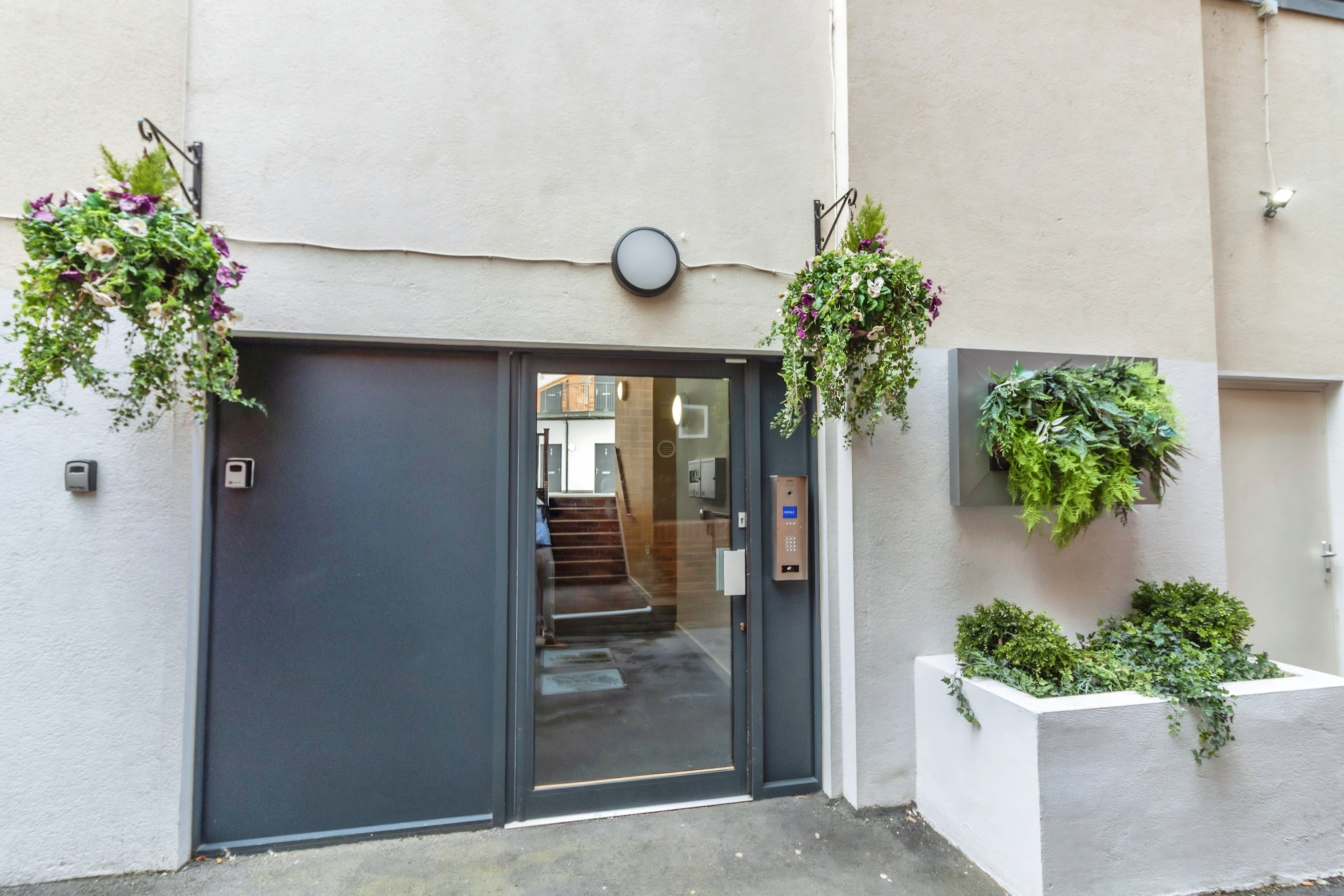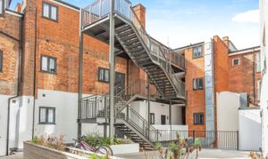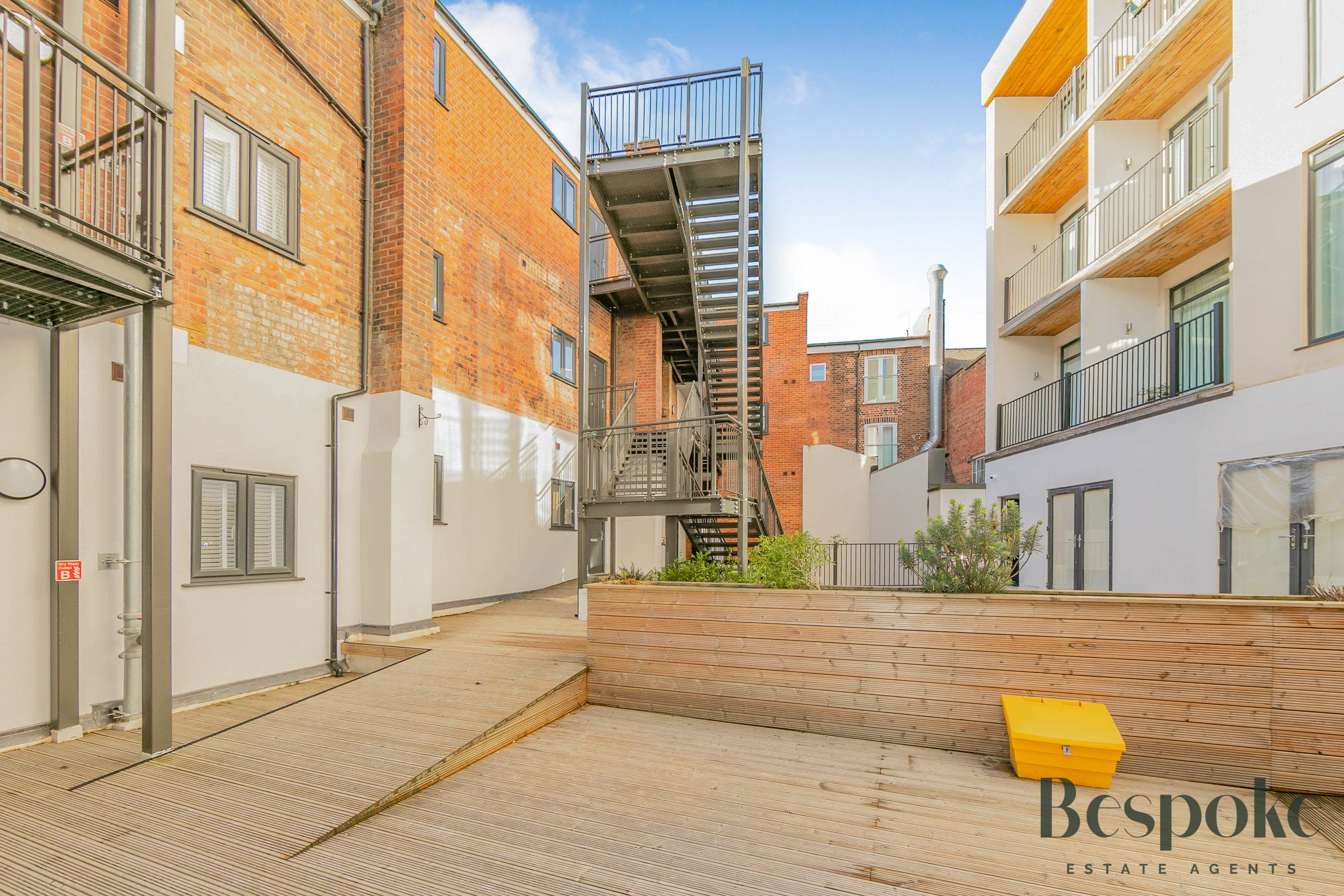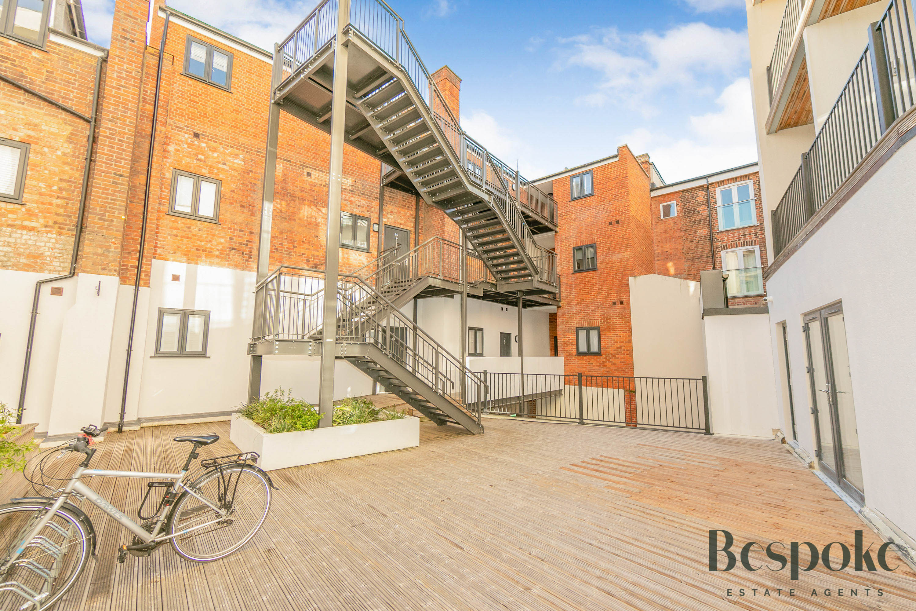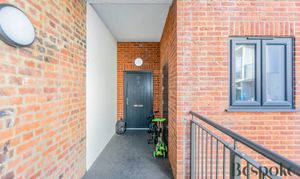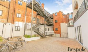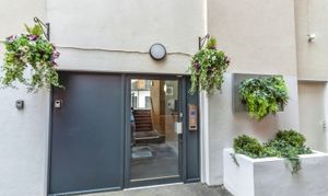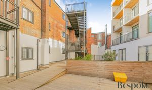 An enclosed, secure communal garden, accessed via intercom system to the main building. Mainly decked, with raised planters. Bicycle storage, stairs granting access to the apartments.