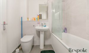 A modern fitted bathroom with enclosed bath, mixer taps with shower over, wash hand basin, W.C.