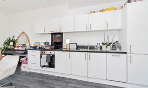 Open plan to living room, A modern fitted kitchen with a range of matching units, with built in over and hob, integrated dishwasher, integrated washing machine, integrated fridge and freezer.