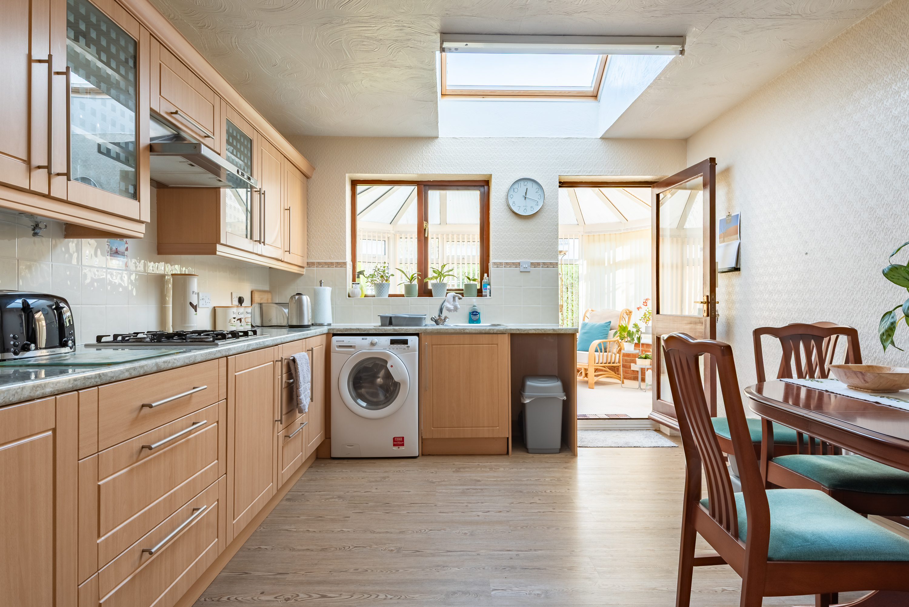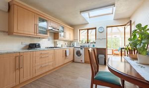 With laminate flooring, shaker style kitchen units, laminate worktops, integrated gas hob, and oven, extractor, plumbing for washing machine sink and tap, sky light, radiator, and door way into conservatory.