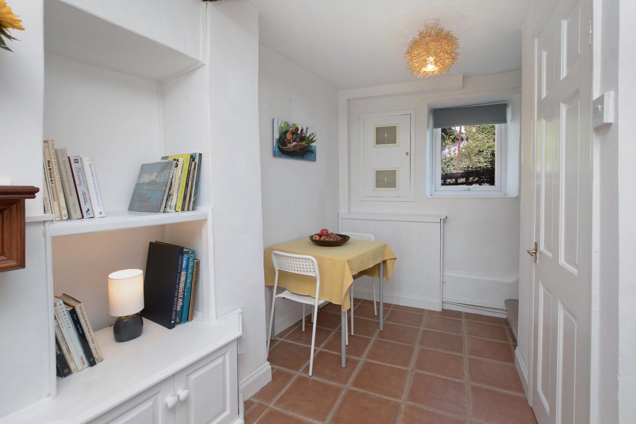 Doors lead into a cosy sitting room with a rear-facing window, built-in storage, and a charming display unit. The focal point is an open fireplace with a wood-burning stove set on a slate hearth. An under-stairs cupboard offers extra storage.