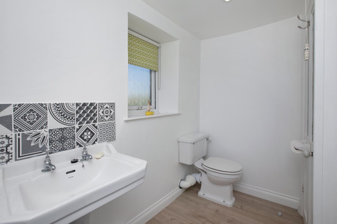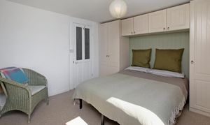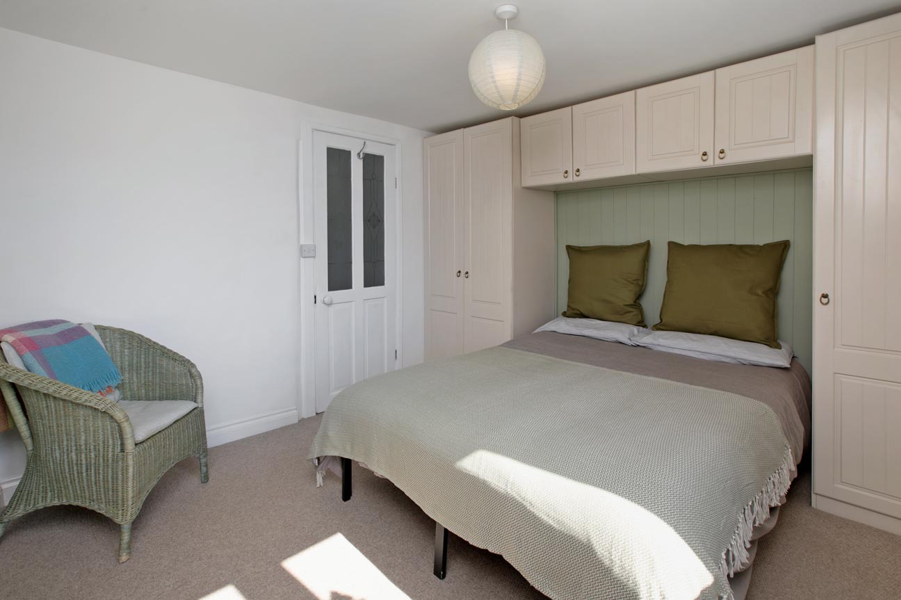 Upstairs is a spacious double bedroom with built-in furniture and lovely front-facing views. The large shower room includes a walk-in shower, pedestal basin, low-level W.C., and a heated towel rail.