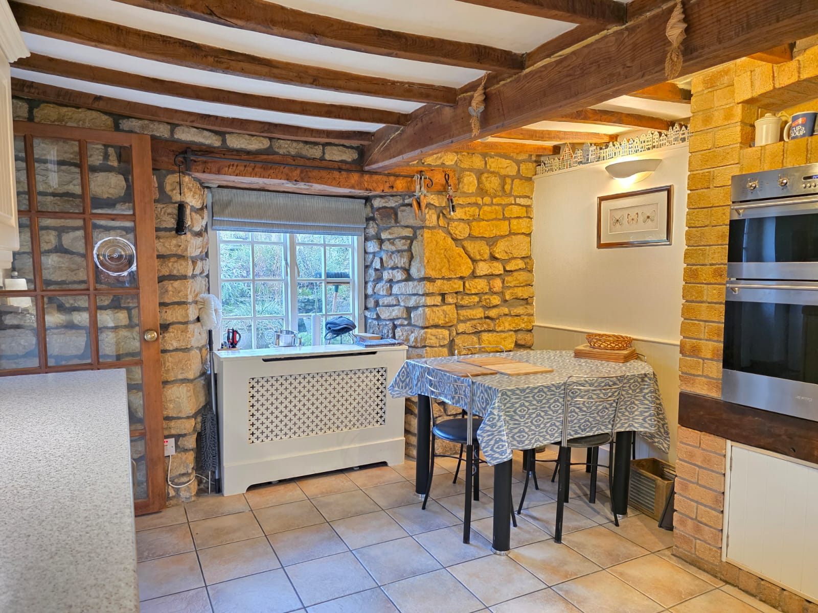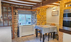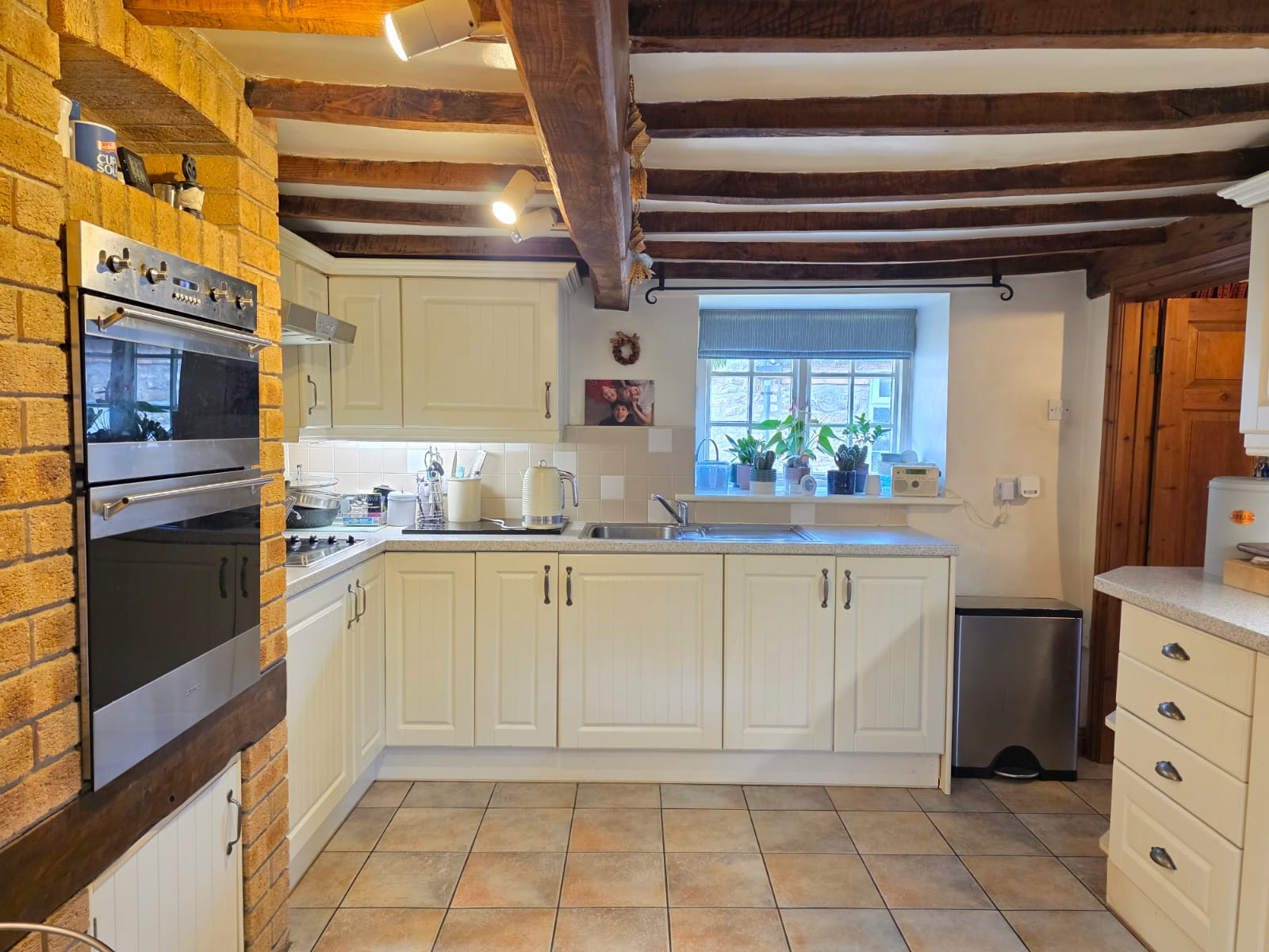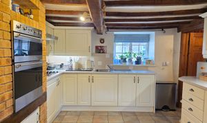 This includes space and plumbing for a washing machine and dishwasher, wall and larder units, worktop, tiled splashbacks, exposed beams and access out to the rear garden.
