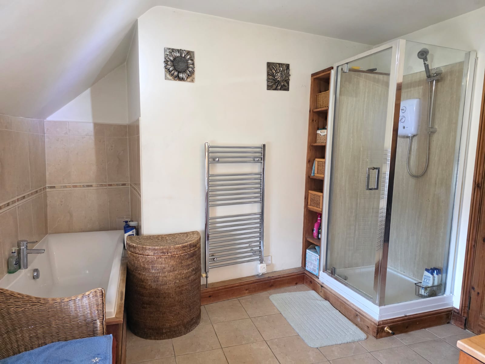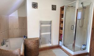 The spacious bathroom offers a 4 piece suite comprising of a walk-in shower cubicle, bath, low level flush WC, vanity unit with integrated sink & mixer, tiled flooring, chrome heated towel rail, part tiled walls, glazed window.