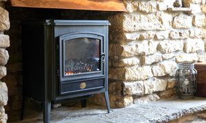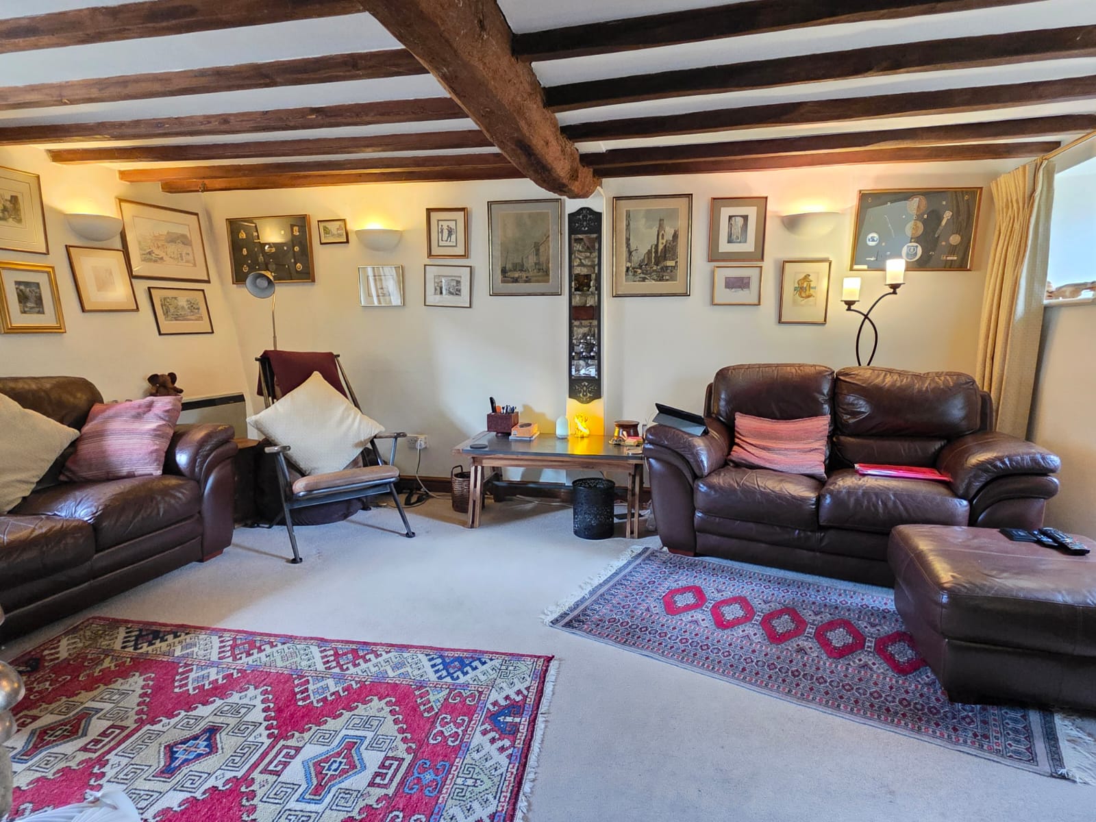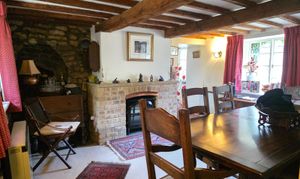 This characterful dining room offers a number of exposed beams and stone wall, fire place, carpet flooring, access to the stairway leading to first floor, two electric heaters and two glazed windows.