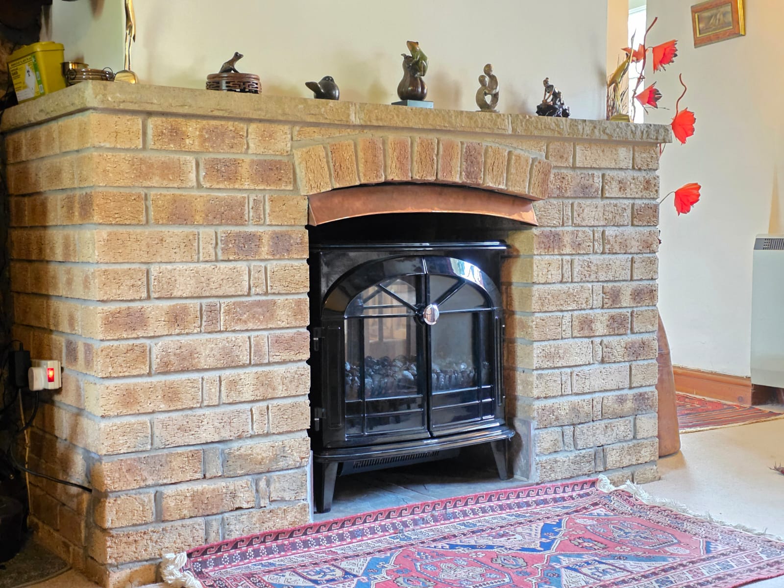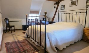 The second double bedroom has carpet flooring, vanity unit with integrated sink, exposed beams, electric heater, towel rail and glazed windows.