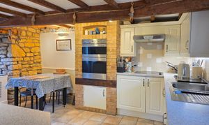 The kitchen includes a number of wall, base and drawer units with granite worktop, stainless steel sink and drainer unit with mixer tap, integrated fridge/freezer, eye level Smeg double oven and grill, electric hob with extractor hood over, two glazed windows with roller blinds, exposed beams, brick and stone work, tiled flooring, ample space for a breakfast table and access through into the utility room.