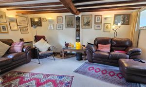 The cosy and private lounge offers carpet flooring, TV connectivity, exposed beams, exposed stone work forming part of the fire place, 3 glazed windows and door leading out to the rear garden.