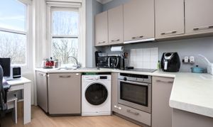 Upon entering, you are greeted by a large, welcoming lounge that sets the tone for the rest of the home. The room’s grand proportions and period features, including the original cornicing and high ceilings, create a sense of timeless elegance. The space is bright and airy, thanks to its large sash windows that overlook the picturesque street below, making it an ideal setting for both relaxation and entertaining.