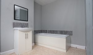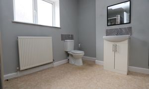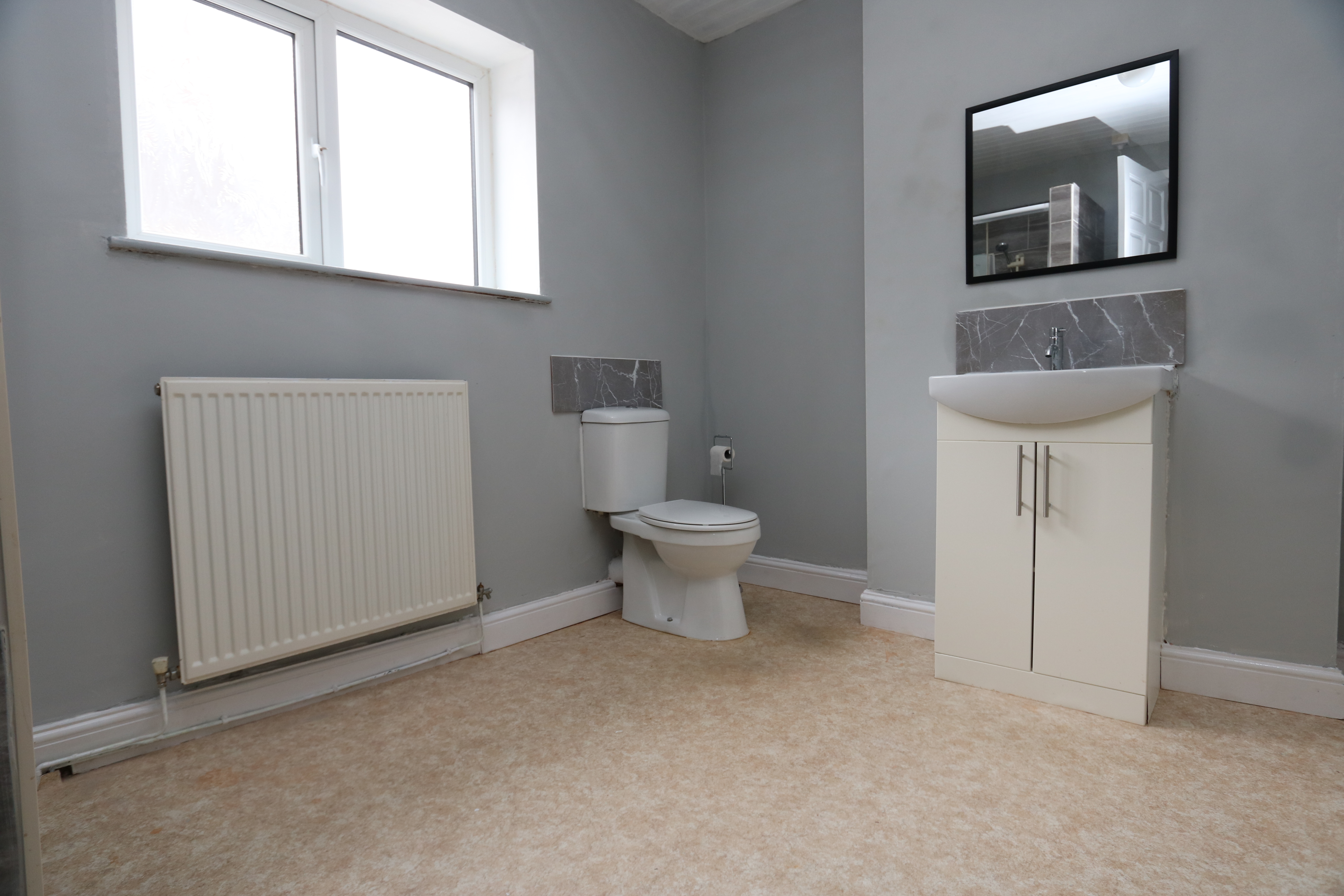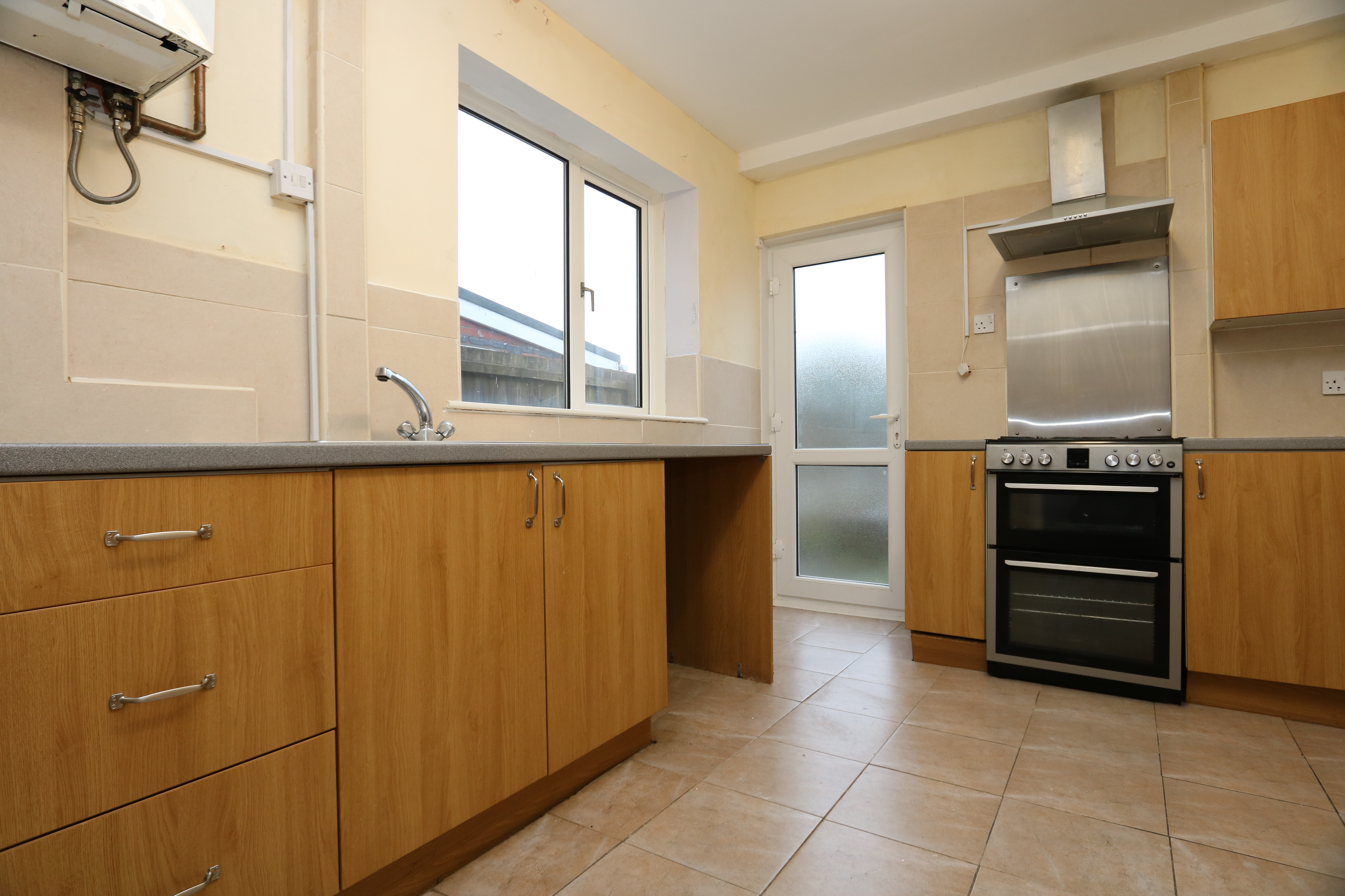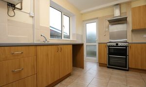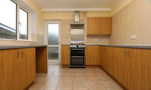 Tiled flooring, half-height wall tiling with the remainder of the walls being smooth and a smooth ceiling. The kitchen comprises a good range of matching wooden eye and base level units with complementing laminate work tops. There is a stainless steel sink inset with a stainless steel mixer tap over top. There is a freestanding oven with a stainless steel extractor hood overtop. Space and plumbing for a washing machine and space for a freestanding fridge/freezer. There is also a wall-mounted combi boiler, a side aspect window and a uPVC door with opaque glazing leading out into the garden.