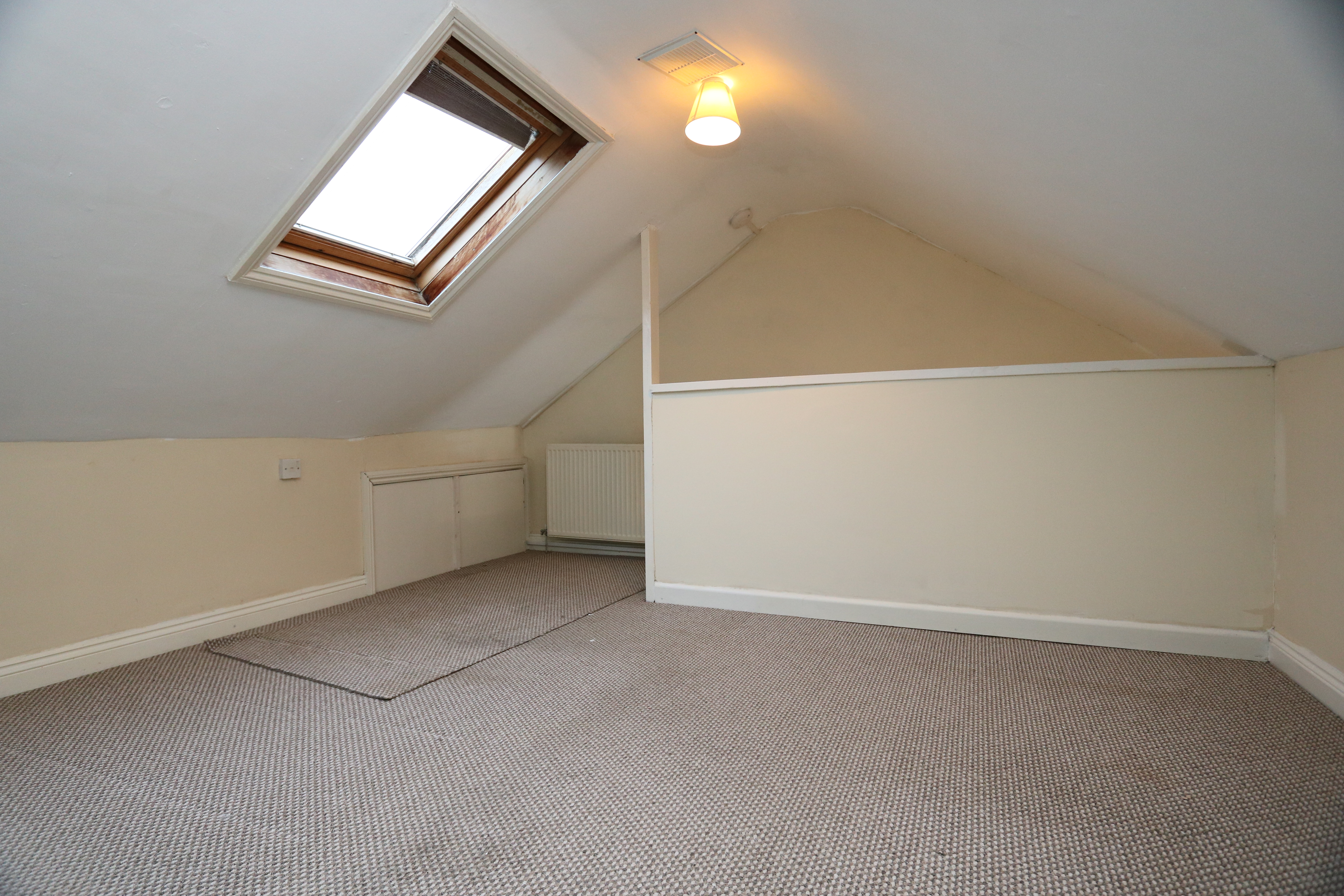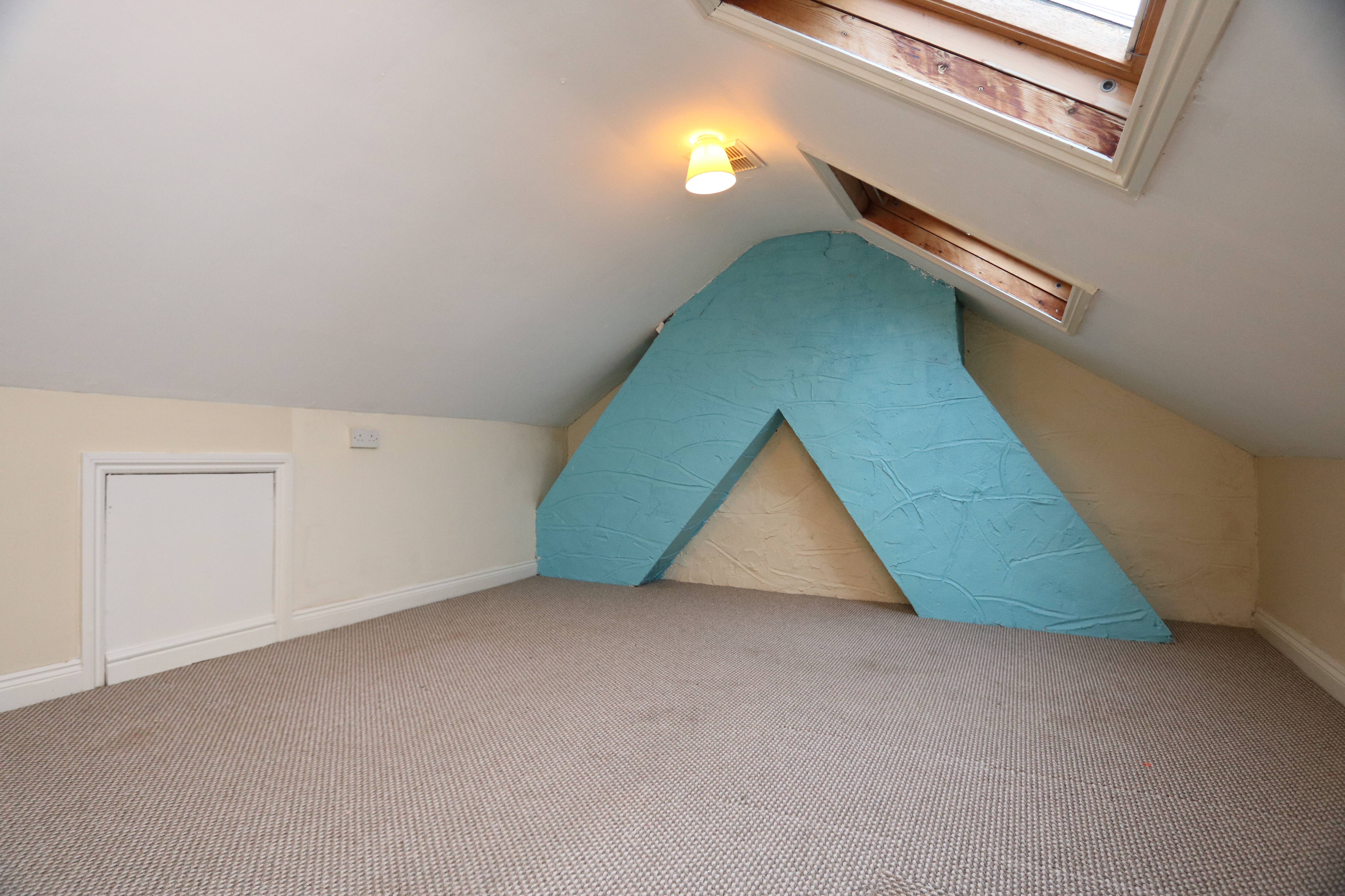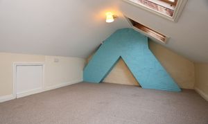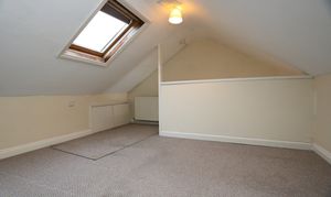 Carpeted with smooth walls and a smooth ceiling. There are doors giving access to storage in the eaves. Two Velux windows and a radiator.