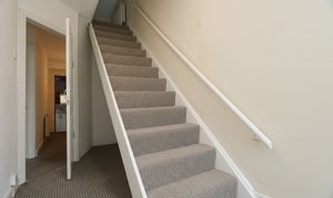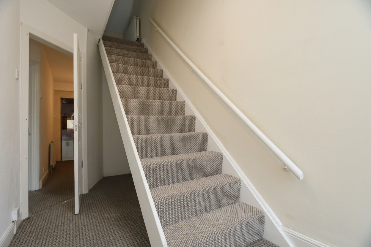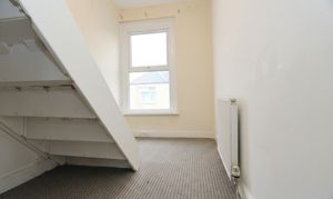Carpeted with smooth walls and a smooth ceiling. A radiator, a front aspect window and a carpeted staircase giving access to the loft room.