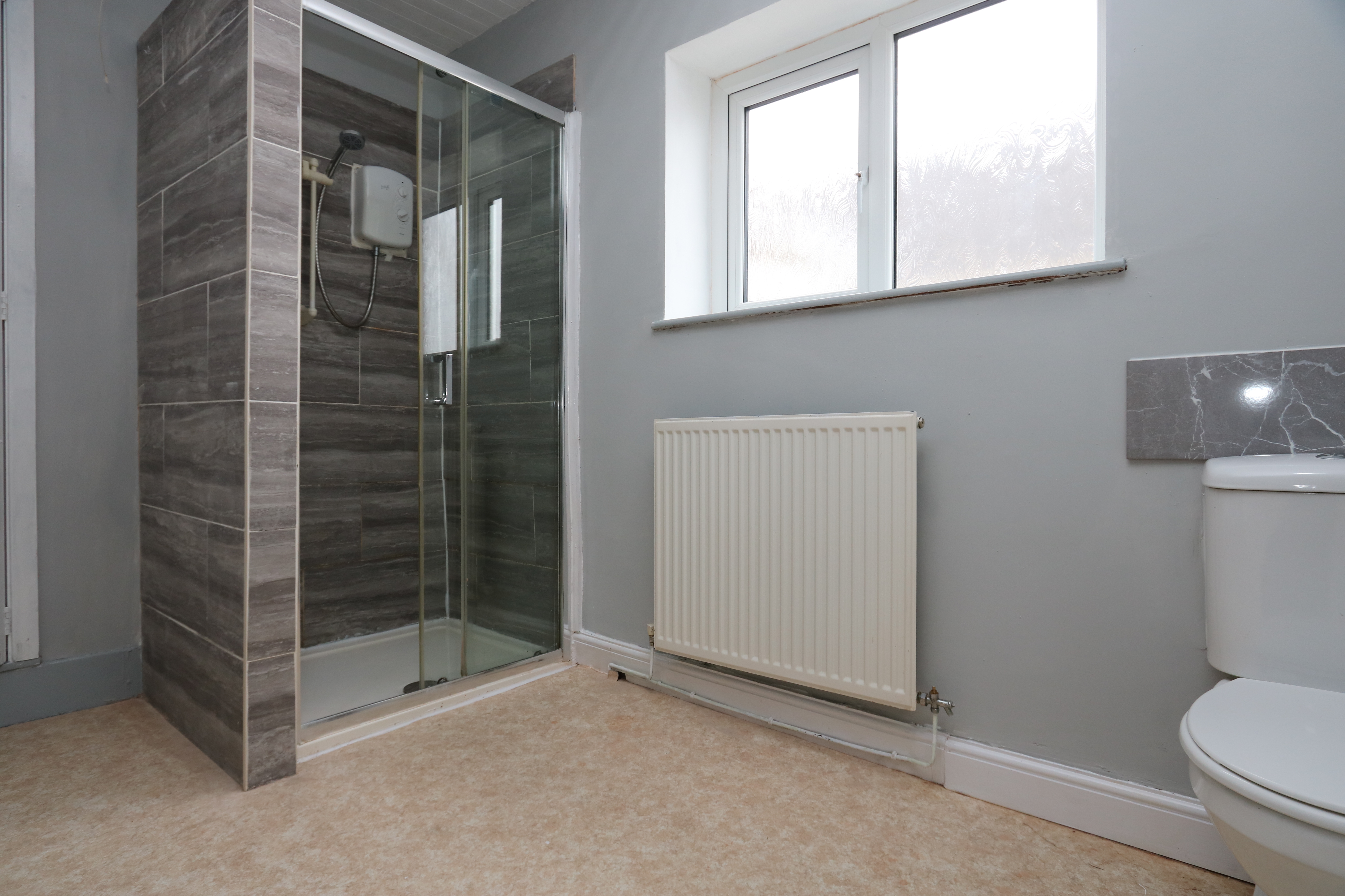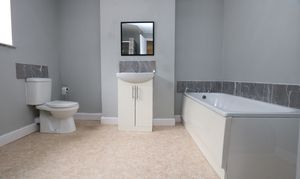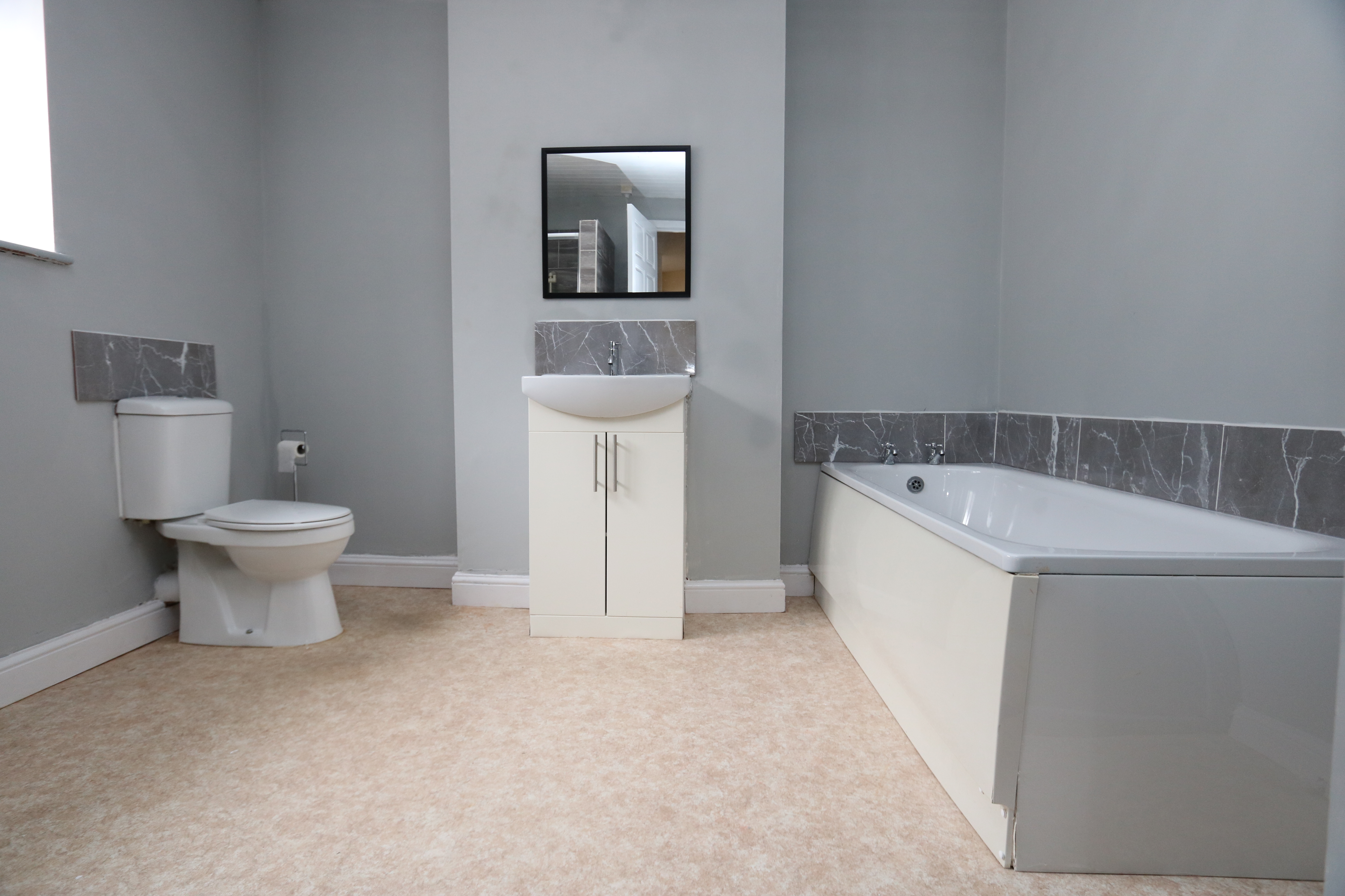 Vinyl flooring, smooth walls and ceiling. A four-piece white suite comprising a WC with a push button flush, a vanity wash basin with a stainless steel mixer tap over top, a bath with stainless steel pillar taps over top and a walk-in shower cubicle with an electric shower inset and a glass sliding shower screen. There is also a double opening storage cupboard, a radiator and an opaque side aspect window.